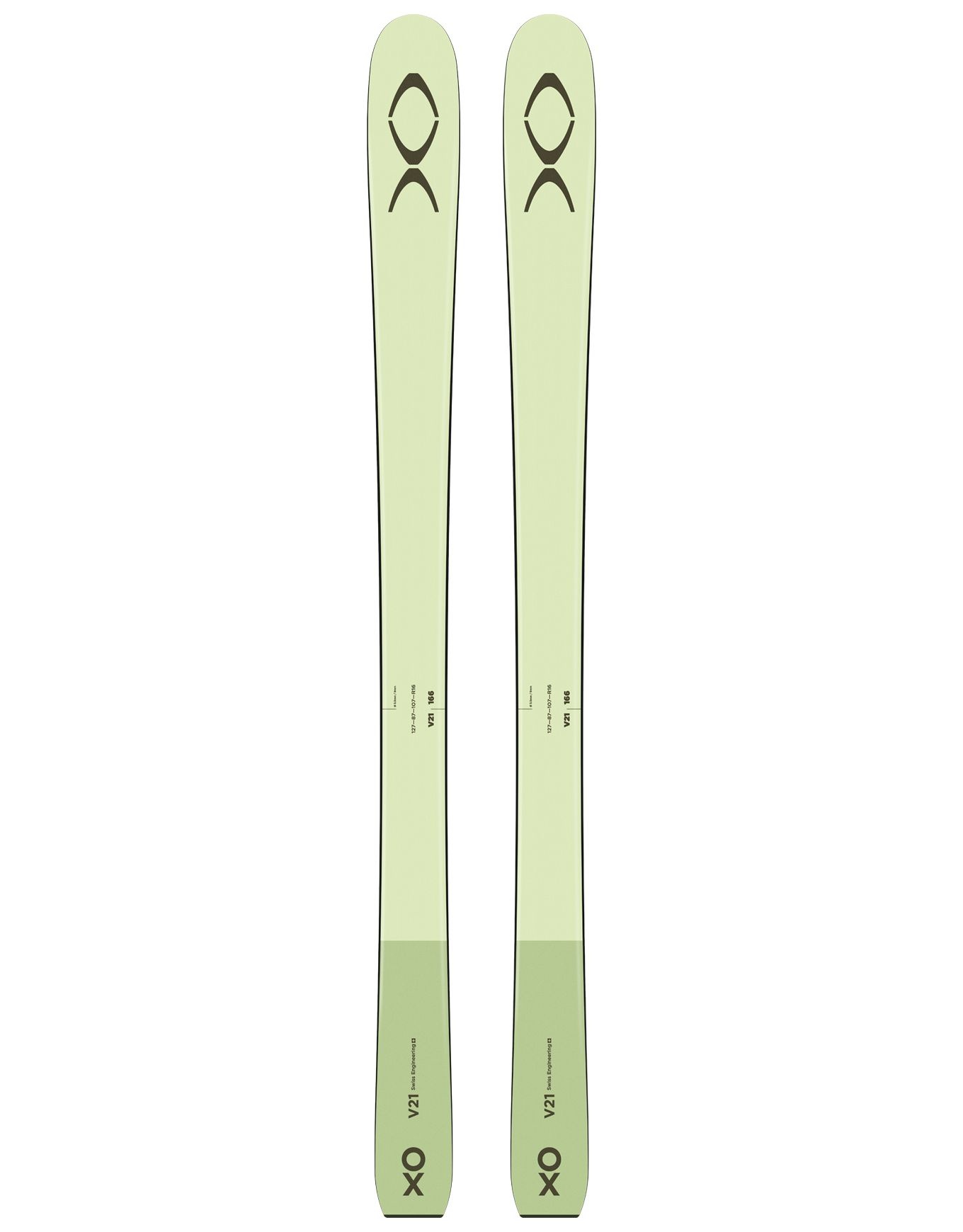 XO V21 2025 Green Tea Tuscany Olive, ski free-carve tout-terrain par XO Skis, allie légèreté et performance grâce à un noyau bois/poplar-paulownia, double rocker et semelle Premium haute densité. Maniable sur piste, flottant en poudreuse, il répond aux exigences du freeride comme du freerando.