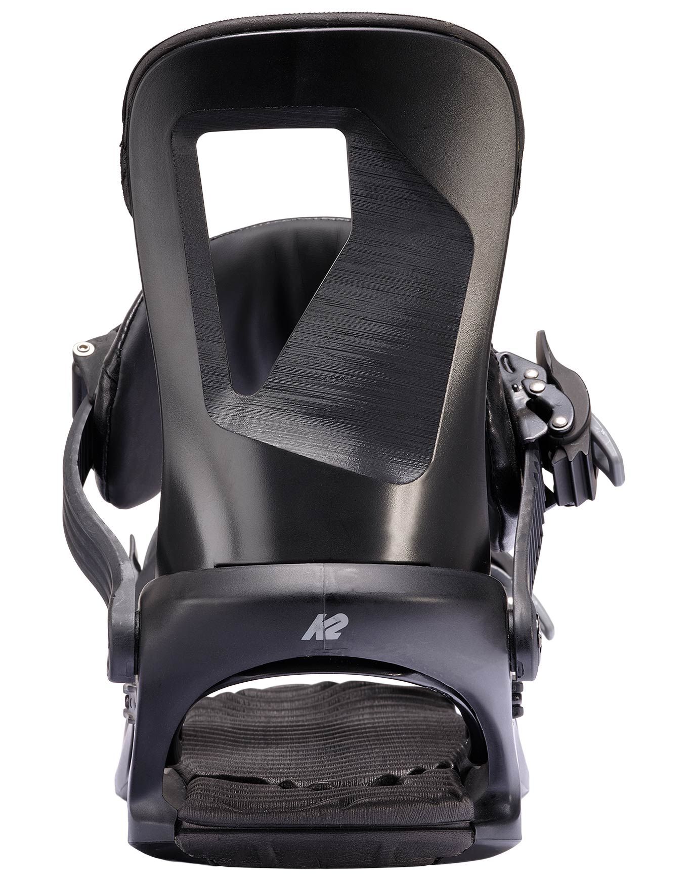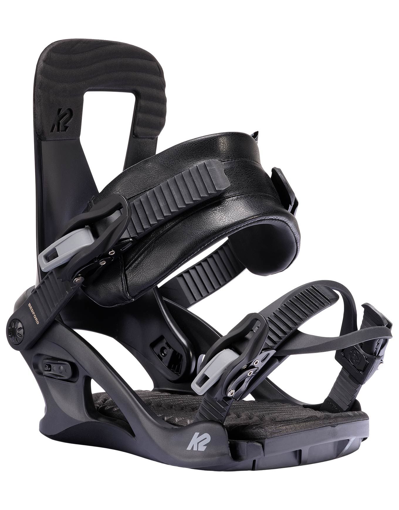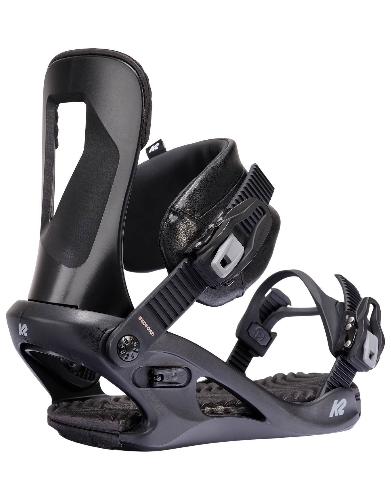 Fixation de snowboard K2 Bedford Black pour homme, idéale débutants et intermédiaires. Réglages sans outils, embase A-Line légère, spoilers tolérants AT Polycarbonate, technologie 3° Canted pour moins de fatigue, strap Custom Caddi™ et amorti EVA au talon.