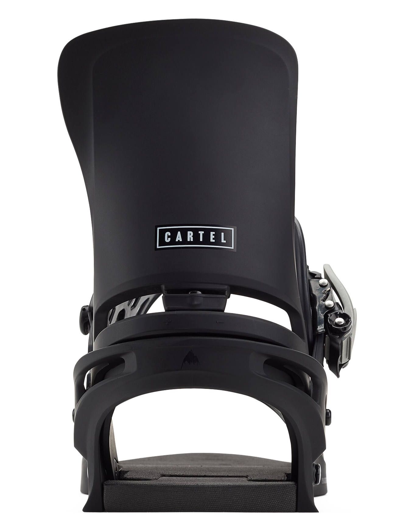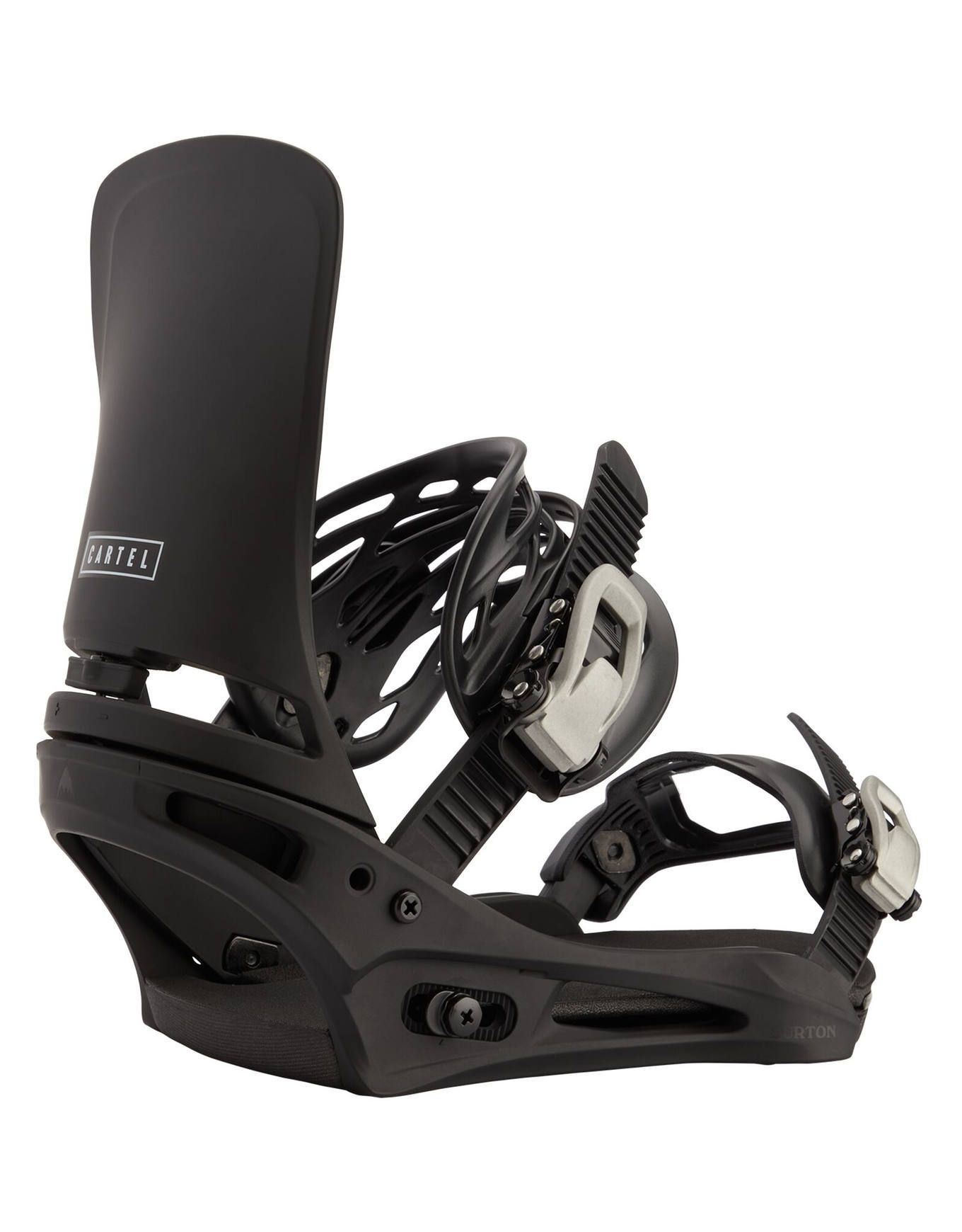 Fixation snowboard homme Burton Cartel Black, all mountain confirmé : flex medium 6/10, straps Hammockstrap 2.0, Zero Forward Lean et amorti ferme pour réponse précise sur tout terrain.