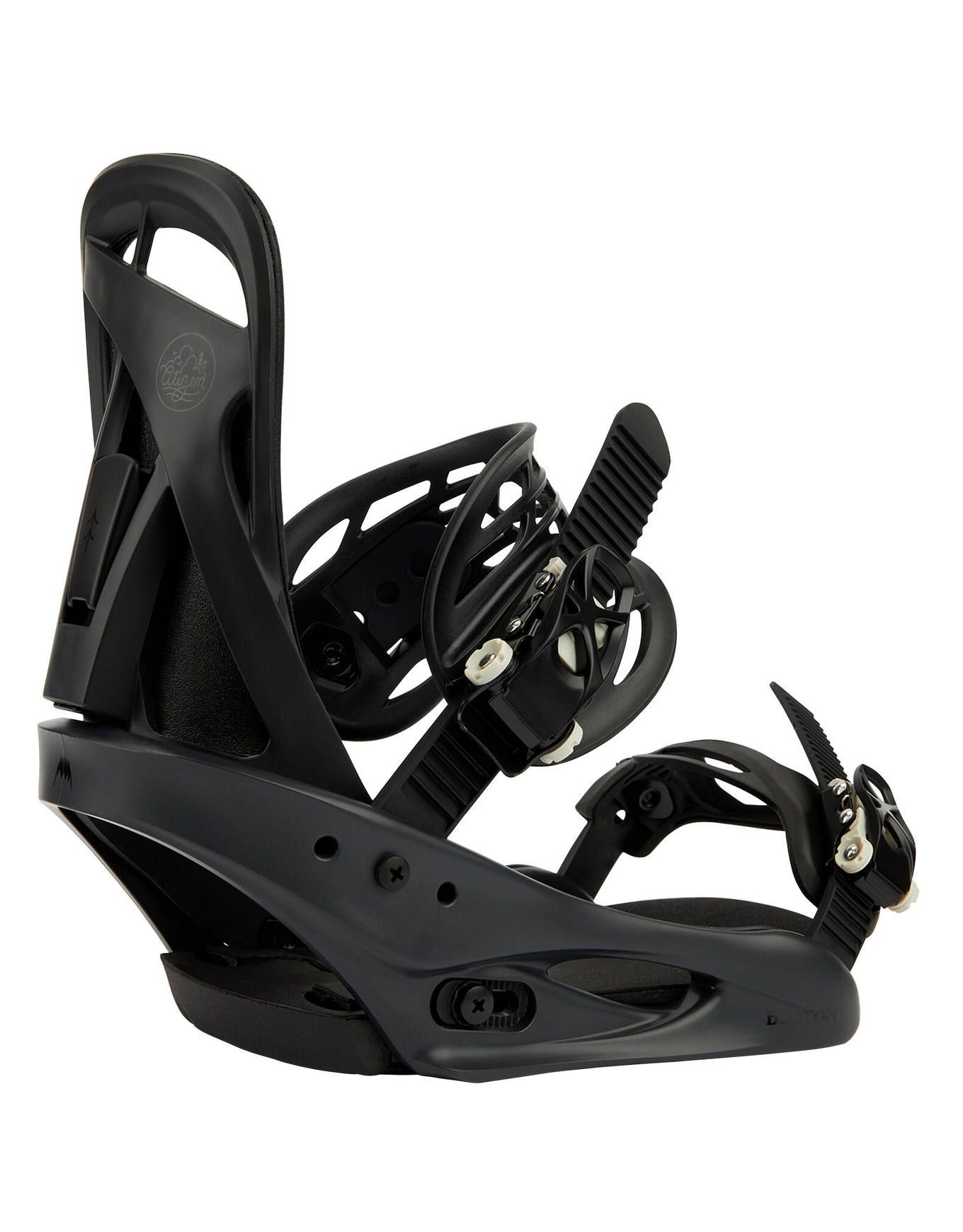 Fixations de snowboard femme Burton Citizen Black, all-mountain débutantes : embase polycarbonate légère et résistante, amorti FullBED, réglage MicroFLAD, maintien précis pour progresser tout l’hiver.