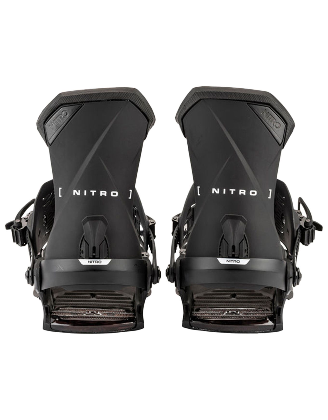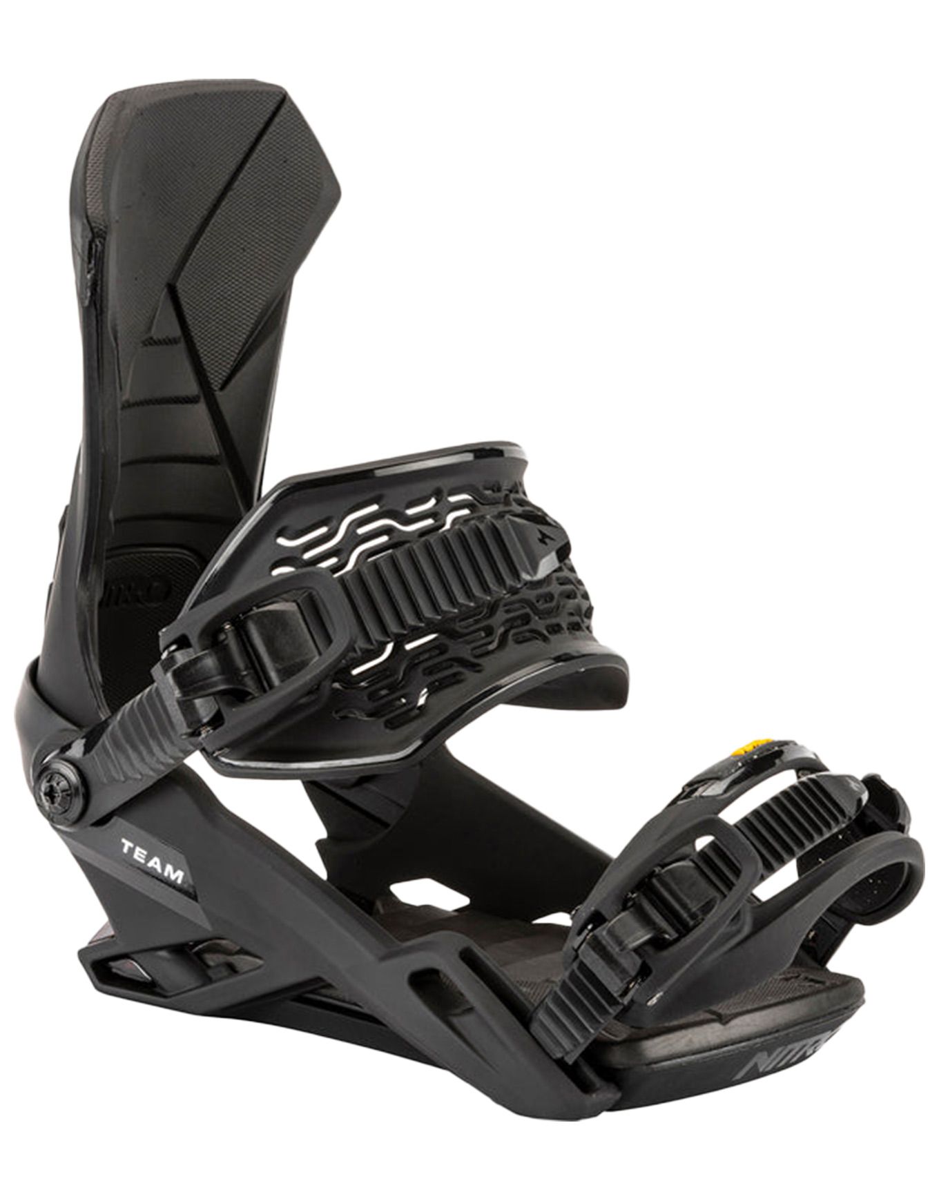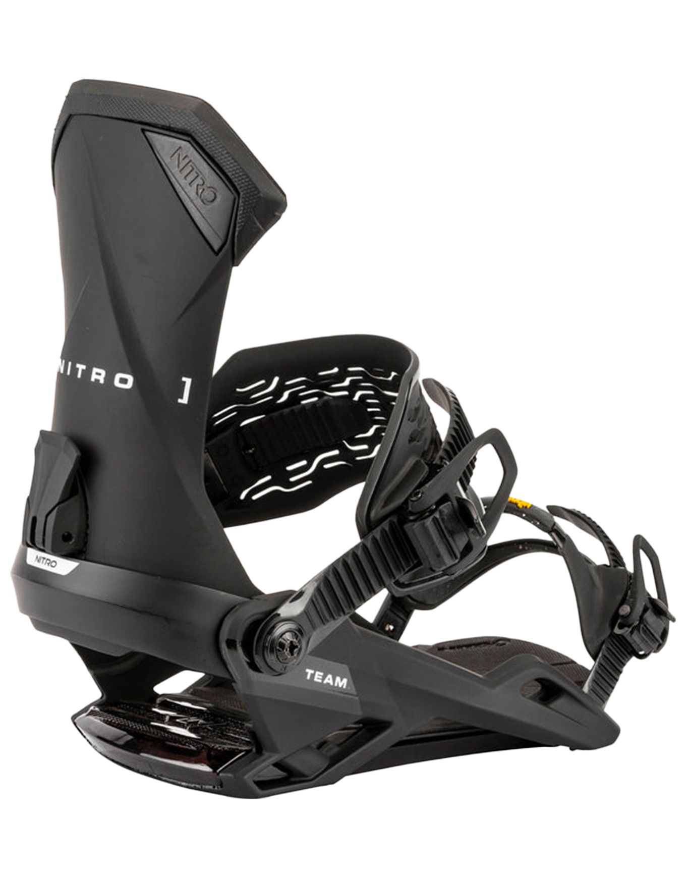 Fixation snowboard Nitro Team Ultra Black polyvalente pour rider intermédiaire : straps 3D Optiframe, amorti Air Dampening, embase Stealth Air légère, spoiler Jet Highback asymétrique et Mini Disc pour flex naturel.