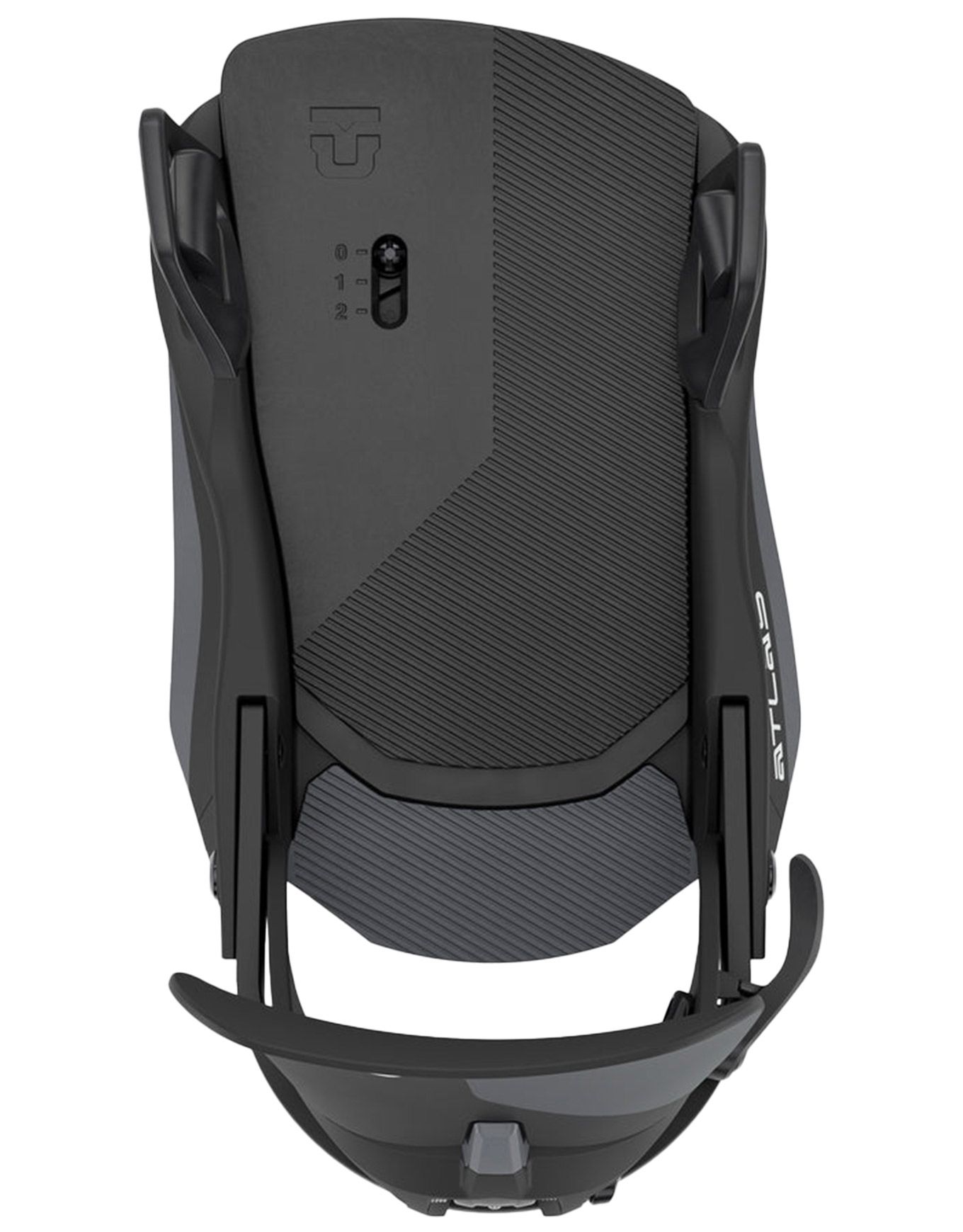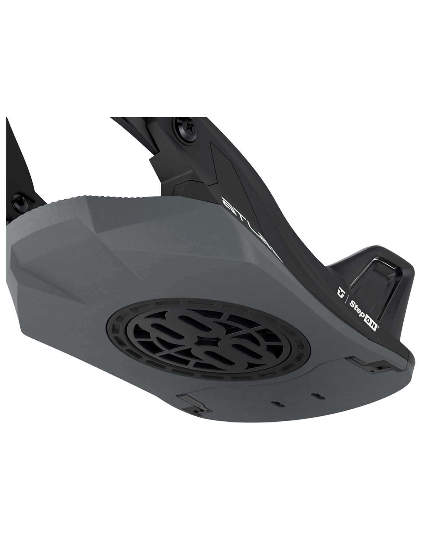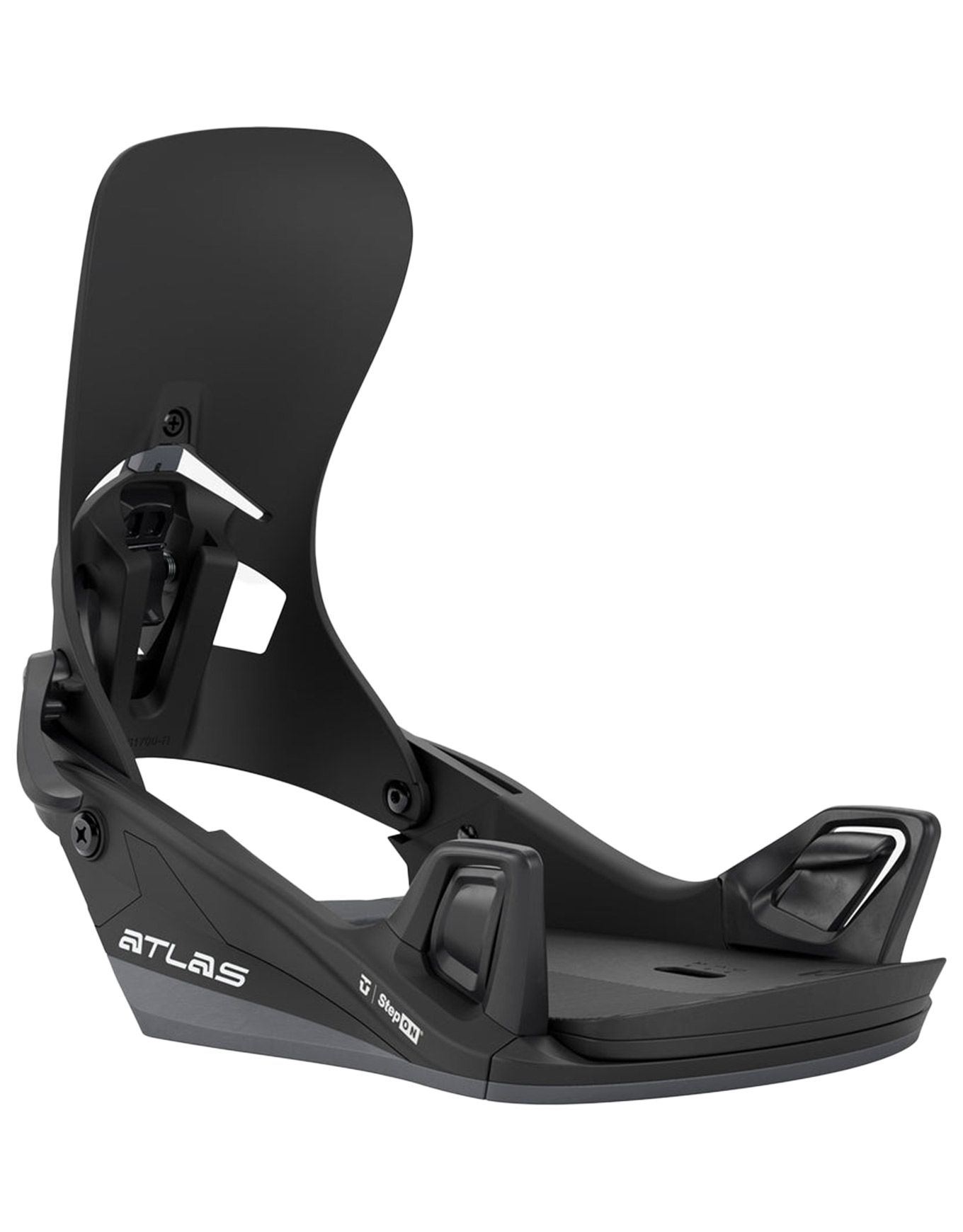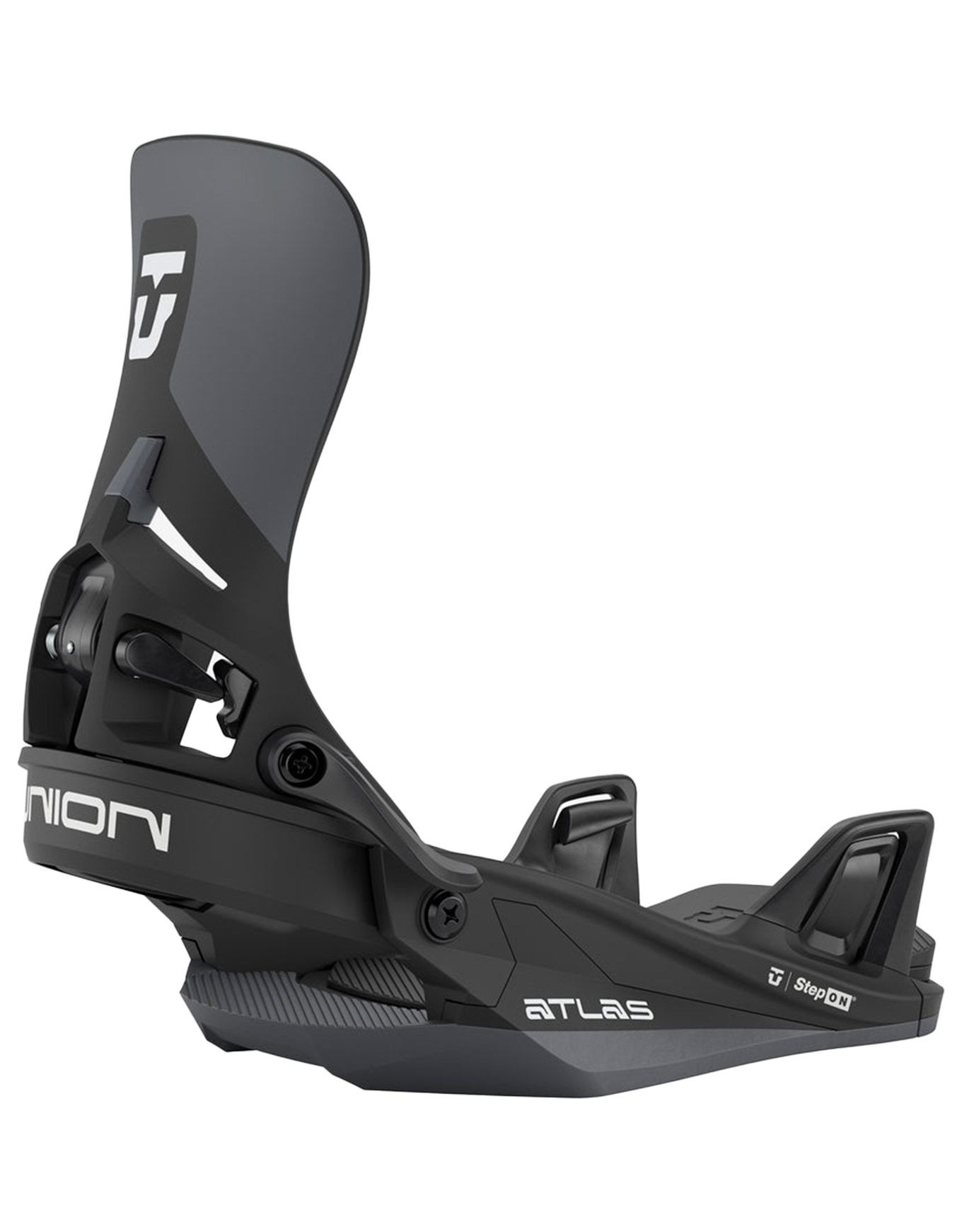 Fixation snowboard Atlas Step On Black Union, système Step On® Instant Connection™ pour enclenchement rapide talon en premier et libération via levier talon, spoiler Step On® Duraflex réglable, inserts Hi-Flex EVA amortissants, performance et confort sur tous terrains.