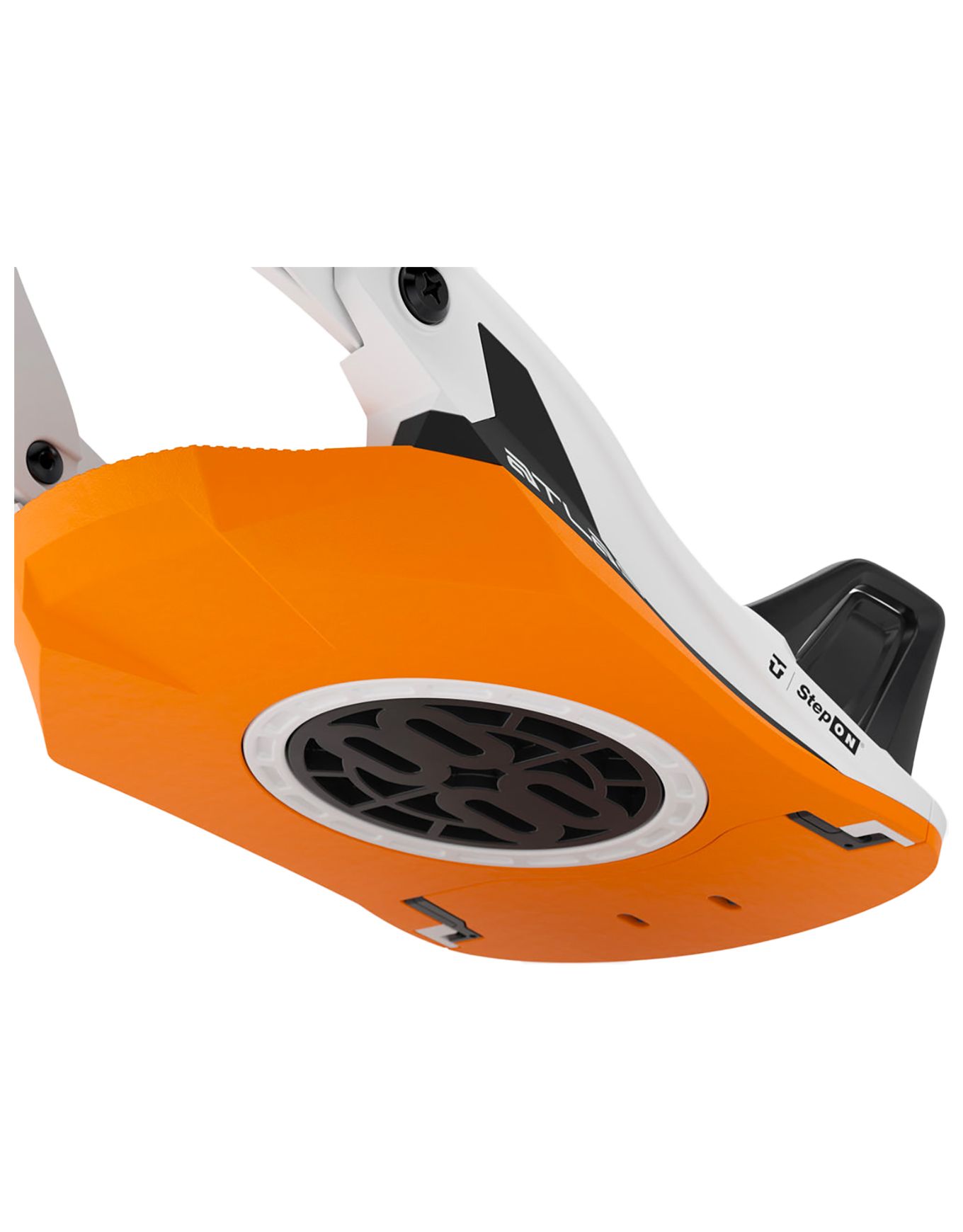 Union Atlas Step On White Orange : fixation snowboard homme au système Step On® Instant Connection™ pour enclenchement rapide talon-en-premier, spoiler Duraflex réglable et inserts Hi-Flex EVA absorbant les vibrations.