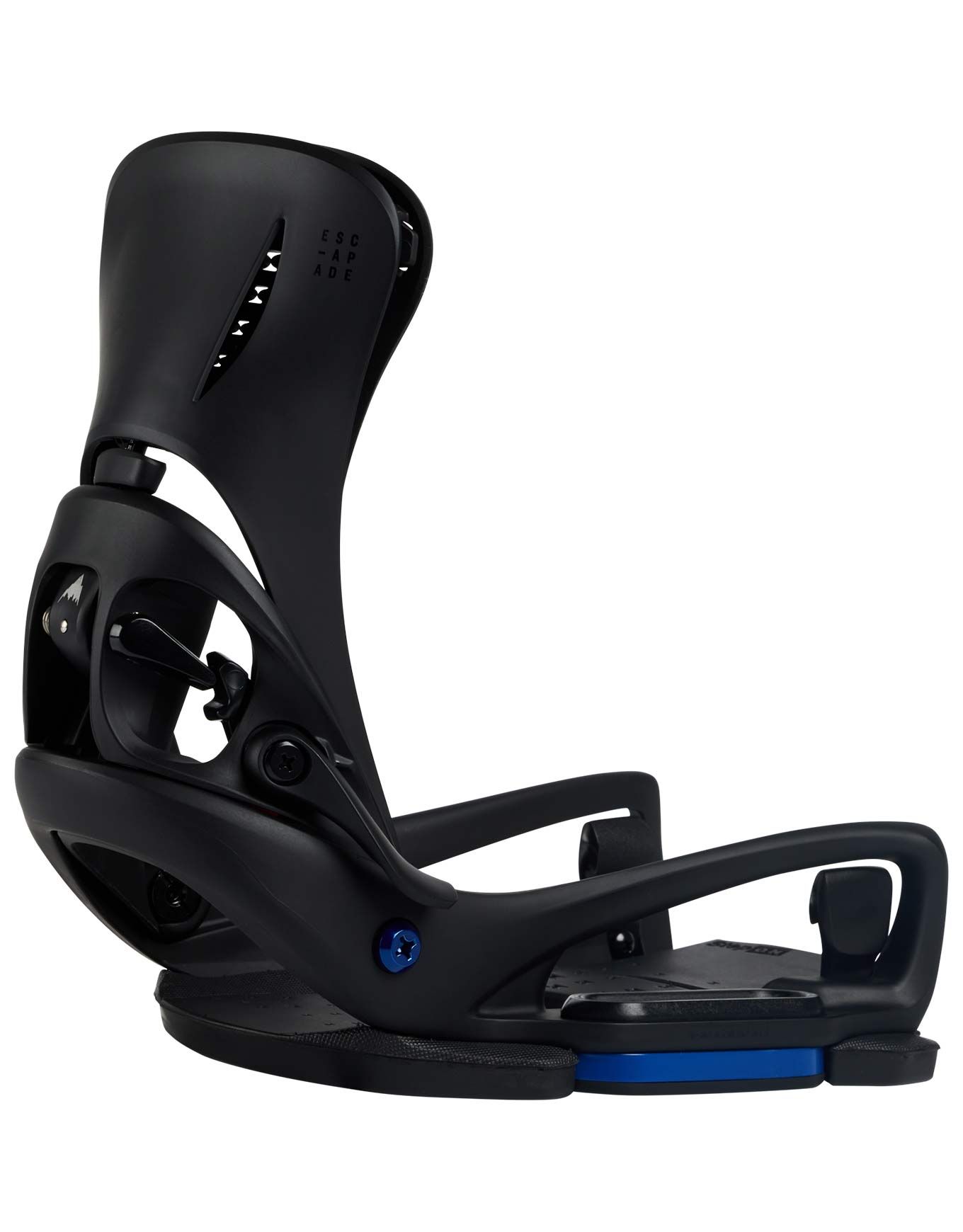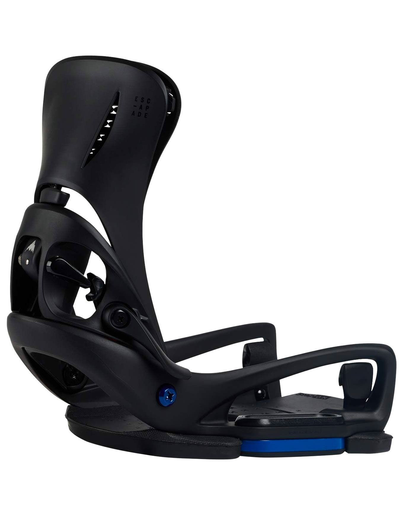 Fixations snowboard Burton Escapade EST Step On Black pour femme intermédiaire/confirmé, fixation sans straps via trois ergots, montage EST sans visserie sous le pied, semelle amortissante, spoiler Kickback Hammock pour plus de souplesse et de confort, réglage d’angle DialFLAD, compatible Channel.