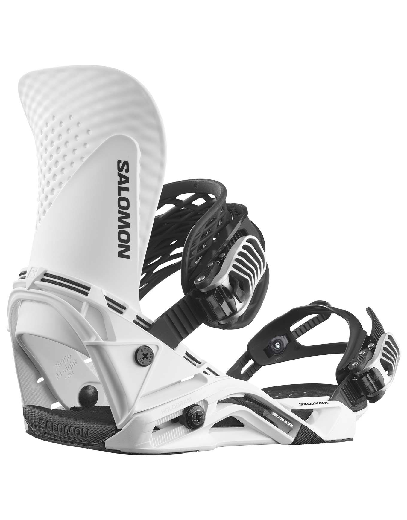 La fixation de snowboard Salomon Hologram White, 100 % freestyle, allie réactivité maximale grâce au Strap Power lite et Kevlar® Quickwire, fit ultraprécis Ultra-Fit, amorti Full EVA Supreme et transmission directe via la semelle Response pour rider confirmé en park ou rue.