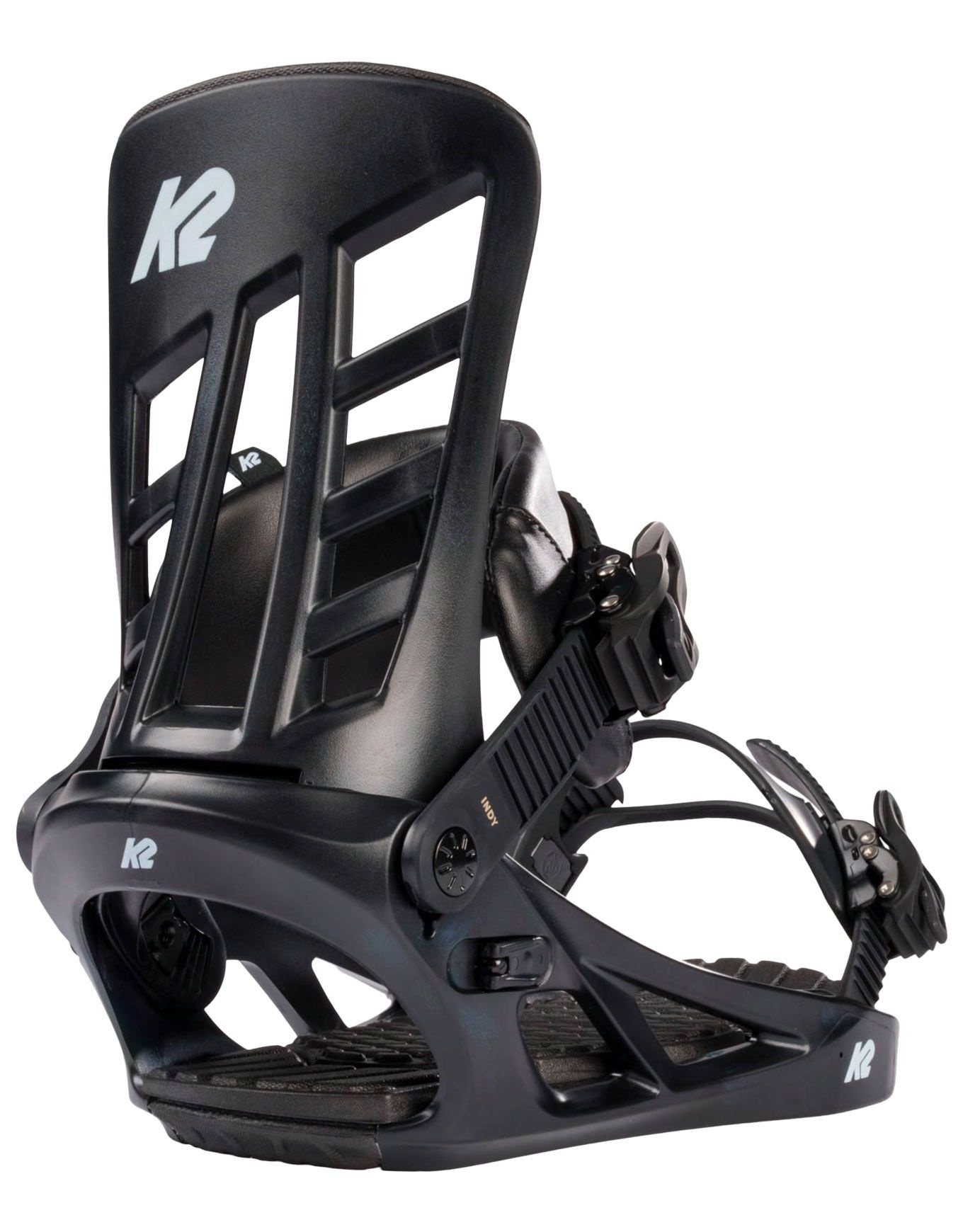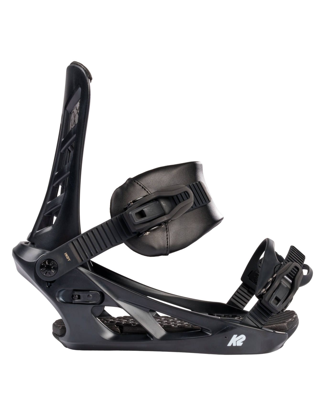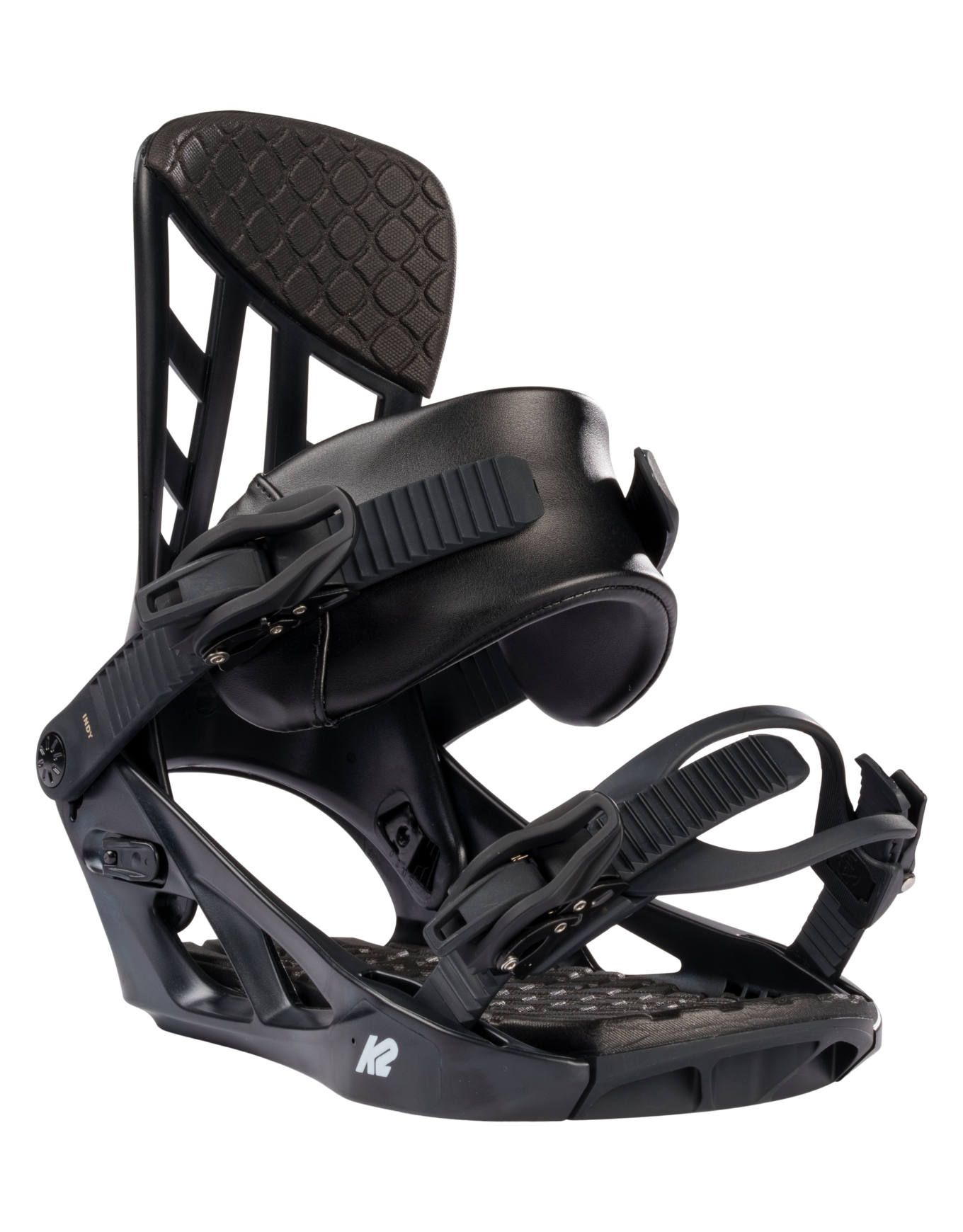 La fixation de snowboard K2 Indy Black pour homme offre un réglage sans outil, spoiler ajustable freestyle/carving, châssis Nylon Pro-Fusion™ léger, semelle 3° Canted et strap Custom Caddi™ confortable pour débutants polyvalents.