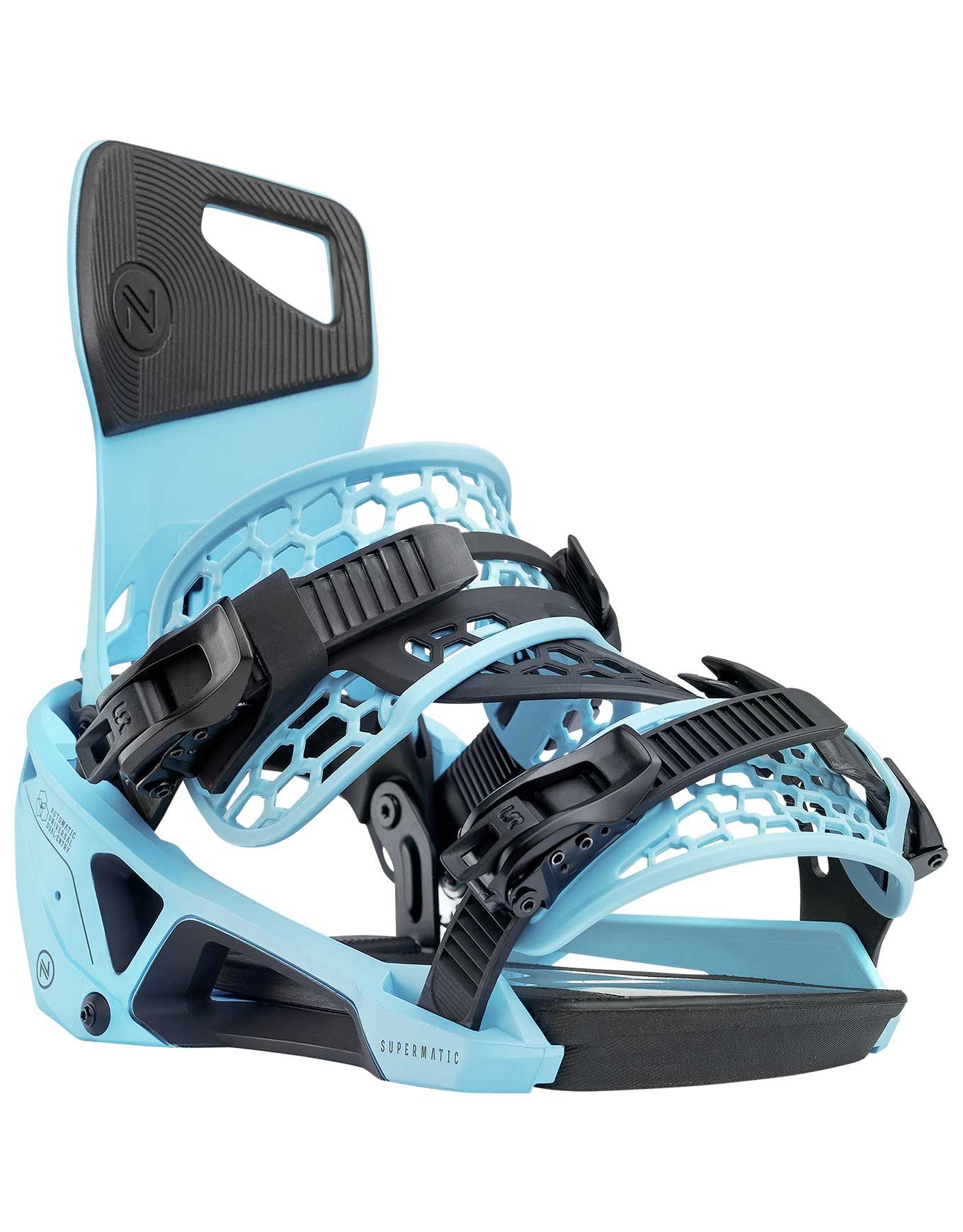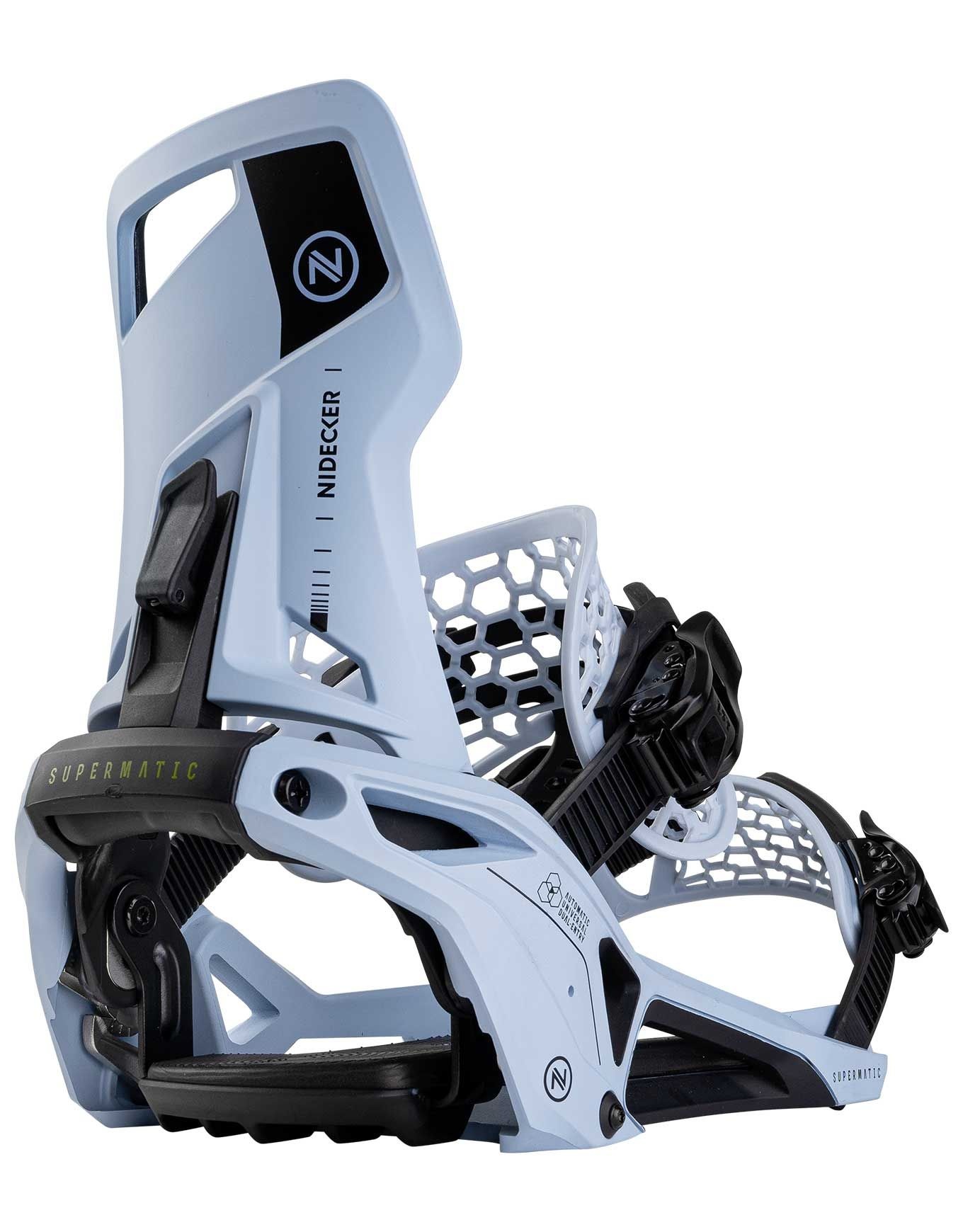 Fixation automatique Nidecker Supermatic Cannon Blue, double entrée sans plier, Drop-In Tech brevetée pour chausser instantanément, straps Exoframe/Hexo Toecap, embase nylon Asym Rocked Matic-Series et spoiler Hadron : confort, réactivité, compatibilité boots universelles.