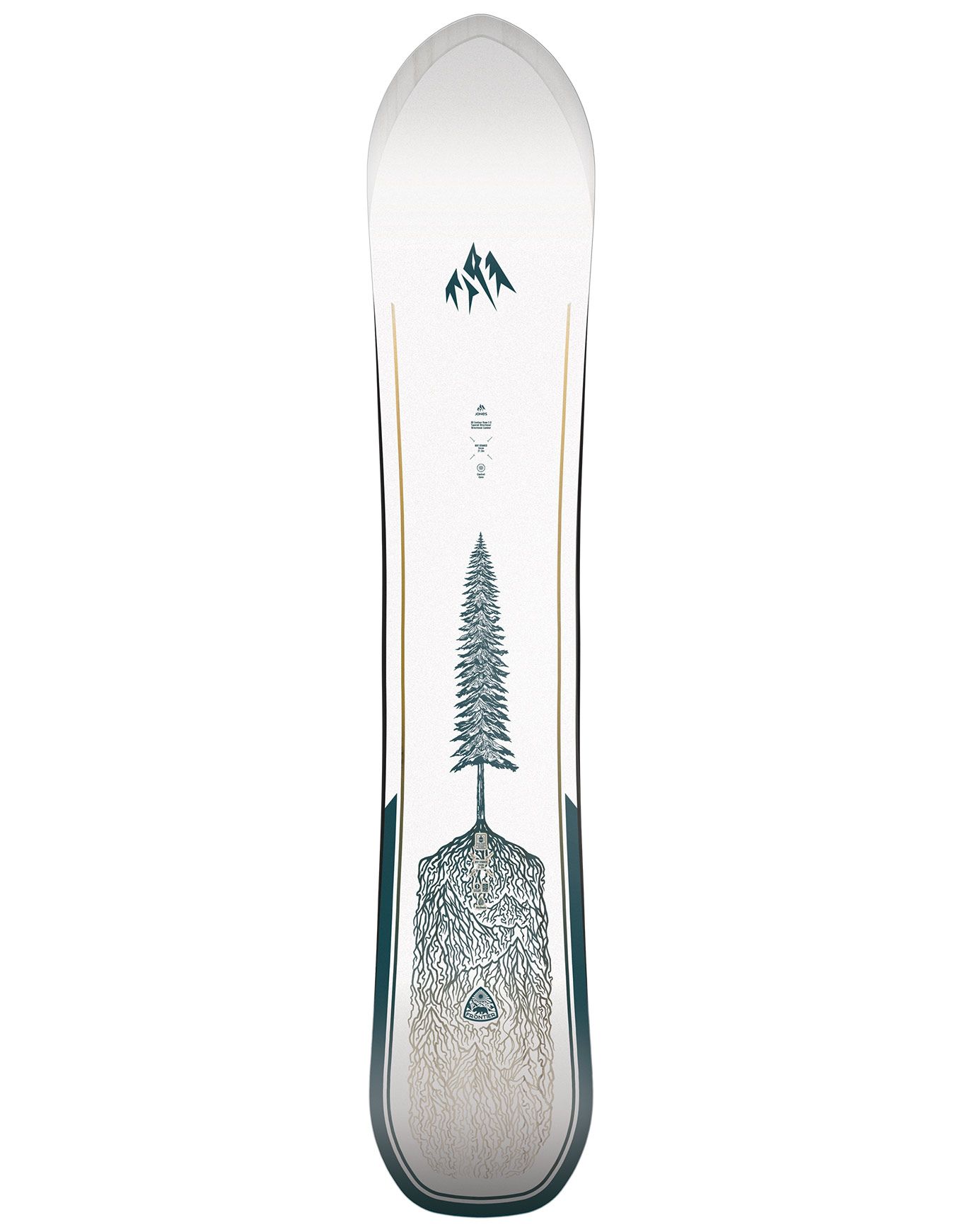 Jones Frontier 2.0 2026, snowboard all-mountain/freeride à shape directionnel, double rocker et base 3D Contour pour flottaison, maniabilité et accroche polyvalentes.