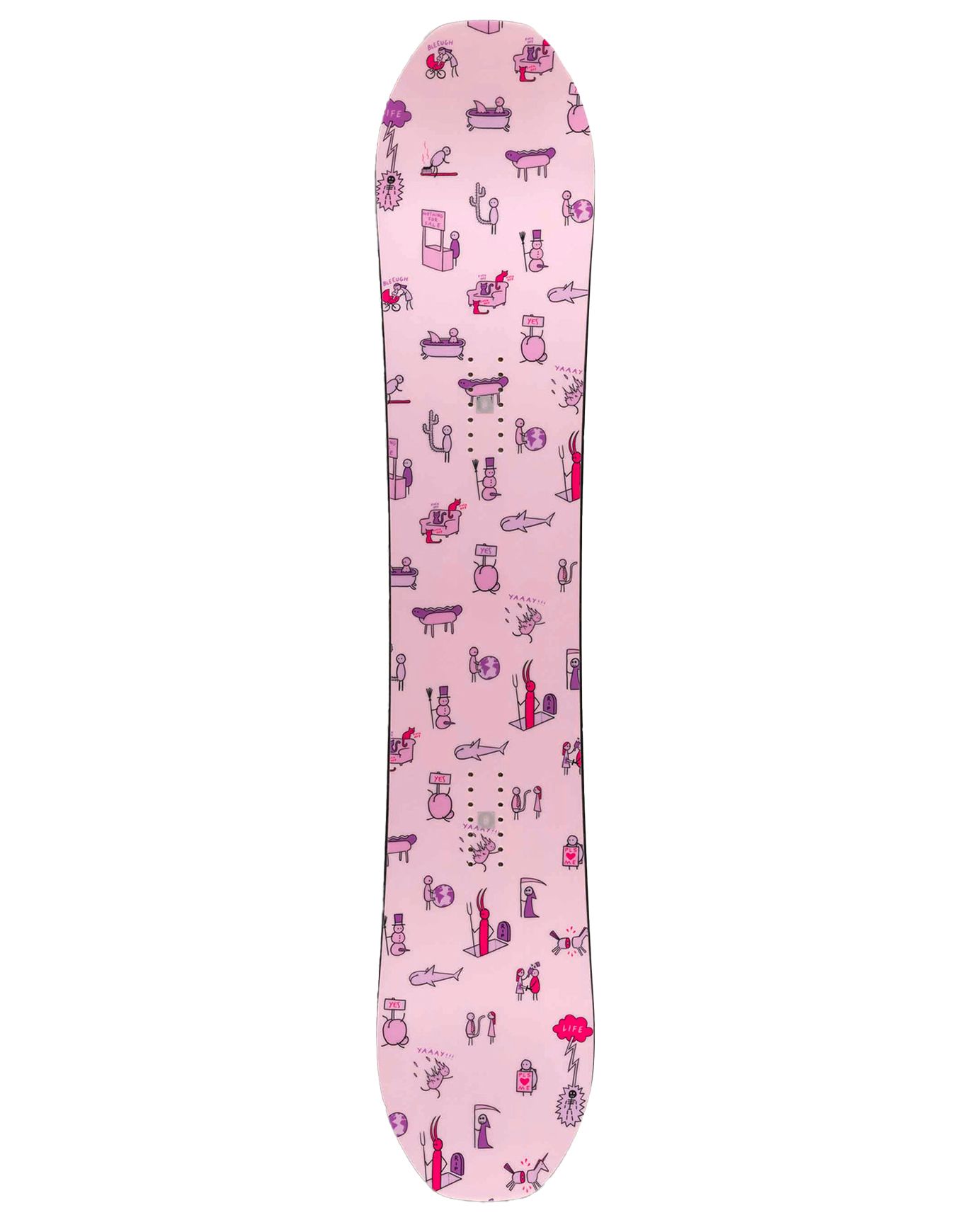 Une performance strictement symétrique est assurée par le shape true twin, aussi bien en regular qu’en switch, ce qui facilite les tricks et les transitions. Le profil camber classique offre une tenue de carre rigoureuse, une stabilité à haute vitesse ainsi qu’un pop explosif lors de chaque décollage.