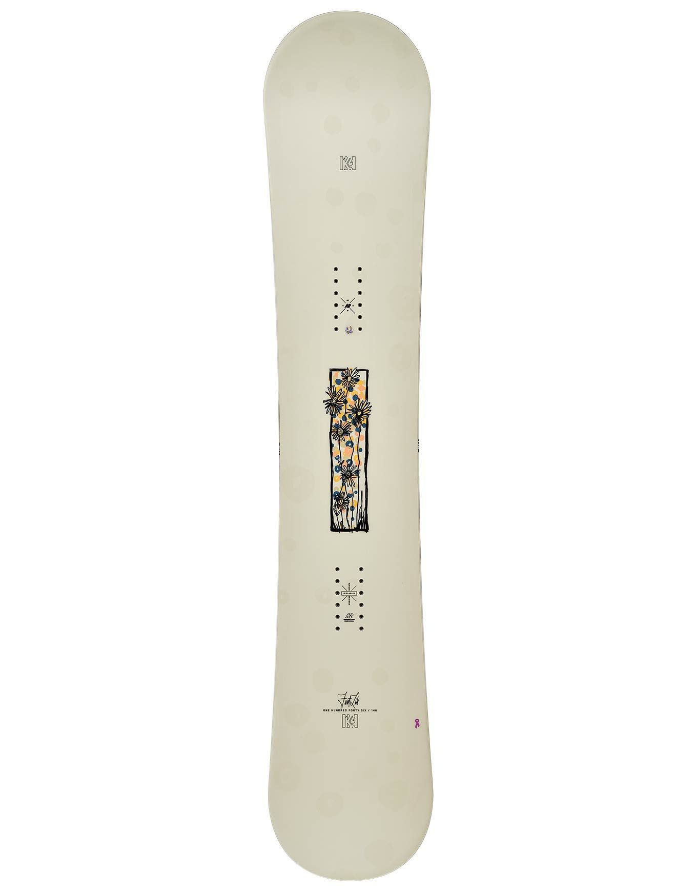 K2 Snowboard First Lite 2025 : snowboard femme polyvalent et tolérant pour débutantes, cambre plat Catch-Free™ Tune, noyau bois léger, flex adapté, twin-tip joueur sur tous les terrains.