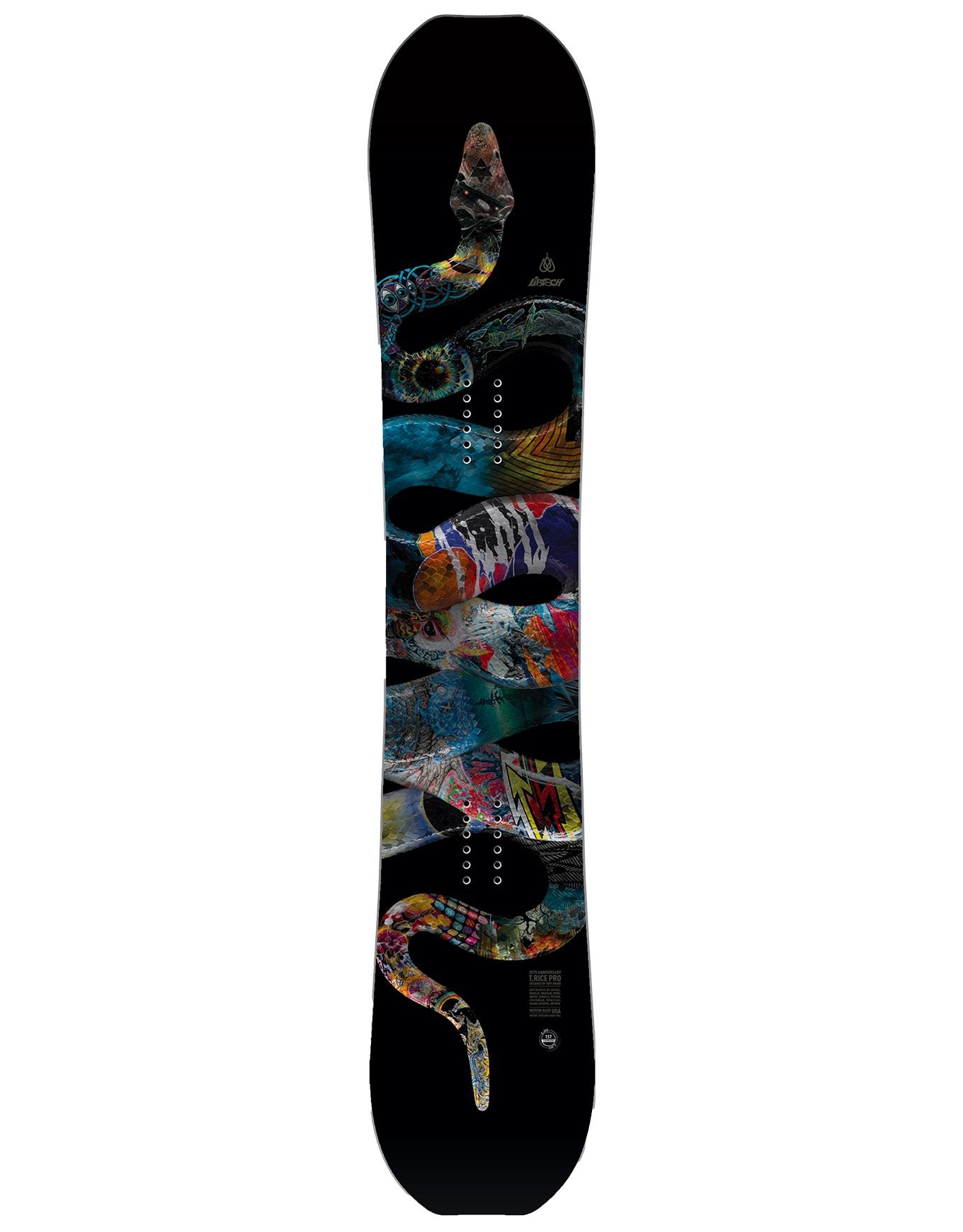 La T-Rice Pro fête ses 20 ans : planche all-mountain freestyle homme, niveau confirmé à expert. Le topsheet arbore un serpent dont les écailles reprennent les motifs des 20 années de la board.