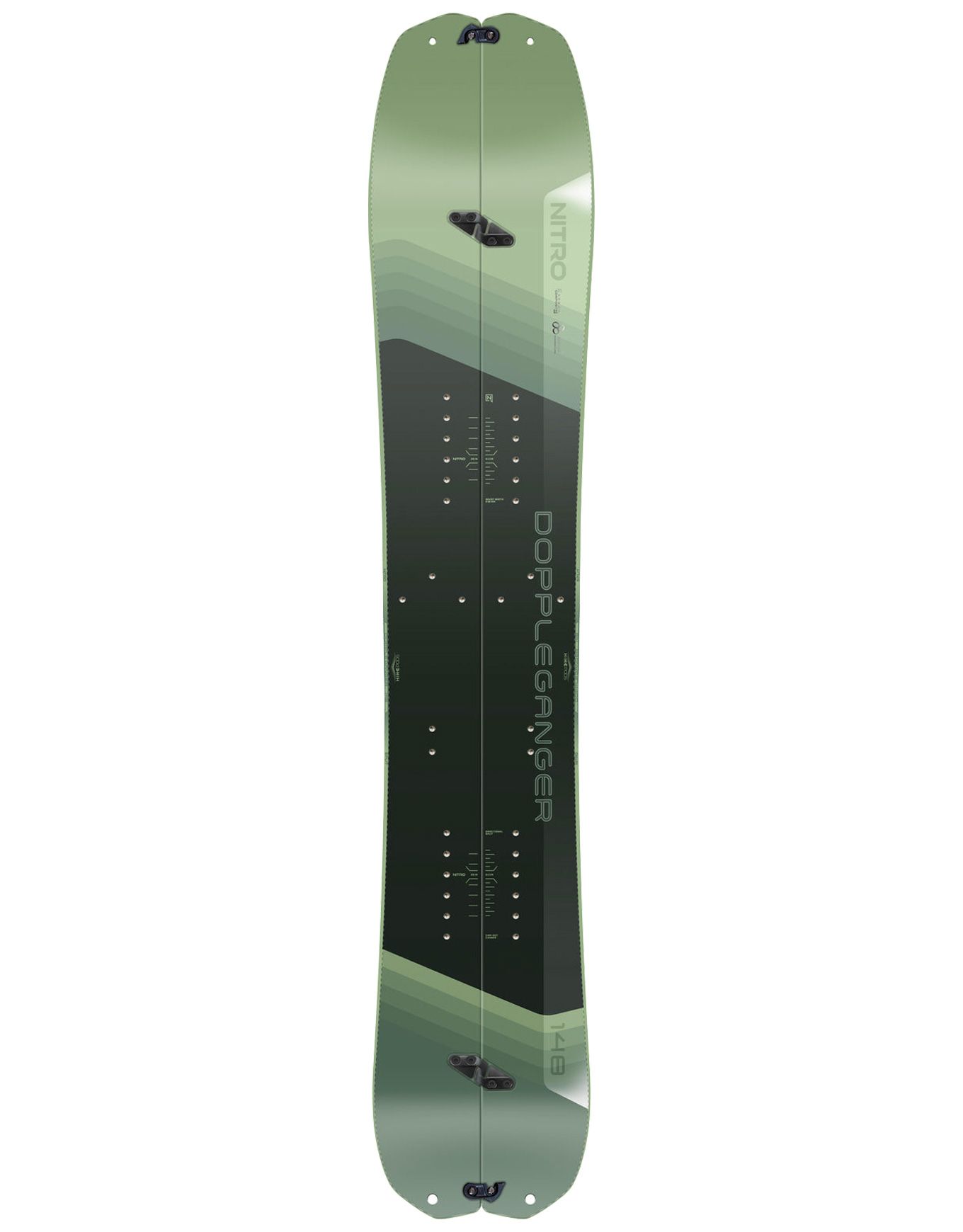 La technologie Power Pods de Nitro a été spécifiquement adaptée au modèle Doppleganger sous la forme des Hike Pods. Cette innovation se manifeste par une ondulation localisée au niveau du patin, offrant une meilleure accroche de la carre intérieure au droit de la fixation et compensant ainsi le manque de grip inhérent aux splitboards.