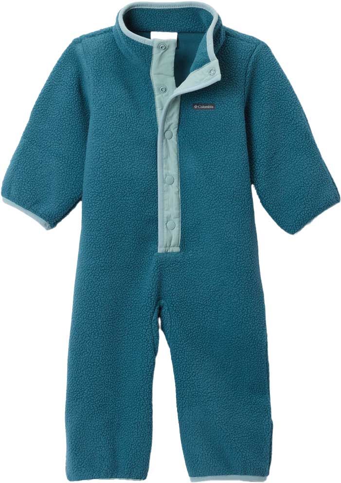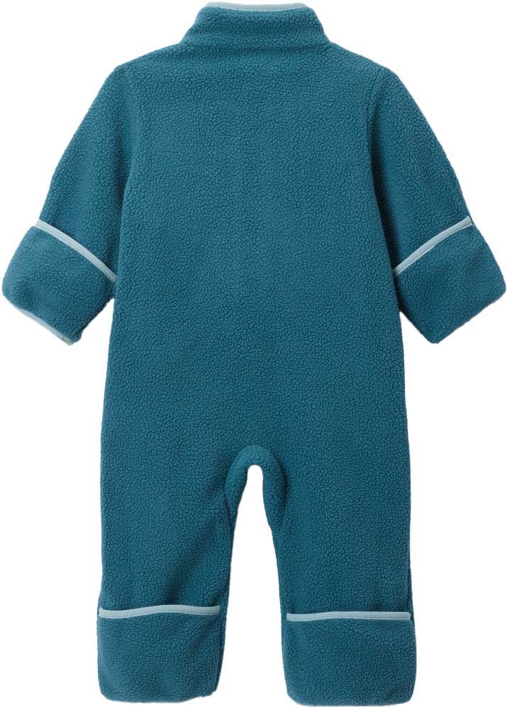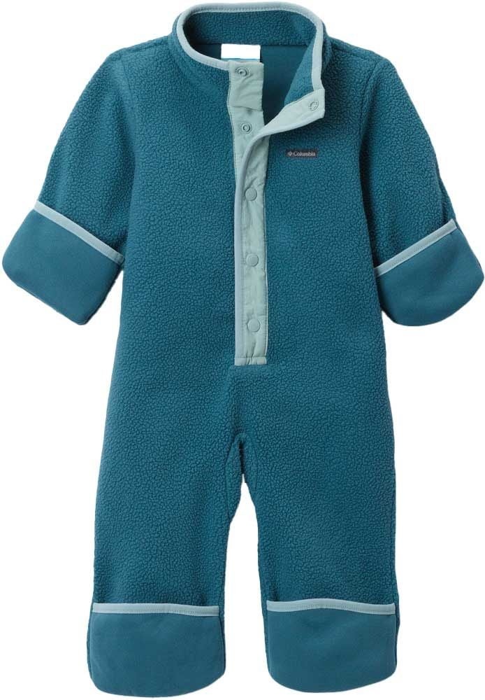 La combinaison Columbia Helvetia Bunting Everblue Crushed Blue enveloppe bébé de chaleur dans un tissu douillet, avec fermeture demi-pressionnée et revers aux manches-pieds pour un enfilage facile et une protection complète contre le froid.