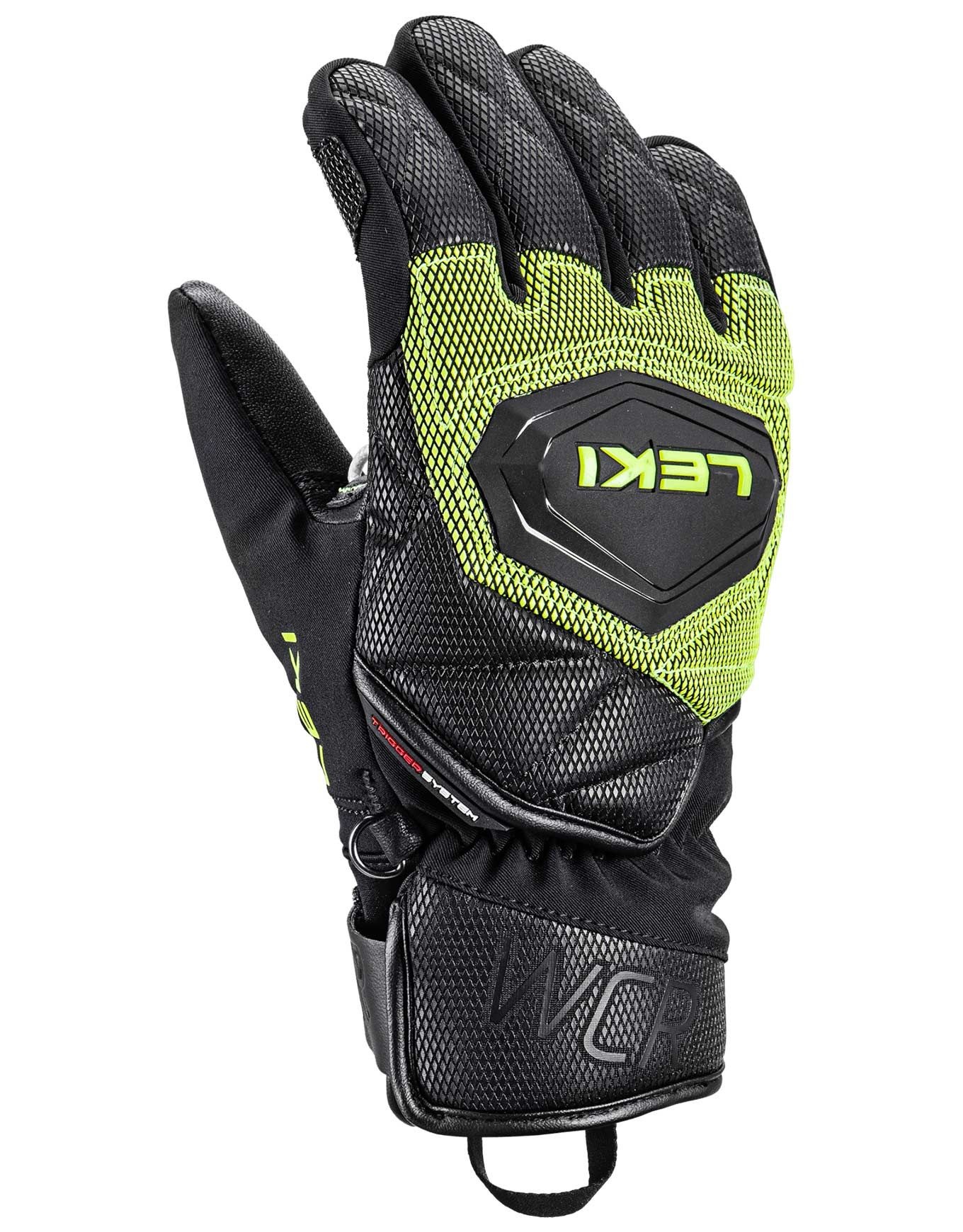 Gants de course Leki WCR Coach 3D Junior Black-Ice Lemon : isolation Thinsulate™ et Hyperloft, membrane SOFT-TEX® imperméable, système Trigger, pads EVA et coque céramique, coupe Junior Race Fit aérodynamique.