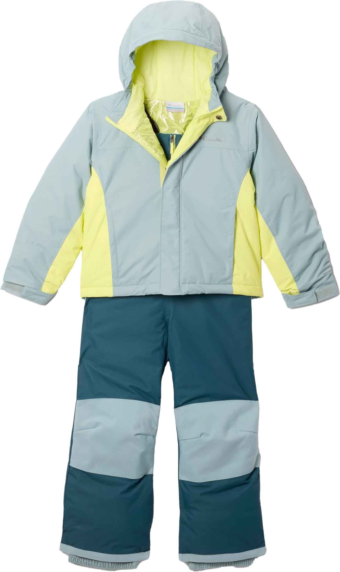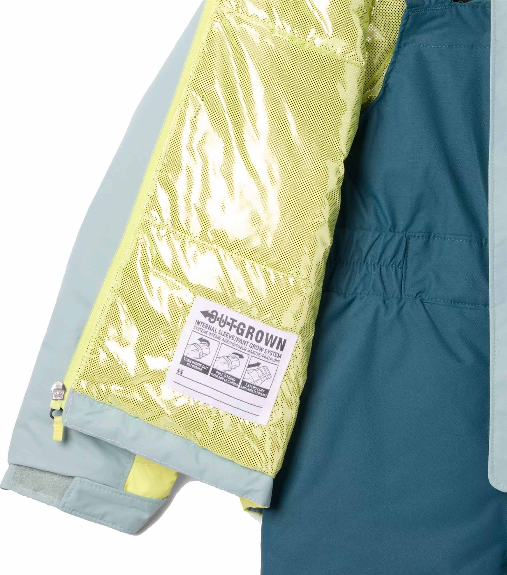 Ensemble de ski Columbia Buga III Set Blue Neon Light Everblue enfant : veste et salopette imperméables Omni-Tech™ respirantes, coutues scellées, doublure thermique Omni-Heat™ recyclée, système évolutif OutGrown™, genoux préformés et guêtres intérieures.