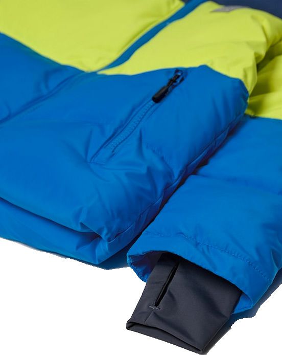 Une jupe pare-neige intégrée, des poignets intérieurs extensibles munis de passages pour les pouces, ainsi qu’une poche zippée pour le forfait de ski dissimulée dans la manche complètent l’équipement de cette veste.