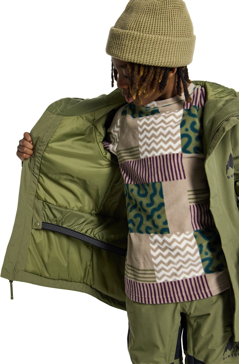 Protection personnalisée est assurée par la capuche Contour™ intégrée, compatible avec le port du casque, de même que par la jupe pare-neige ergonomique avec interface veste-pantalon. L’équipement comprend divers rangements : poches chauffe-mains doublées micropolaire et dotées de fermetures zippées, poche forfait située sur la manche, plus une poche thermique munie d’un passant pour câble multimédia afin de protéger un téléphone.