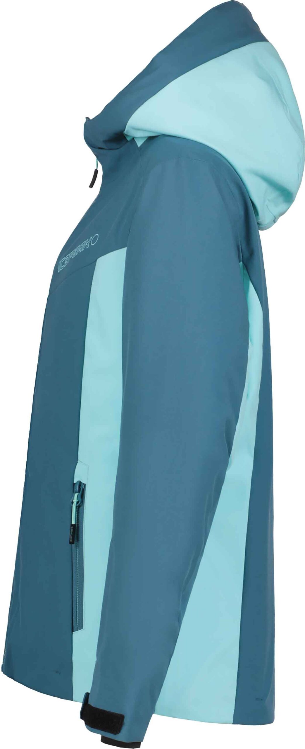 Veste de ski enfant Icepeak Lanett Émeraude, 2 couches membrane imperméable respirante, coutures étanches, rembourrage léger, jupe pare-neige silicone, capuche anti-étranglement compatible casque.