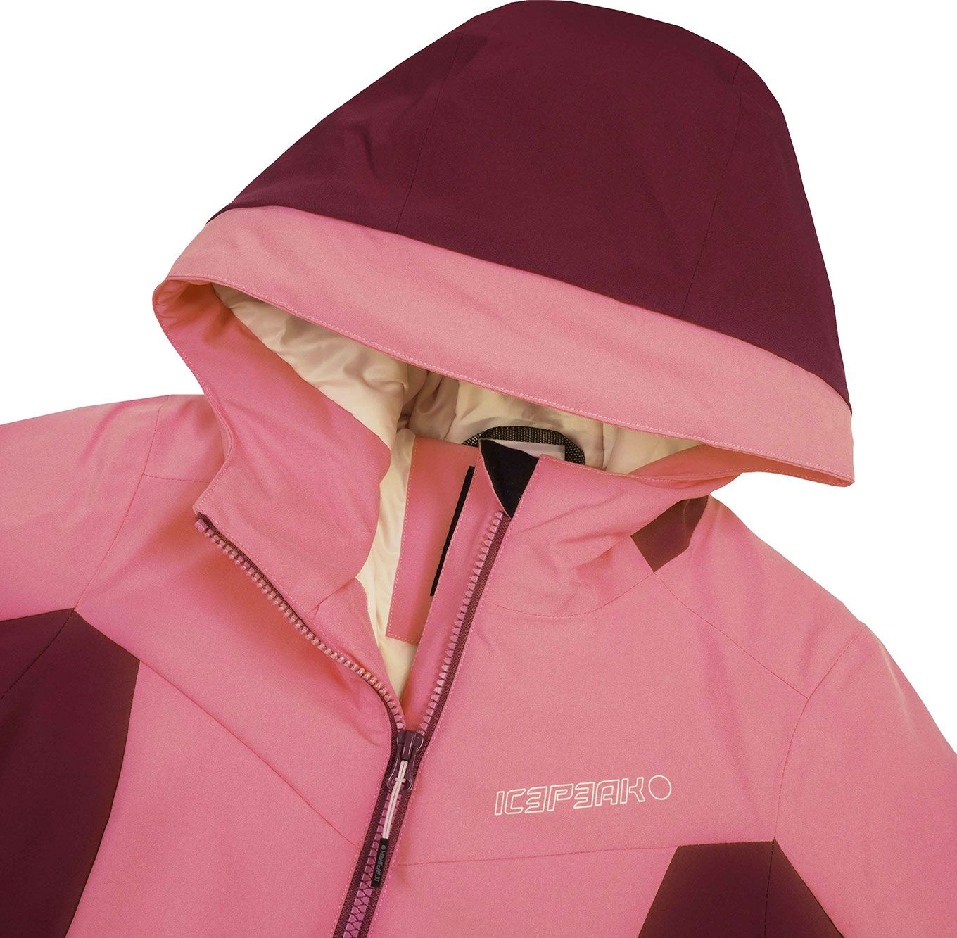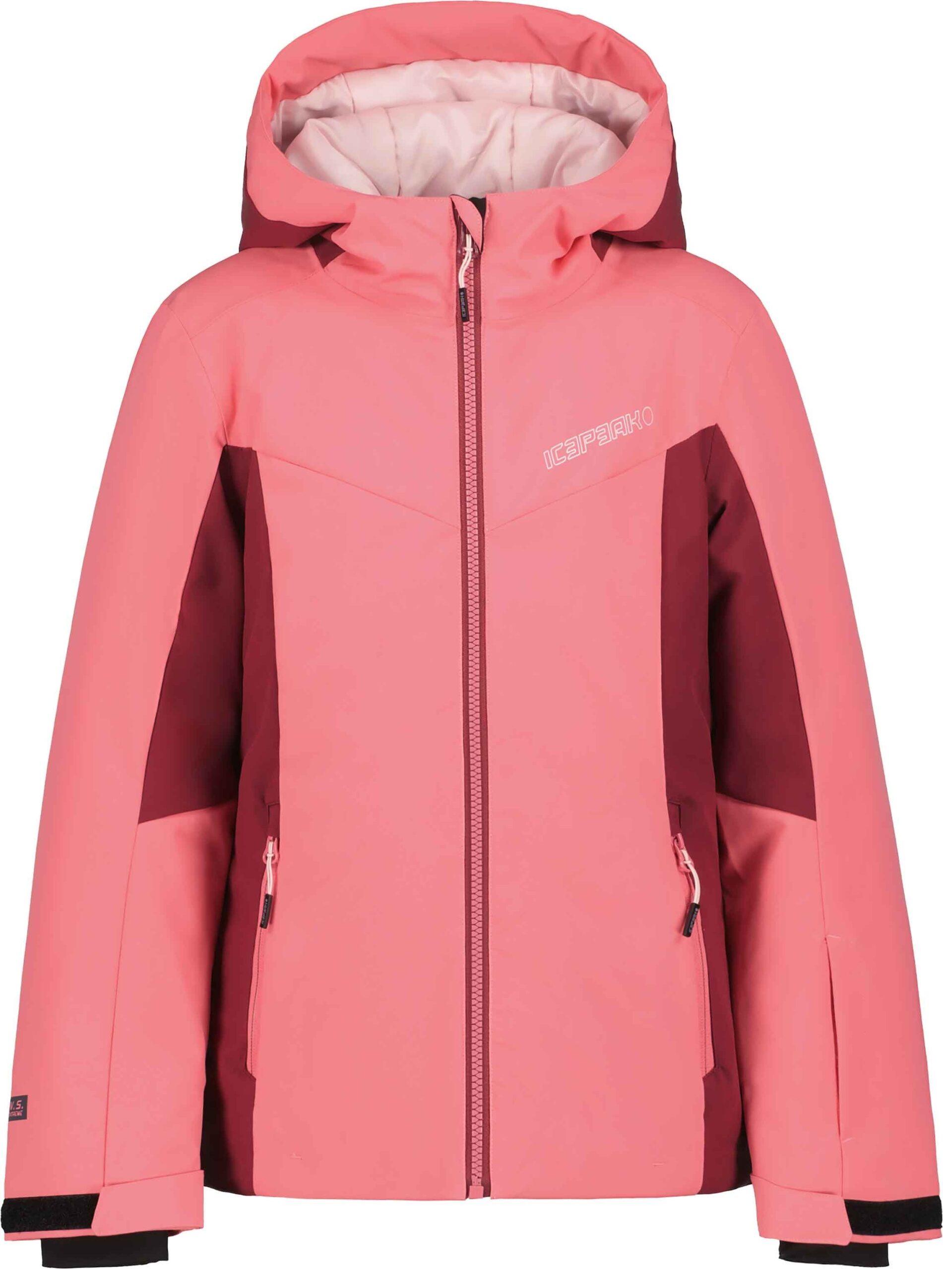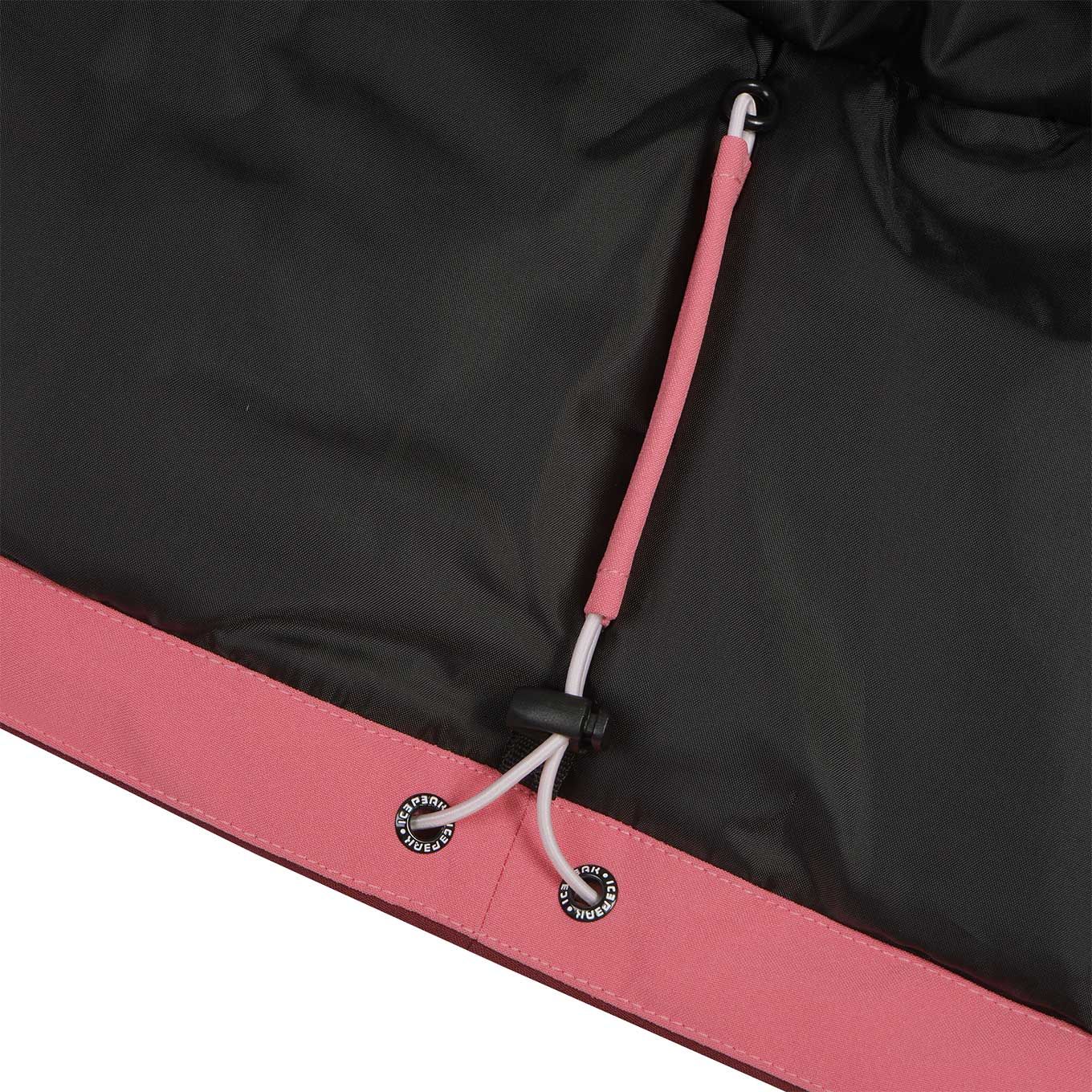 Veste de ski enfant Icepeak Lanett Rose, 2 couches avec membrane imperméable-respirante, coutures étanches, rembourrage léger, jupe pare-neige silicone et capuche anti-étranglement compatible casque.