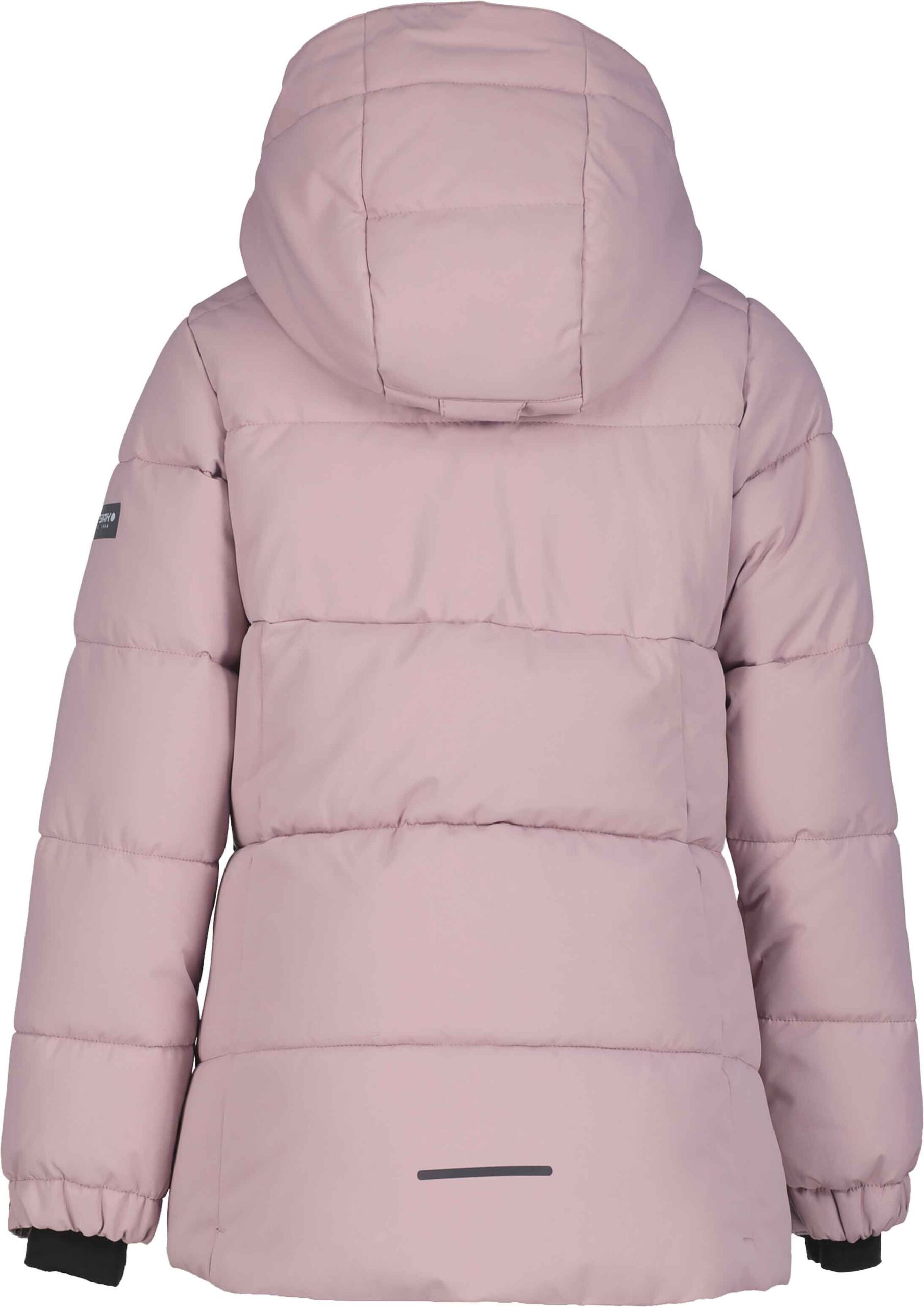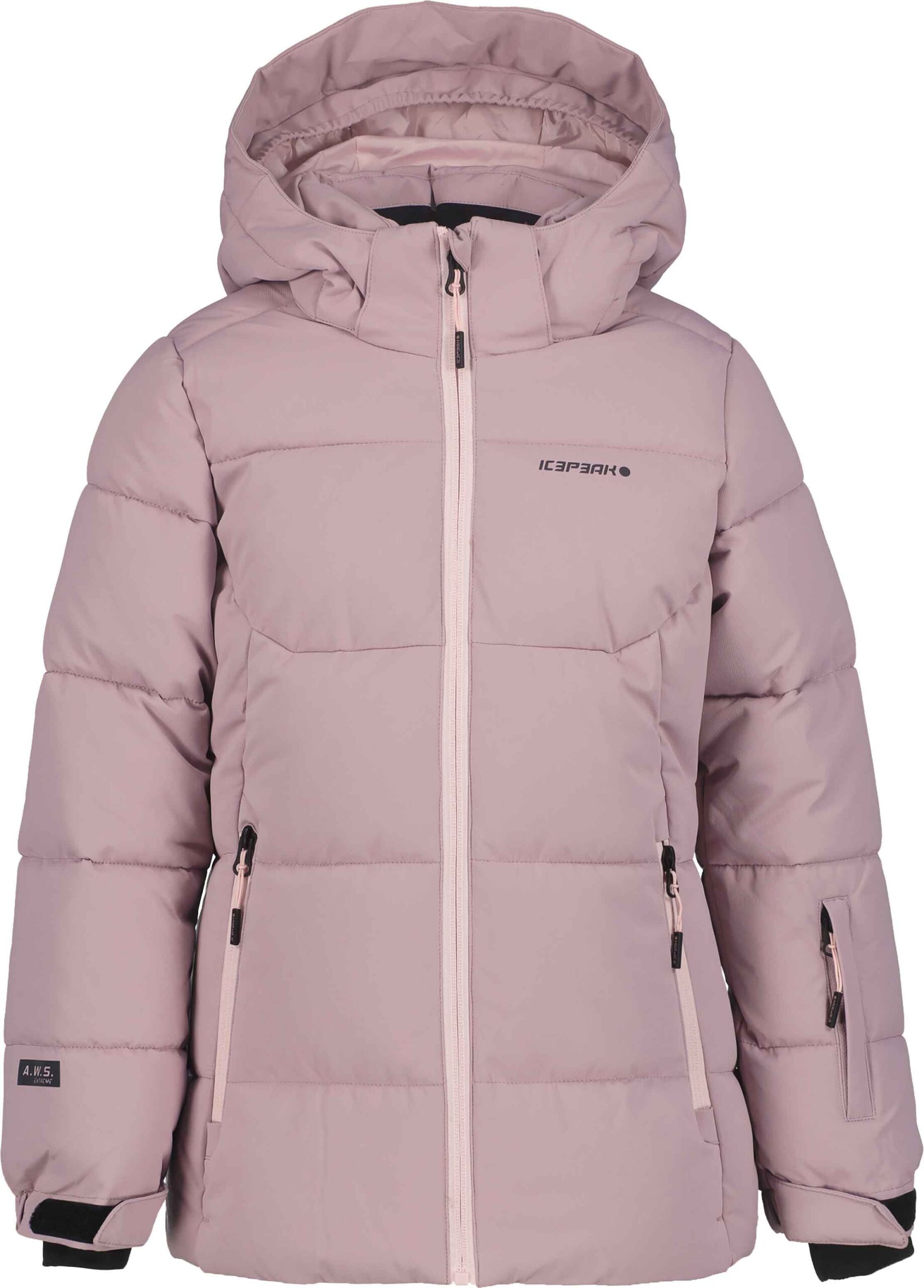 Doudoune de ski Icepeak Loris Rose 2 couches, membrane imperméable respirante, duvet synthétique, jupe pare-neige siliconée et capuche amovible sécurisée.