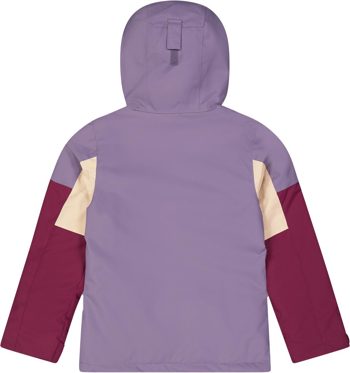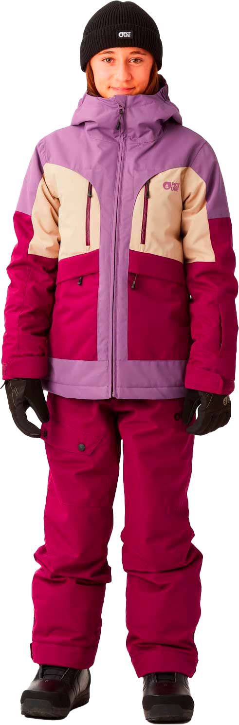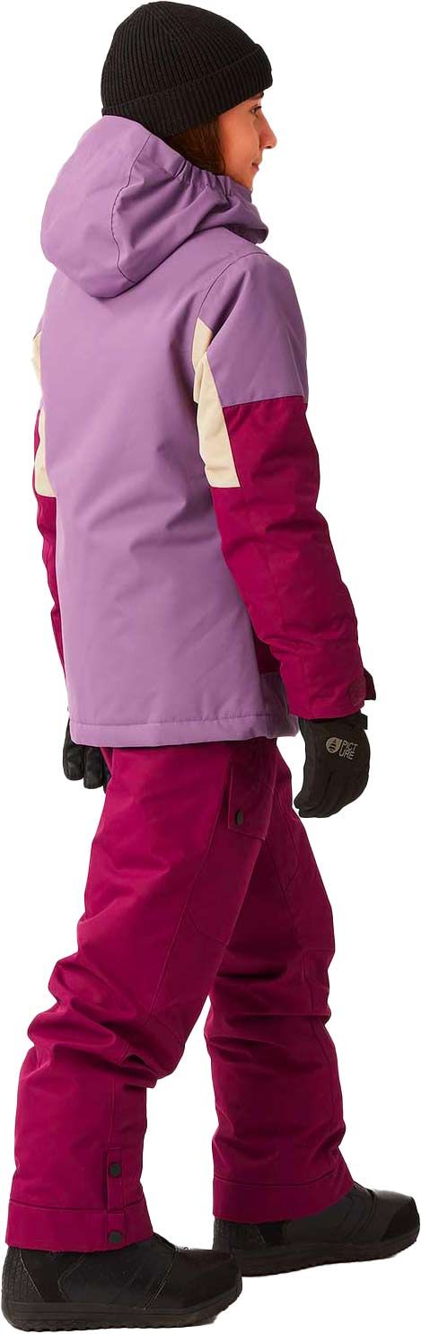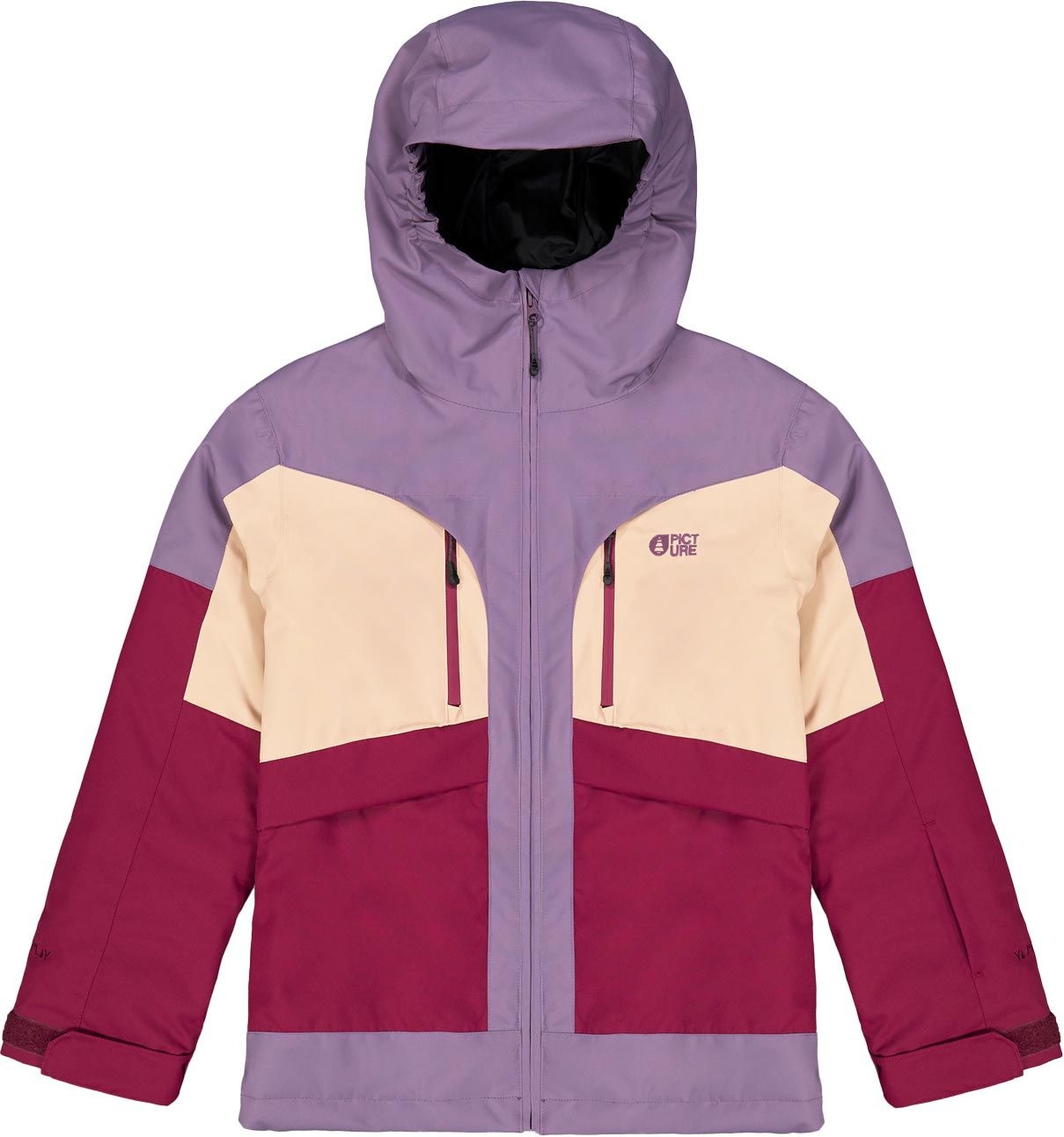 Veste de ski Miniakoon Grape Jam Picture Organic Clothing 2 couches, membrane Dryplay 20K/20K, isolation polyester, coutures collées, zips étanches, capuche et jupe pare-neige ajustables, coupe droite dos long.
