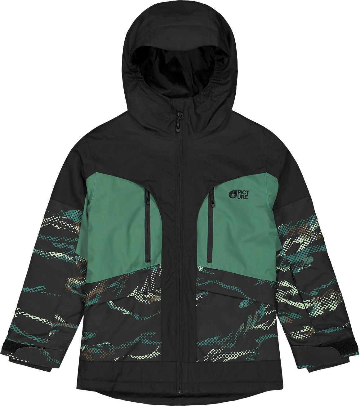 La veste de ski Minikoon Forest Shadow Print dès Picture Organic Clothing est une veste 2 couches 20K/20K respirante et chaude avec capuche, jupe pare-neige et poches zippées ajustables pour enfant.