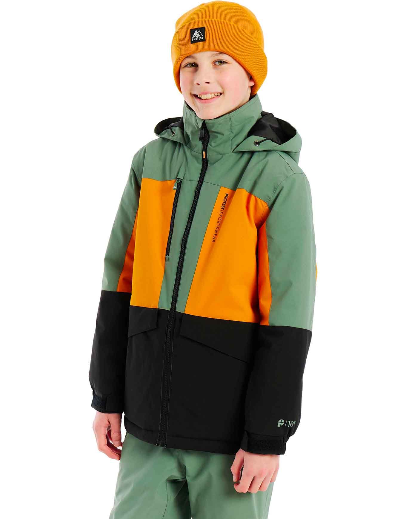 Veste de ski Protest Prtmilan Jr Snowjacket Caramel Yellow garçon, imperméable 10 000 mm et respirante 10 g, col montant, capuche fixe, jupe pare-neige et coutures étanches pour protéger du froid et de la neige.