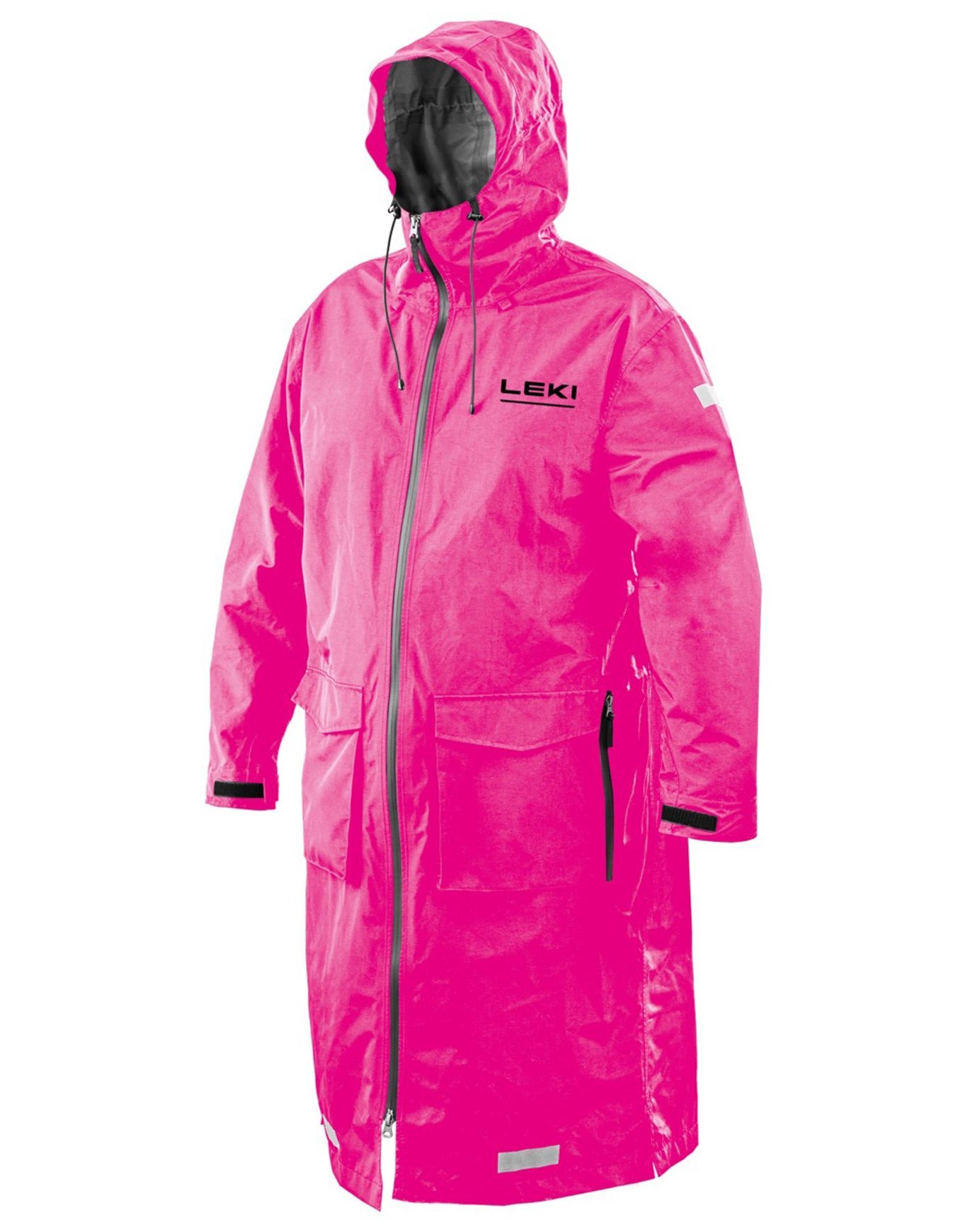 La Rain Coat WCR Pro Junior Pink de Leki est une cape de pluie enfant longue, imperméable et coupe-vent, dotée de deux poches avant étanches pour protéger efficacement du mauvais temps en ski ou au quotidien.