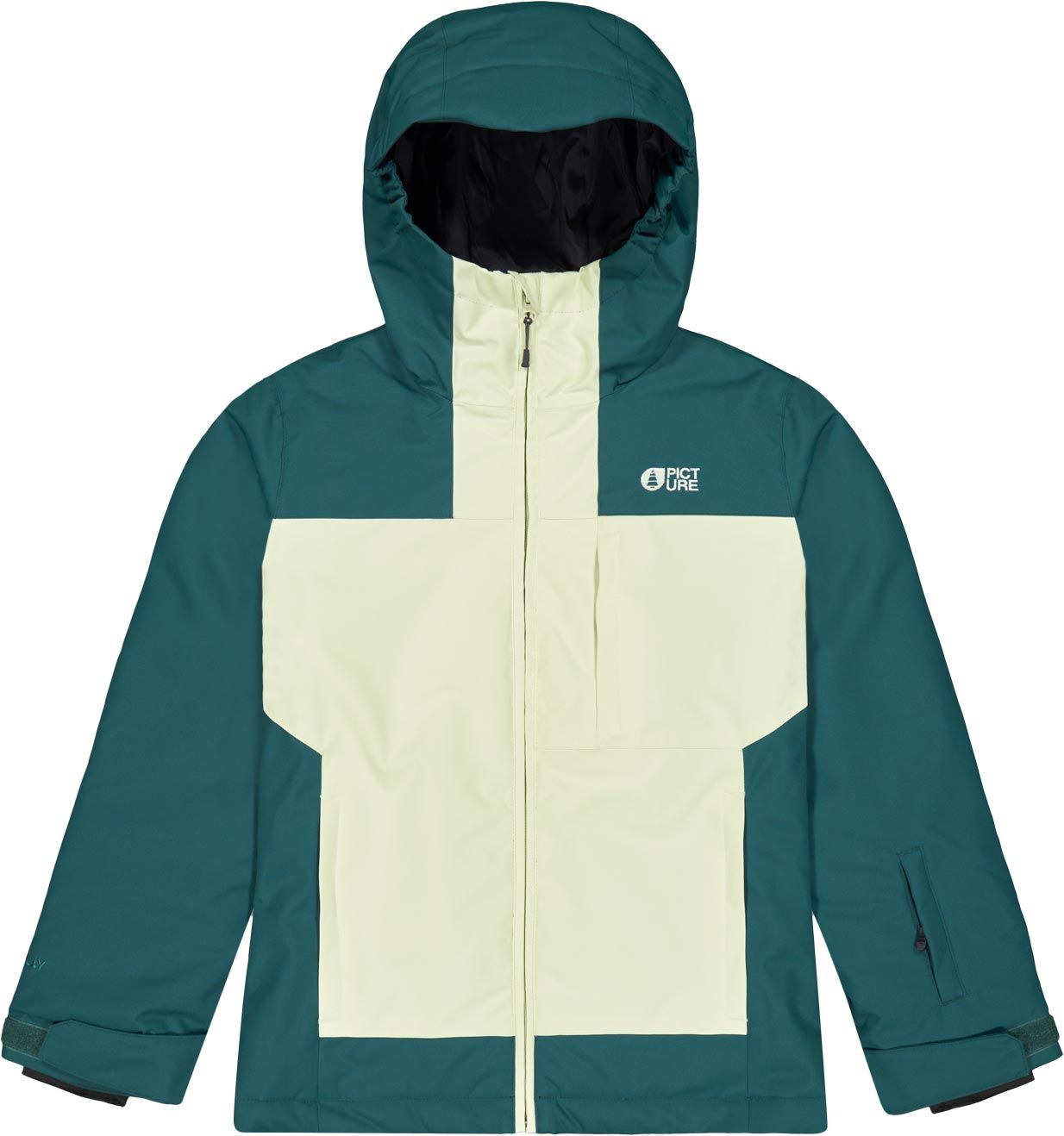 Veste de ski Seady Deep Water fille Picture Organic Clothing, membrane Dryplay imper-respirante, coutures collées, isolation polyester, capuche ajustable, jupe pare-neige et système évolutif.