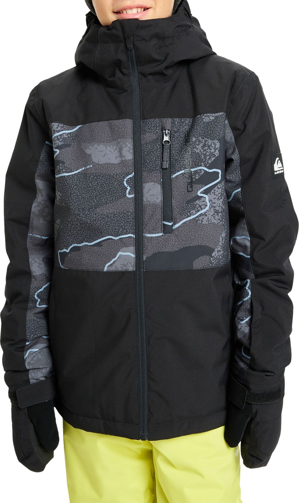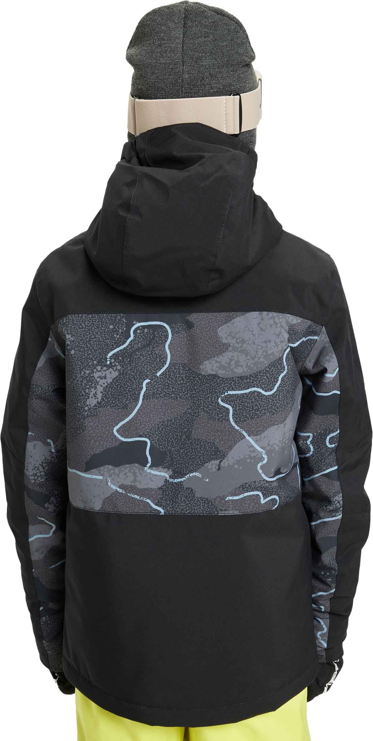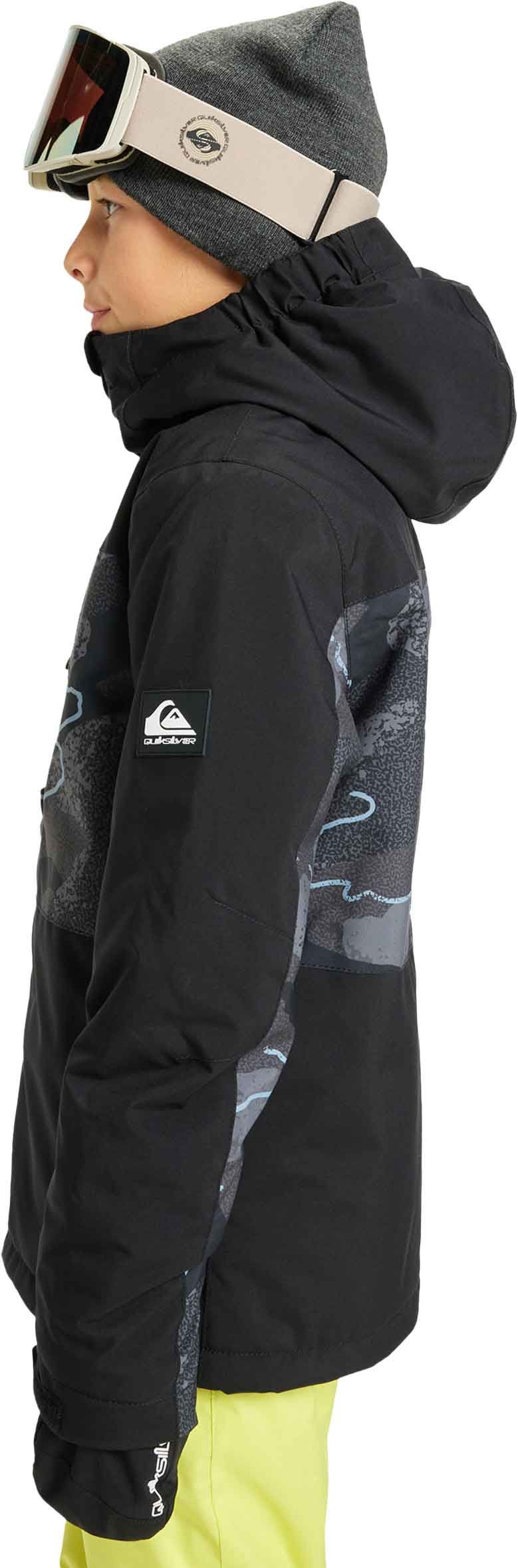 Veste de ski/snowboard Quiksilver Side Hit Printed Youth Fallen Rock pour garçon, membrane 10K DryFlight®, isolation WarmFlight® x3 Eco recyclée, coupe Modern Fit, capuche compatible casque, jupe pare-neige et multiples poches.