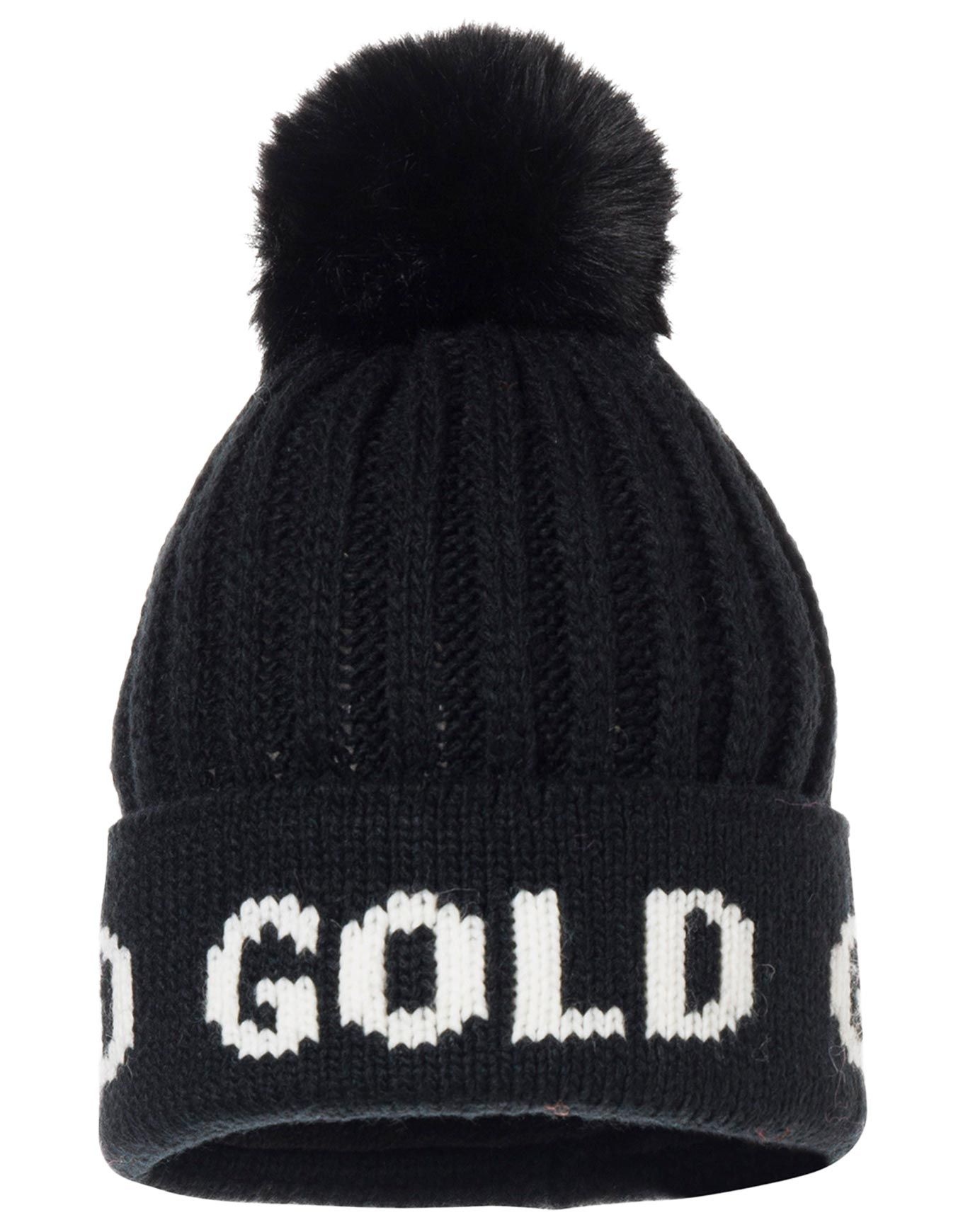 Bonnet Hodd Black/White femme Goldbergh en tricot côtelé 2×2, laine/acrylique, bande polaire intérieure, revers jacquard GOLD et pompon fausse fourrure.