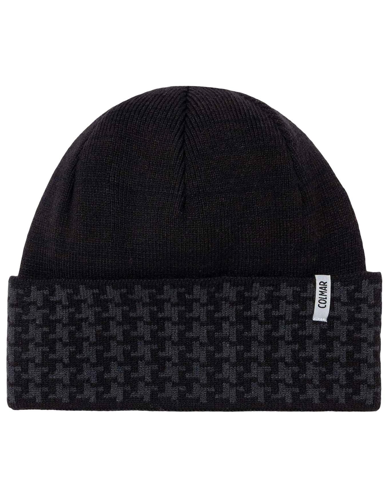 Colmar Ladies Beanie Black, bonnet femme en maille viscose-acrylique avec revers pied-de-poule jacquard et doublure polaire pour chaleur et confort hivernal.