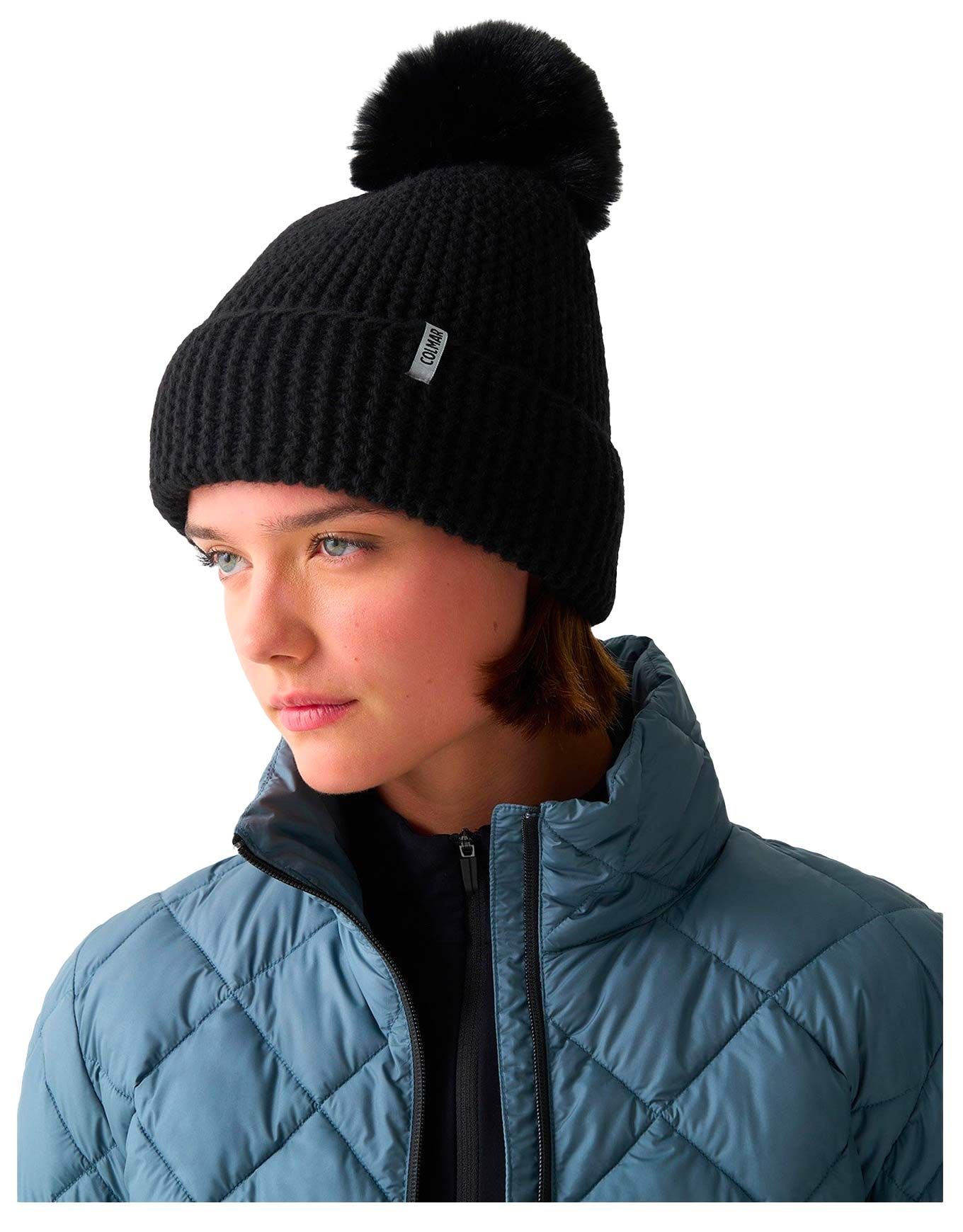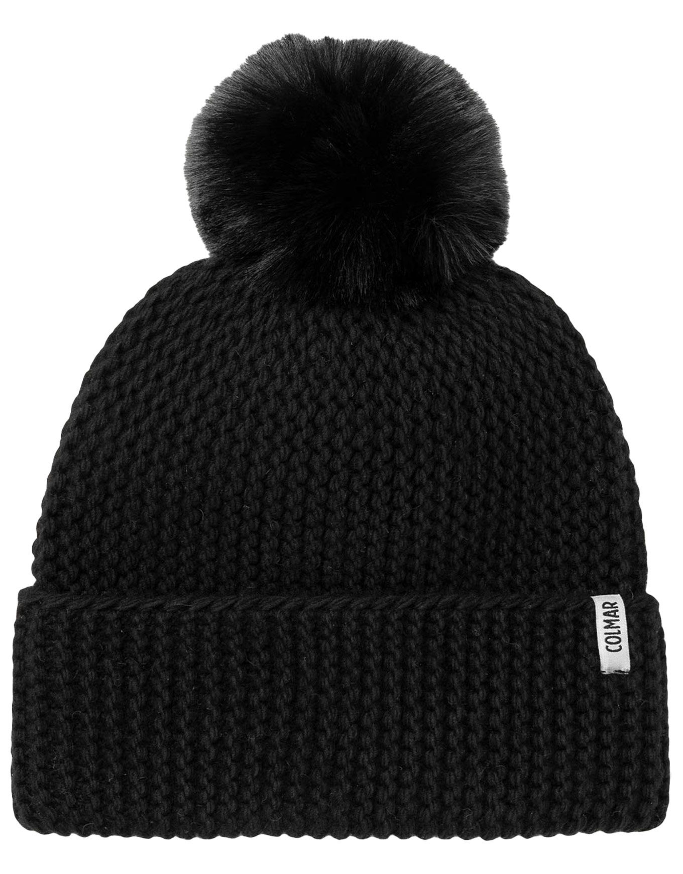 Colmar Ladies Pompon Beanie Black, bonnet femme en mailles verticales de polyester recyclé et laine, bordure douce, pompon fausse fourrure détachable, style écoresponsable raffiné.