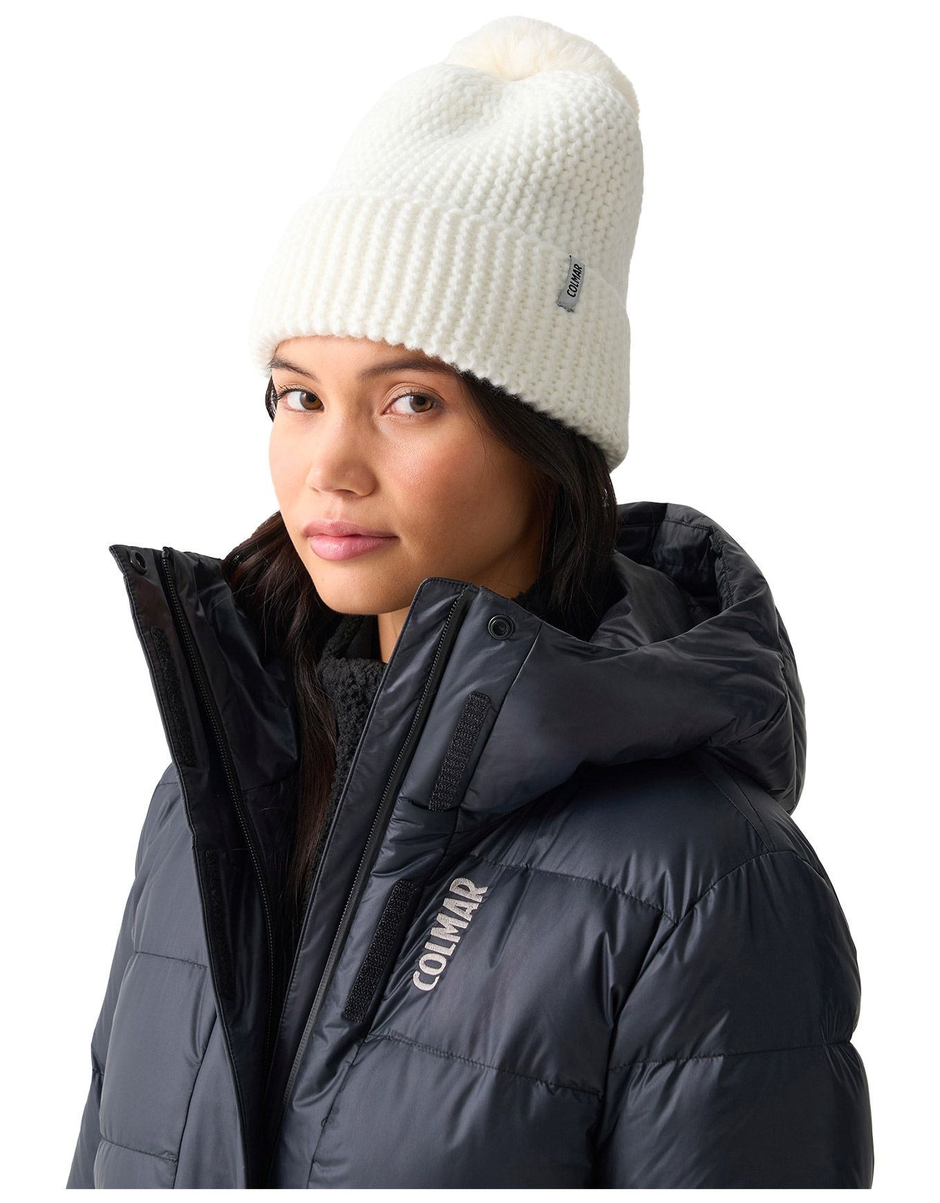 Colmar Ladies Pompon Beanie White, bonnet femme en mailles verticales polyester recyclé et laine, bordure douce, pompon fausse fourrure détachable, style écoresponsable raffiné.