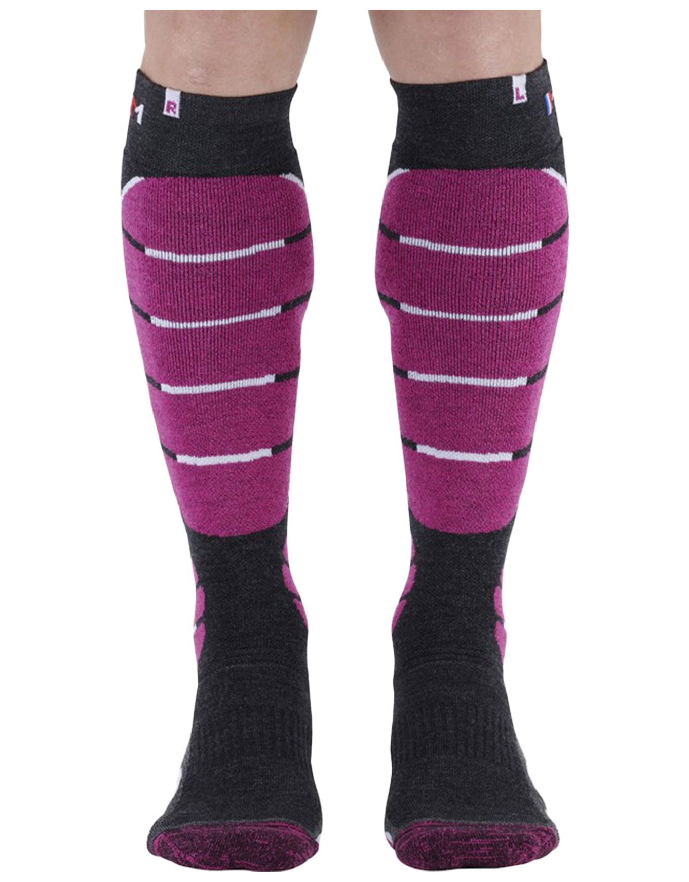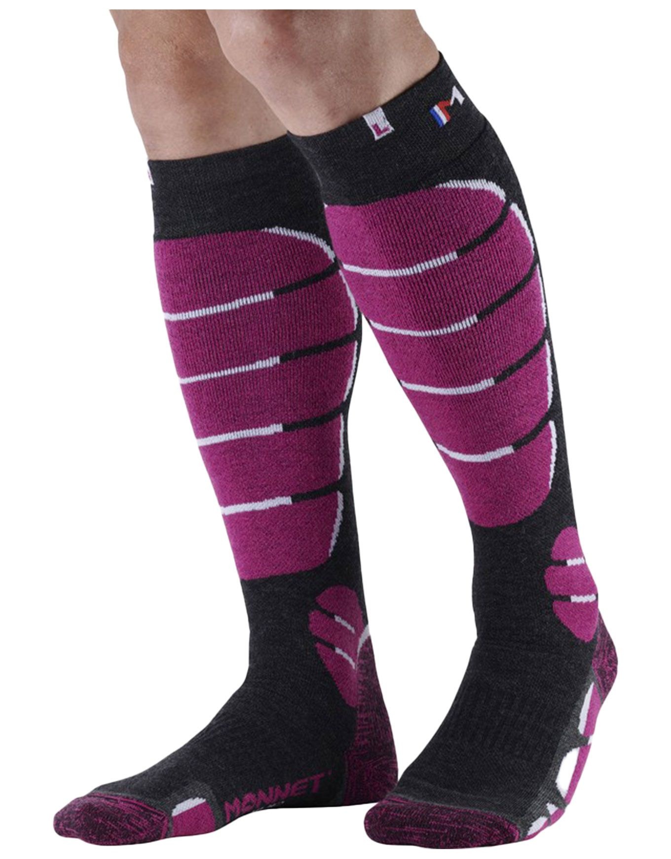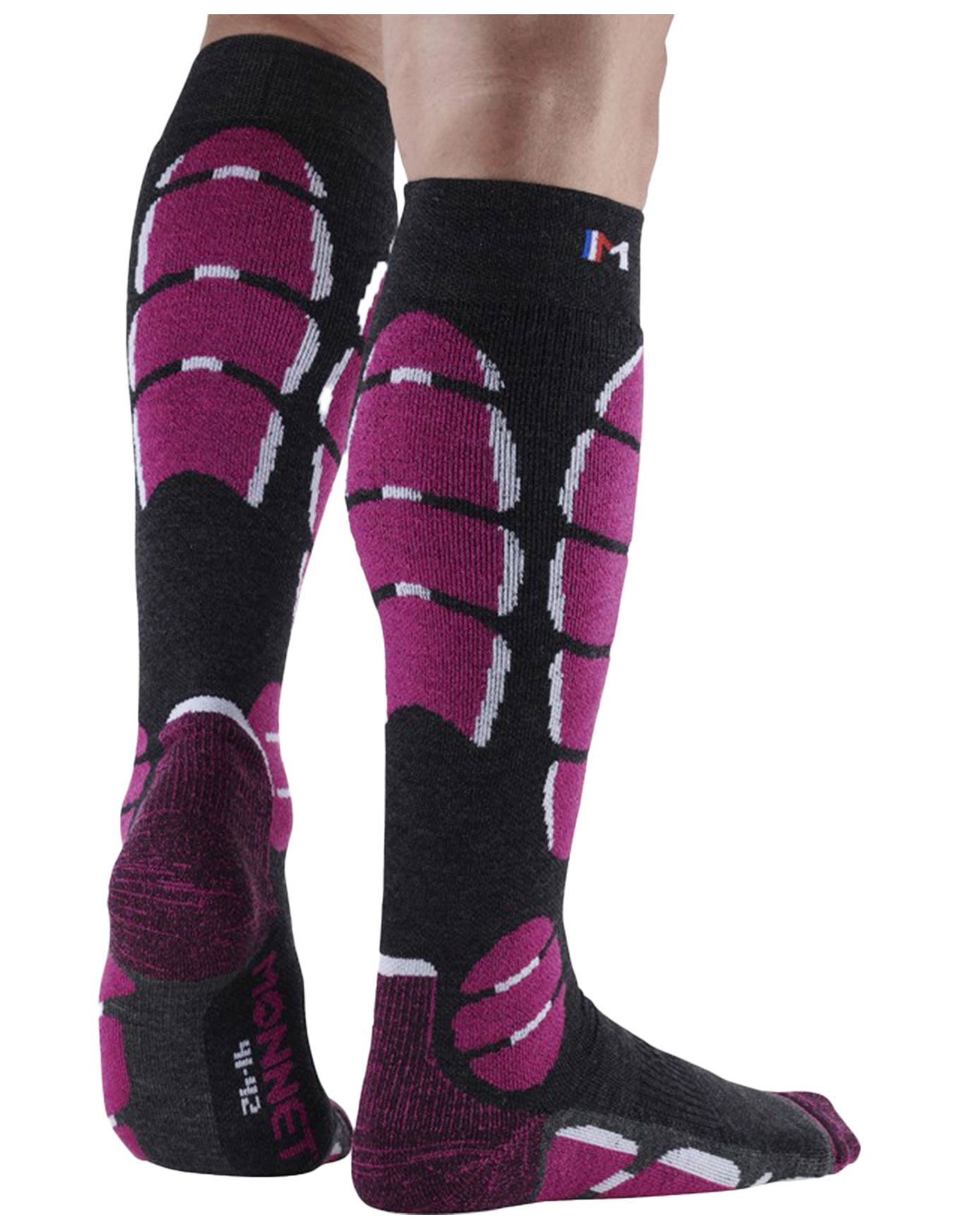 Chaussettes de ski femme Monnet Ski Medium en laine mérinos, isolation hivernale et protection renforcée zones sensibles grâce à Ergonomic Foot Concept©, Tip© Protect et Cushion Zone©. Compression SkinTech©, confort Shield Padding©, épaisseur moyenne, précision seconde peau.