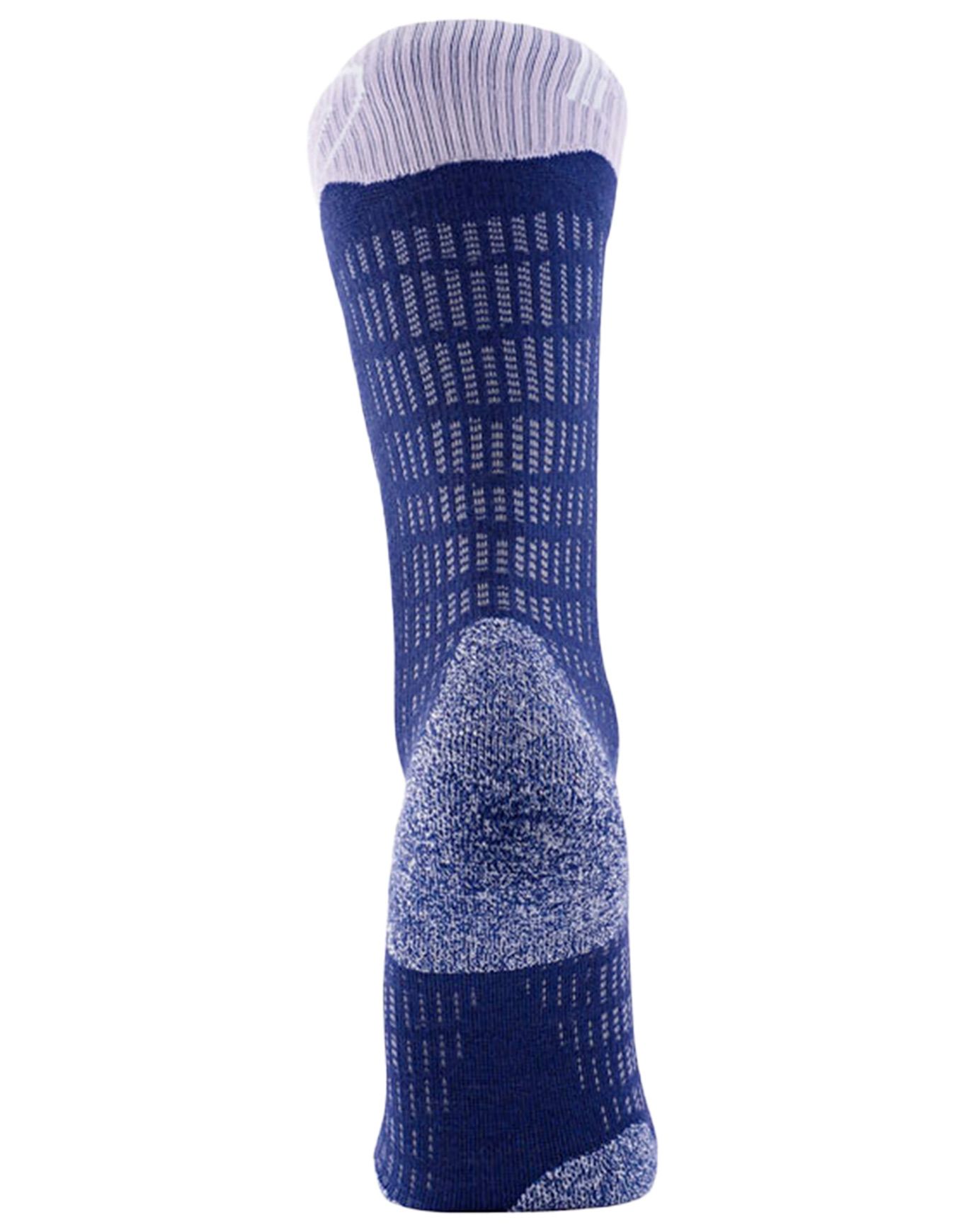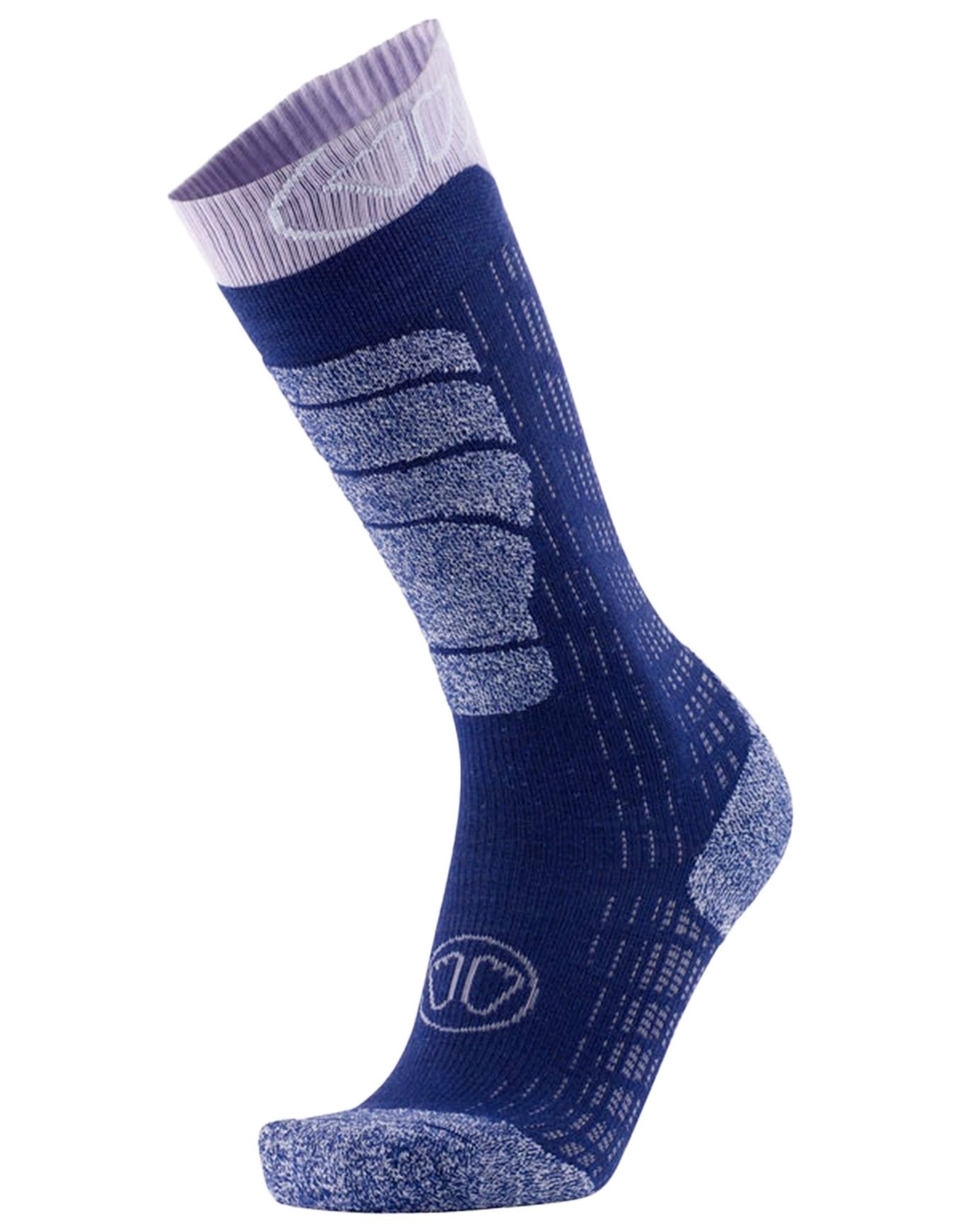 Confort et chaleur sur les pistes sont assurés aux skieuses par les chaussettes de ski anatomiques Sock Ski Merino Blanc/Bleu de Sidas.