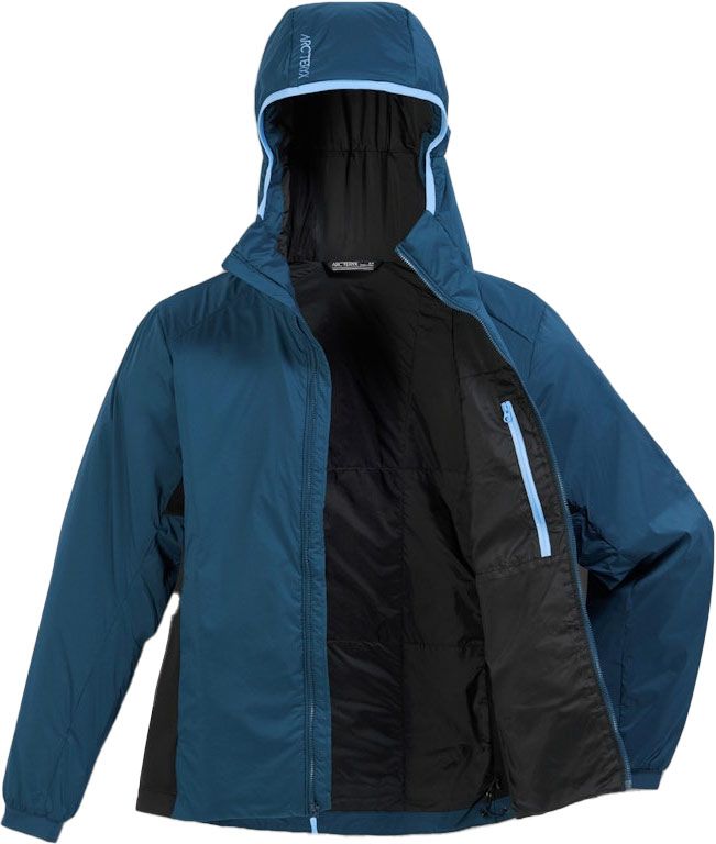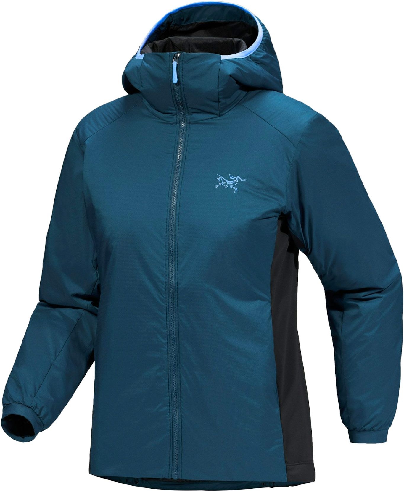 Veste isolante Arc’teryx Atom Hoody Midnight Frost femme, en tissu Tyono™ 20 respirant, isolation Coreloft™ Compact, coupe ajustée, capuche StormHood™ compatible casque, latéraux stretch.