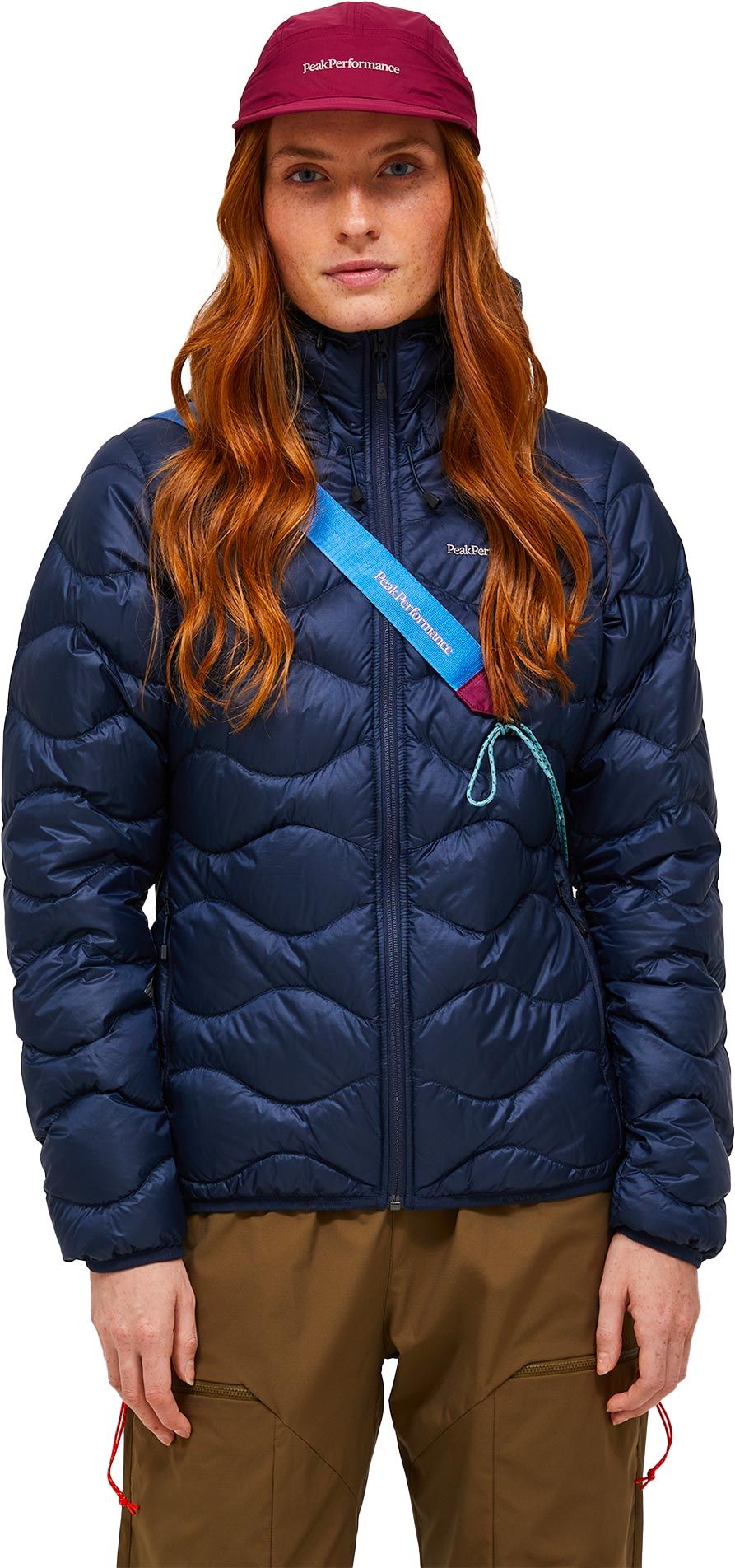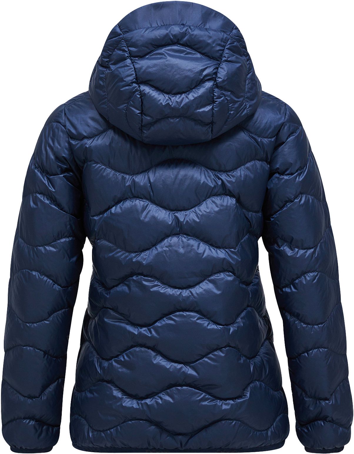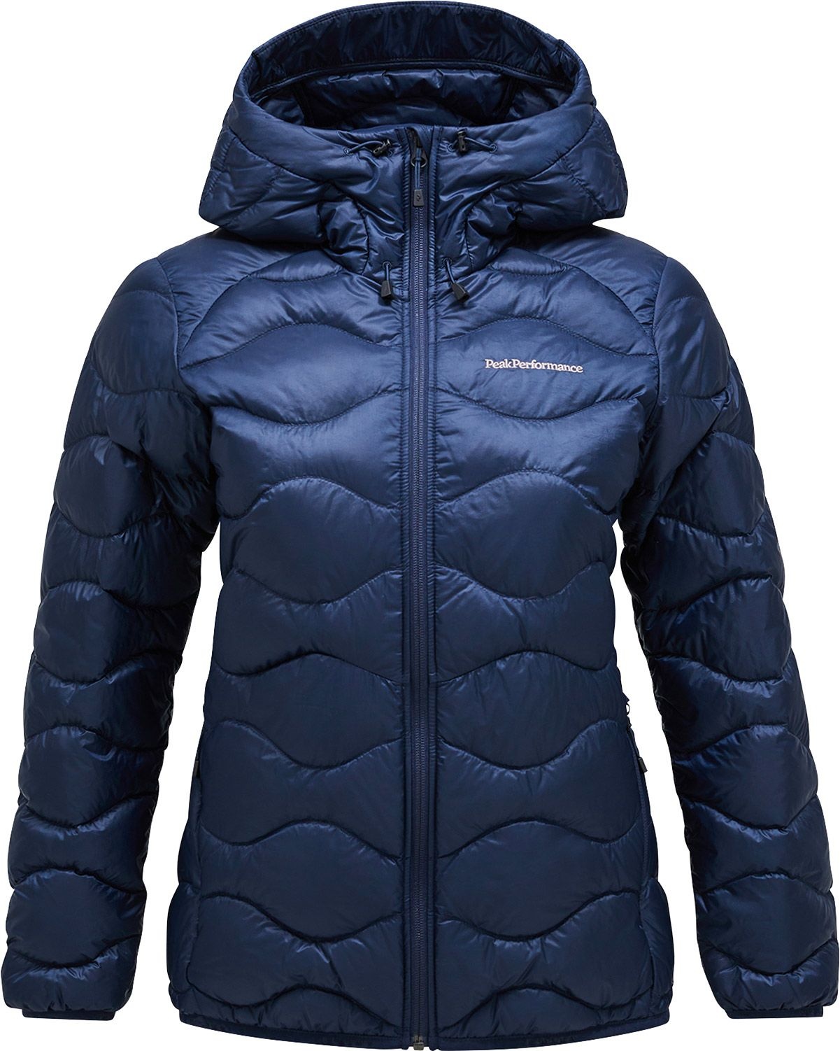 Doudoune Peak Performance Helium Down Hood Jacket Blue Shadow pour femme, chaude et légère en duvet de canard, coupe-vent et déperlante, compressible avec capuche fixe et poches mains.