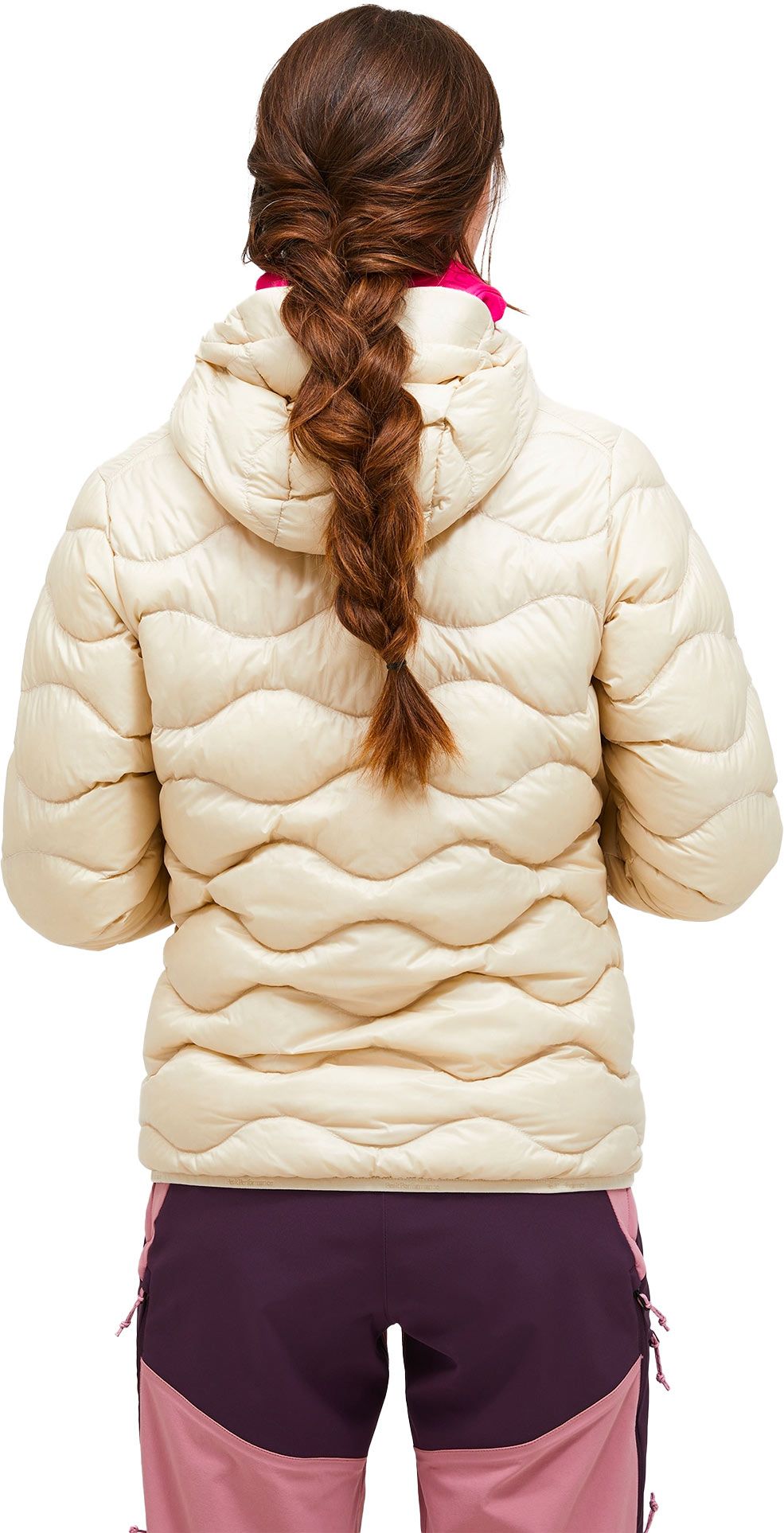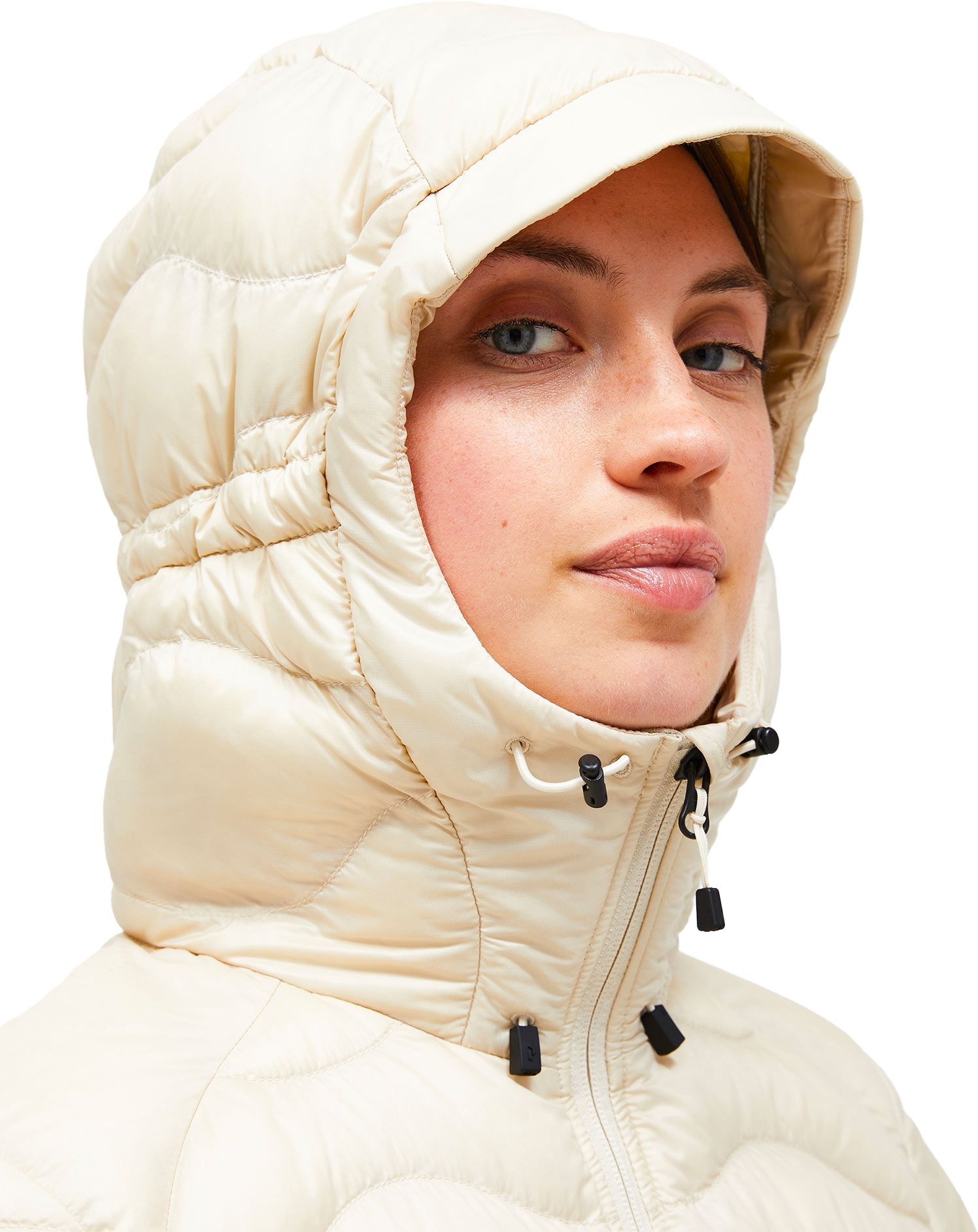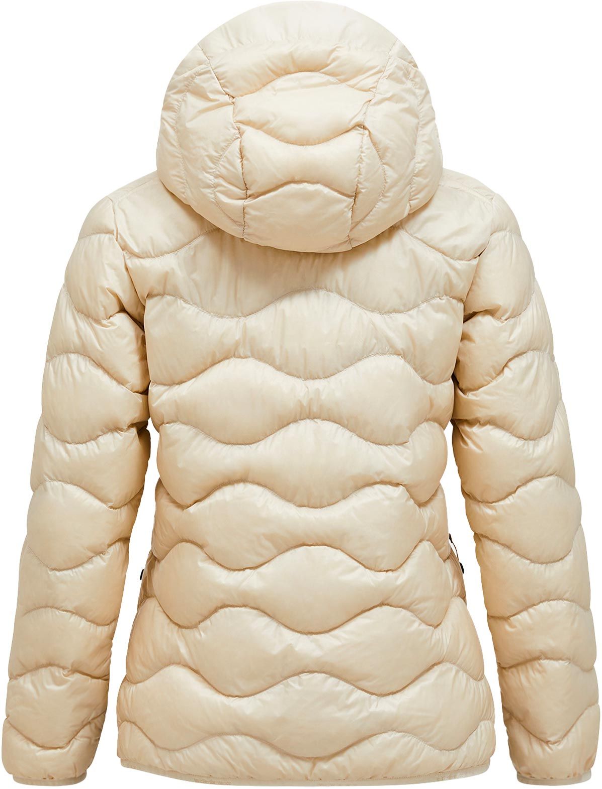 Doudoune Helium Down Hood Jacket Sand Fog Peak Performance femme : isolation duvet de canard, tissu coupe-vent déperlant, compressible, capuche fixe et poches mains.