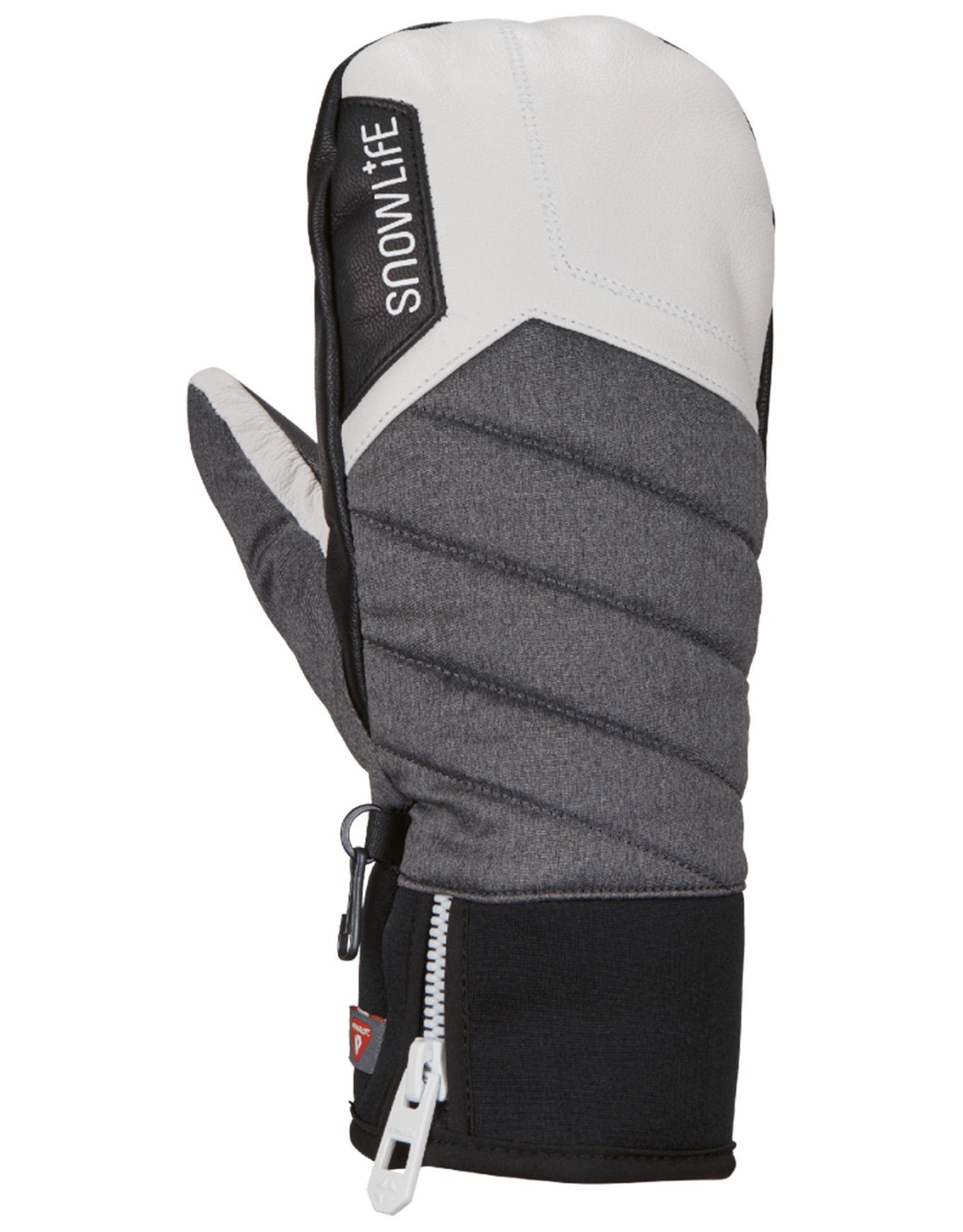 Snowlife Unity DT Mitten Grey/White/Black : moufles ski femme alliant membrane Dry-Tech, isolation PrimaLoft® Gold recyclée et paume cuir chèvre pour imperméabilité, chaleur et souplesse. Touch écran i-Touch, poignet néoprène zippé, dragonne amovible.