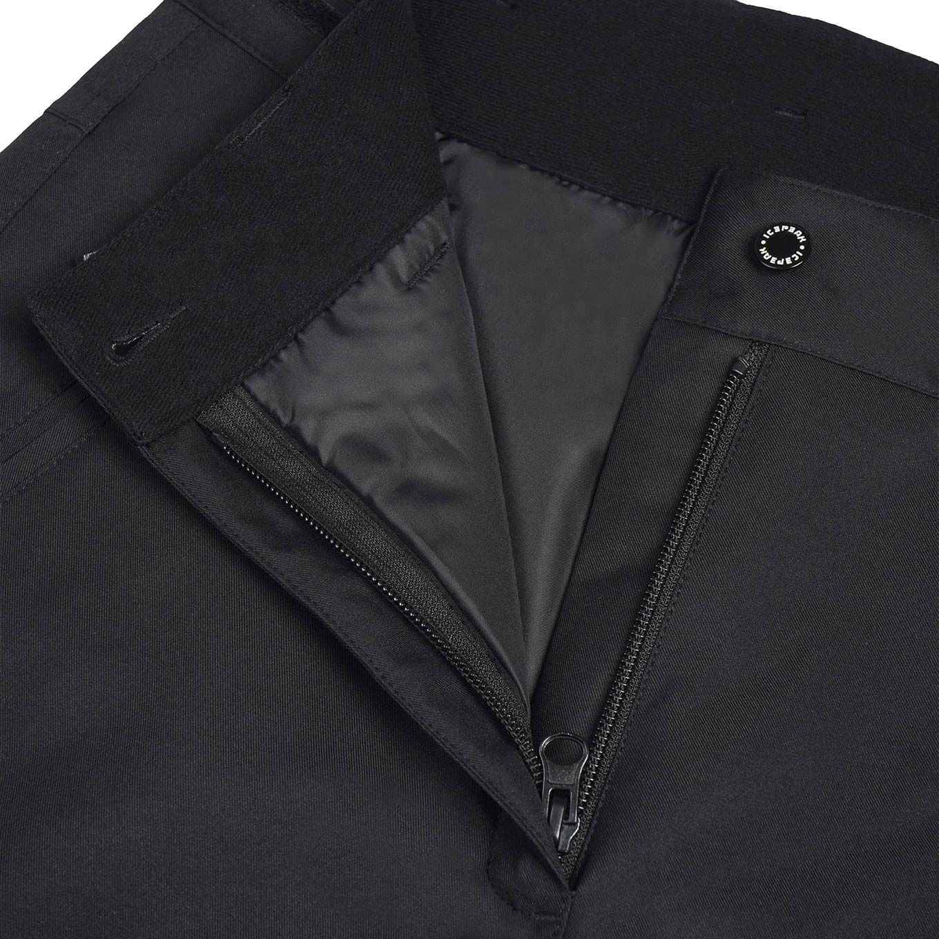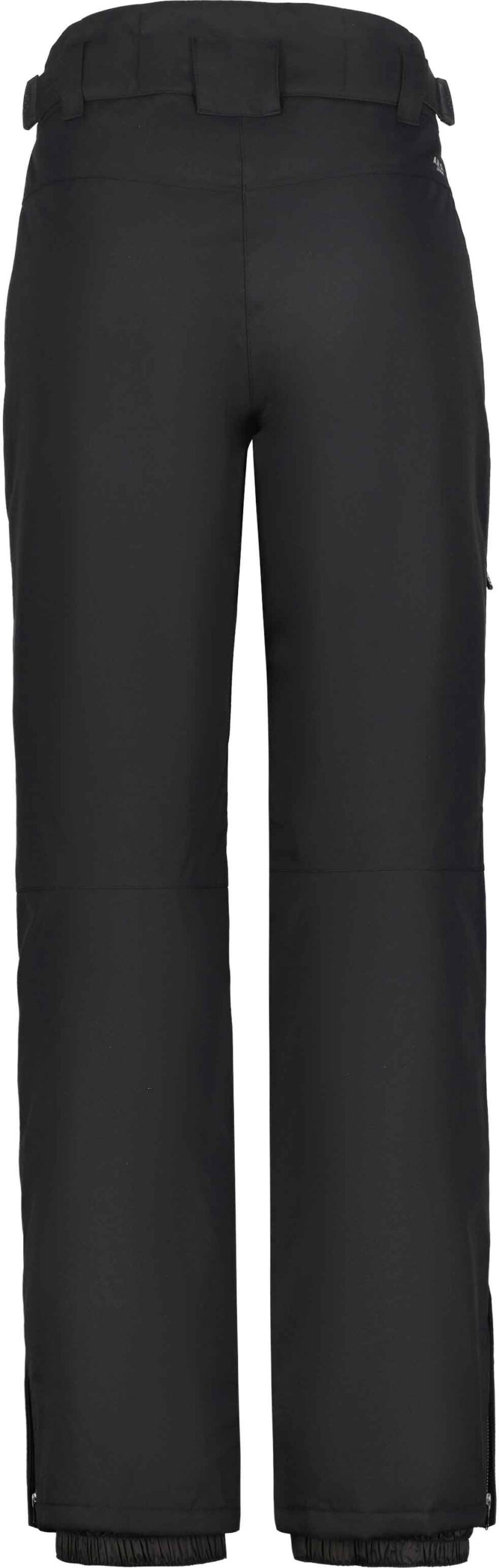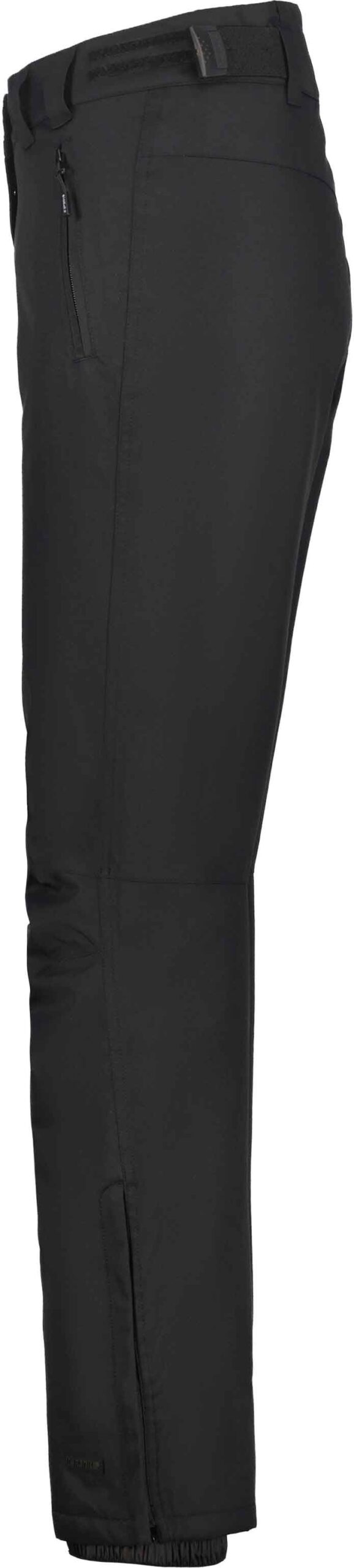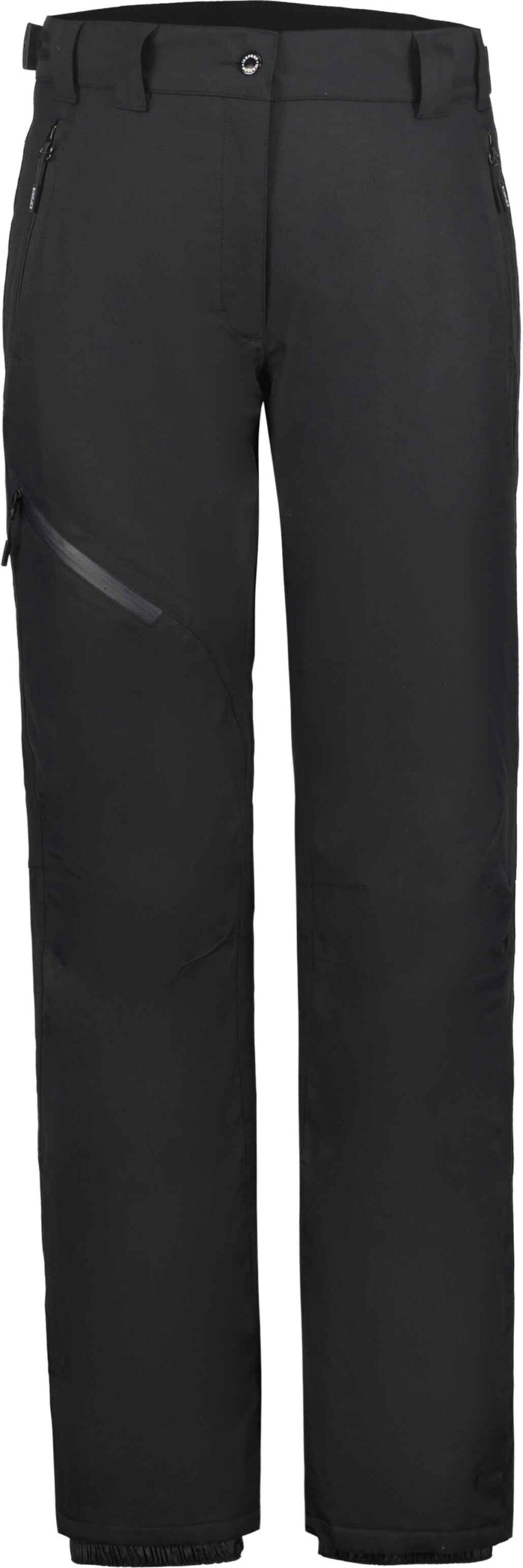 Pantalon de ski/snowboard femme Curlew Noir d’Icepeak, 2 couches imperméable et respirant, traitement déperlant sans PFC, coutures étanches, taille réglable et guêtres pare-neige pour chaleur et liberté de mouvement sur piste.