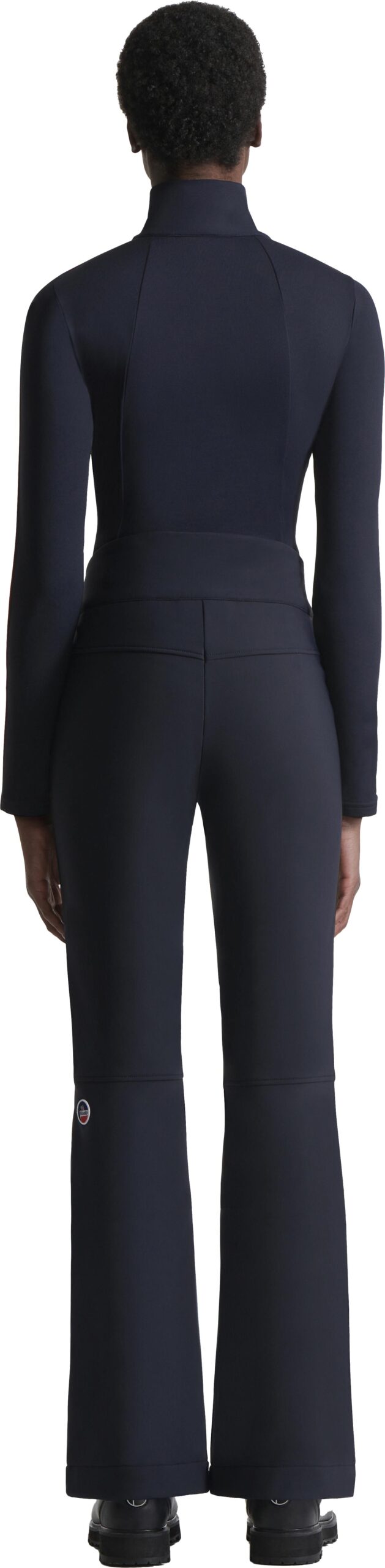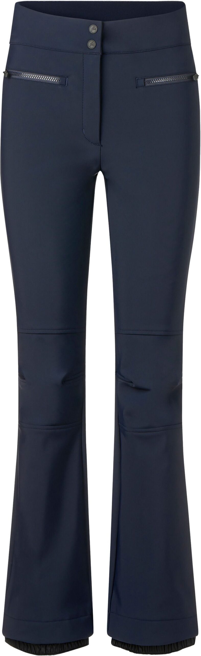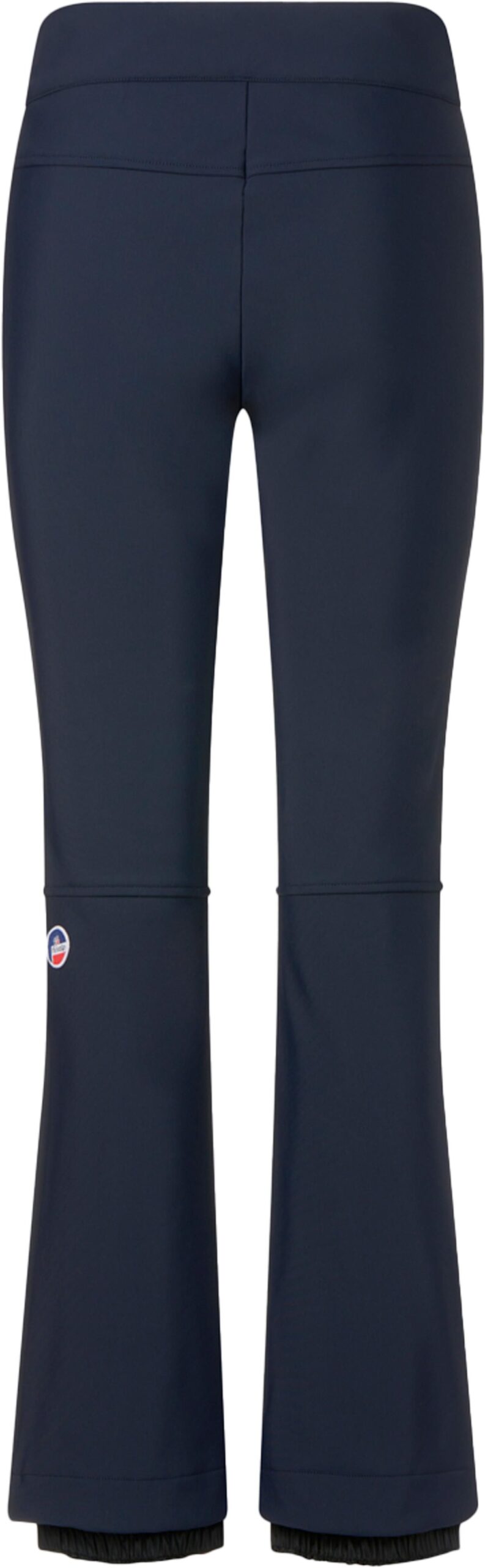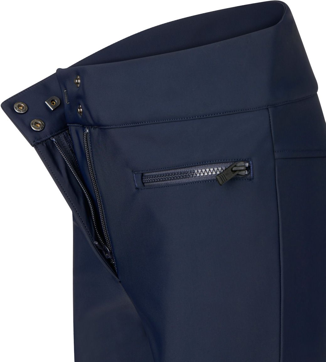 Pantalon de ski Fusalp Diana Dark Blue pour femme, coupe fuseau en softshell coupe-vent extensible, imperméable, chaud avec intérieur polaire, genoux préformés, poches zippées et guêtres pare-neige.