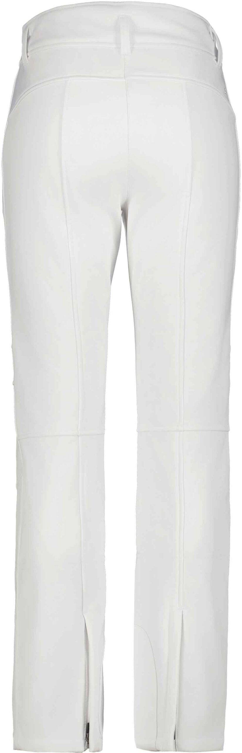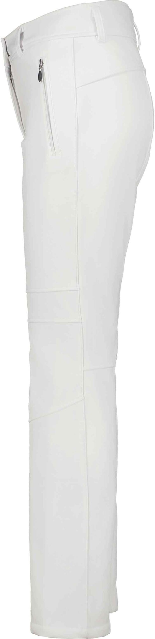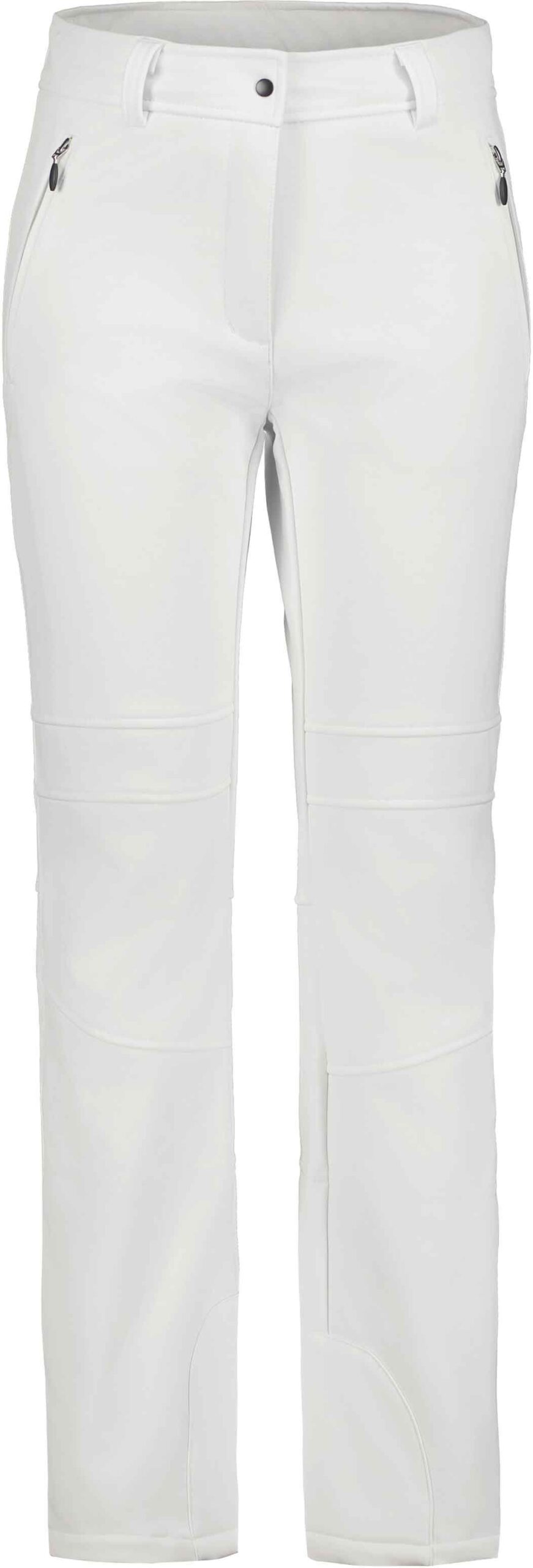 Pantalon de ski femme Entiat Blanc Optique d’Icepeak en softshell déperlant, coupe-vent et respirant, doublé polaire pour la chaleur, coupe ajustée 4 directions et guêtres pare-neige intégrées.