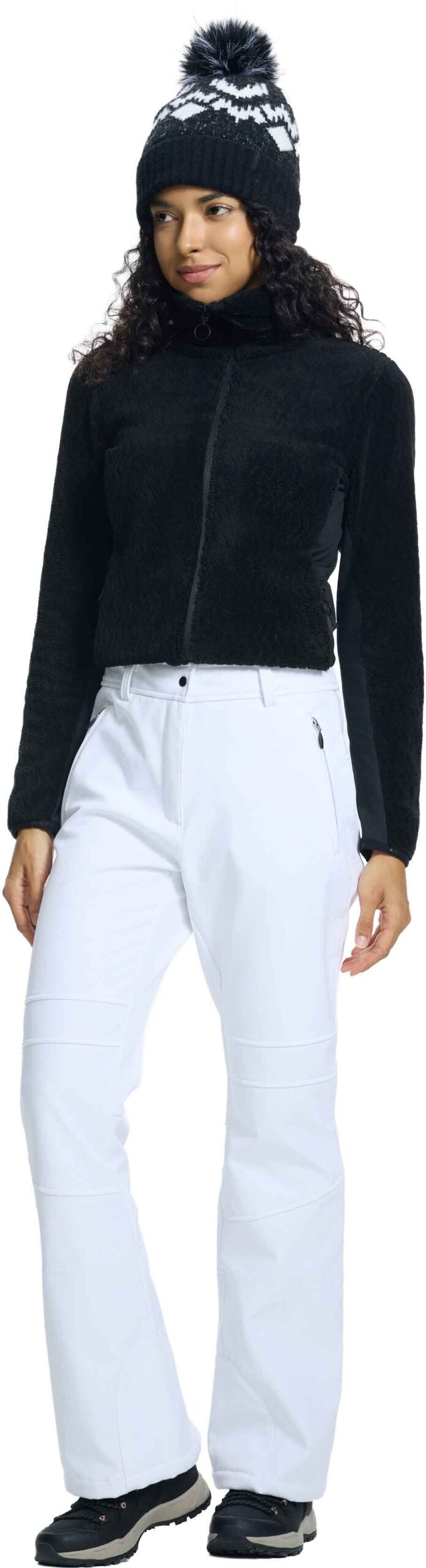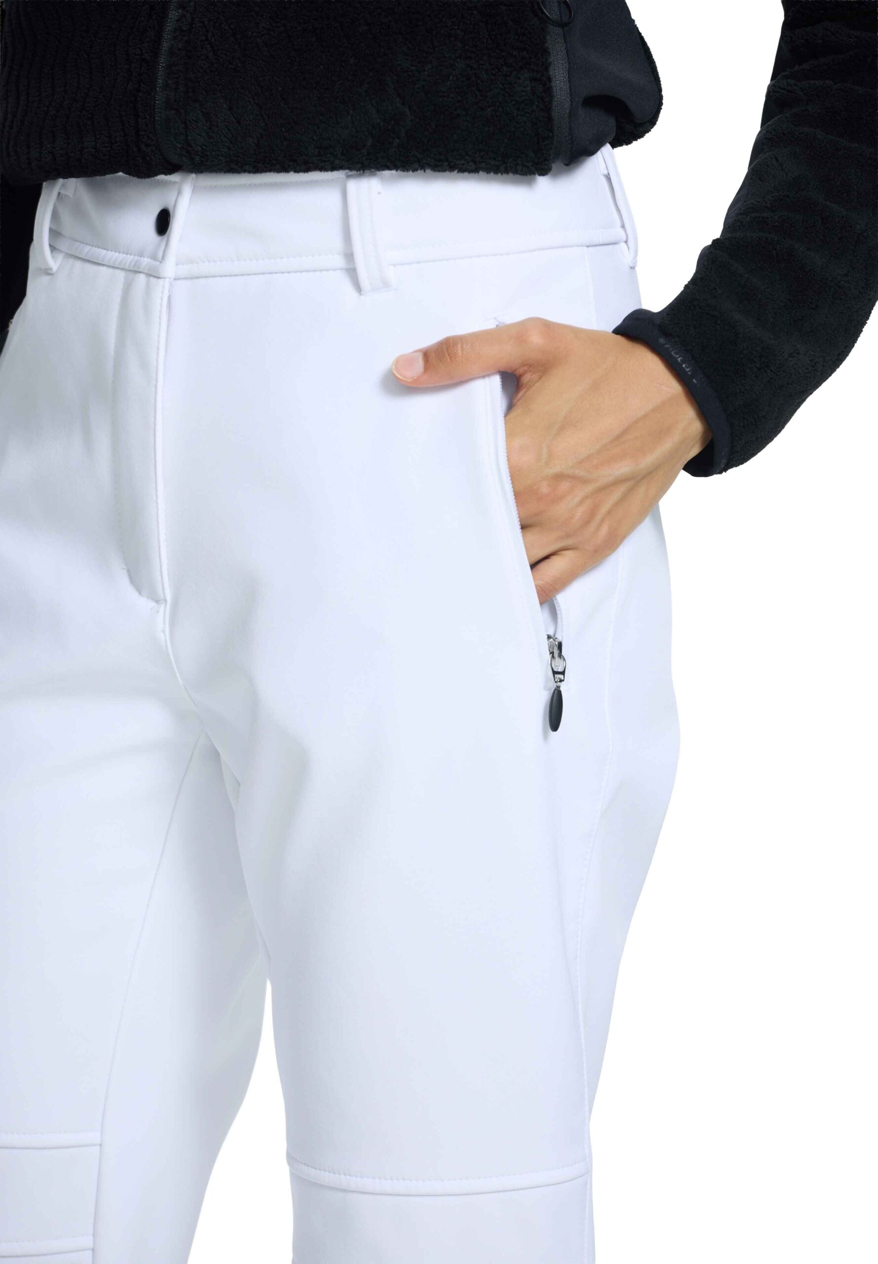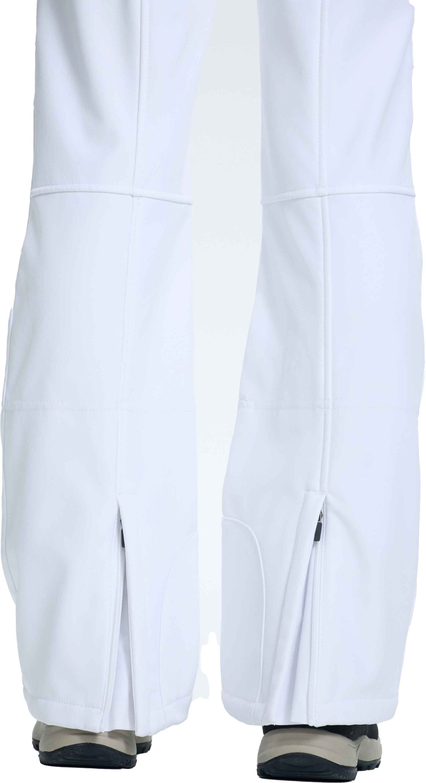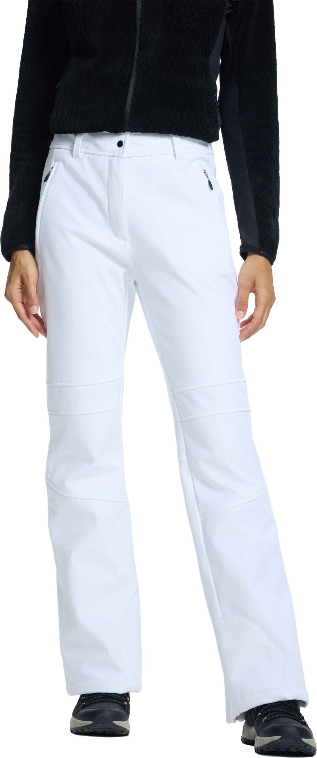 Pantalon de ski femme Entiat Blanc Optique d’Icepeak en softshell déperlant, coupe-vent et respirant, doublé polaire pour la chaleur, coupe ajustée 4 directions et guêtres pare-neige intégrées.