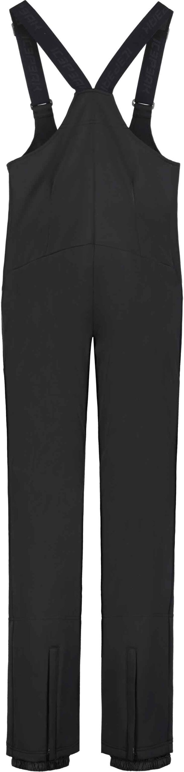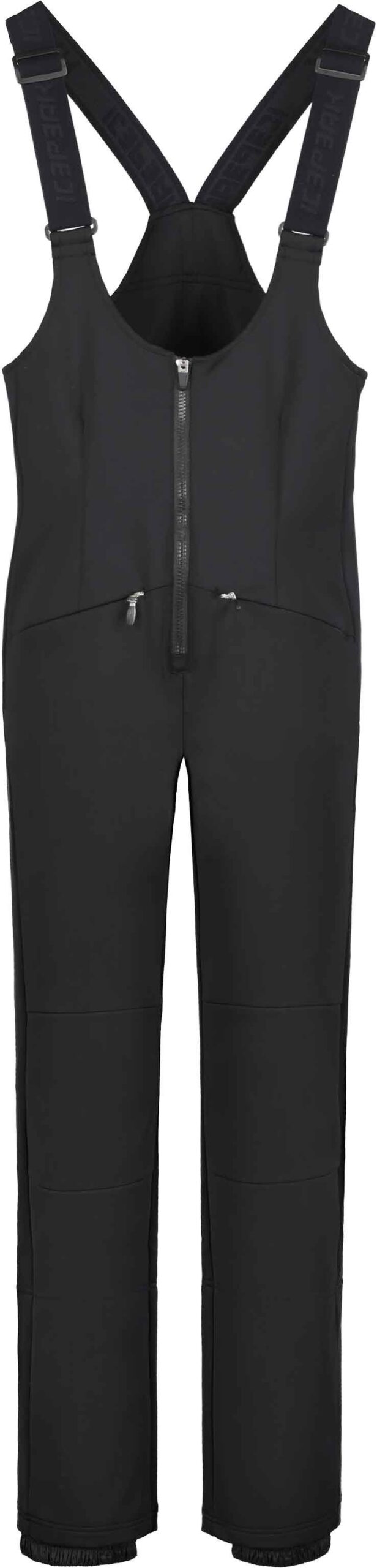 Salopette de ski/snowboard femme Icepeak Exira Noir, 2 couches imperméable et respirante avec traitement déperlant sans PFC, doublure polaire, coupe ajustée extensible, bretelles et guêtres réglables pour chaleur et liberté de mouvement sur piste.