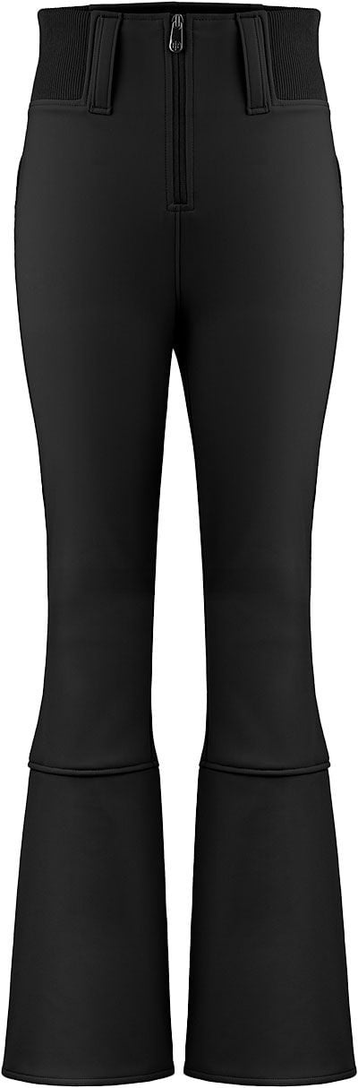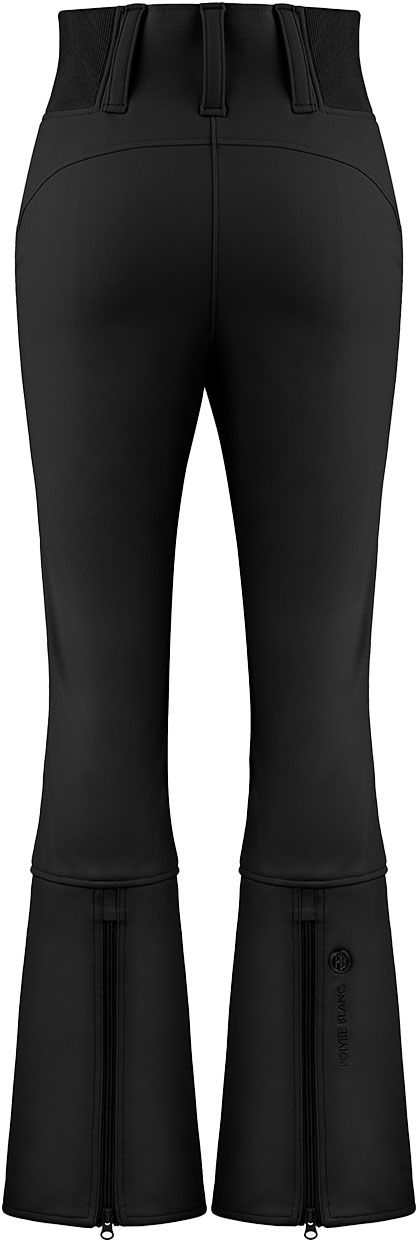Poivre Blanc Glory Softshell Pants est un pantalon de ski stretch noir pour femme, coupe ajustée en softshell 4 sens imperméable et respirant, isolant 190 g sur les jambes, taille haute, genoux préformés et guêtres pare-neige intégrées.