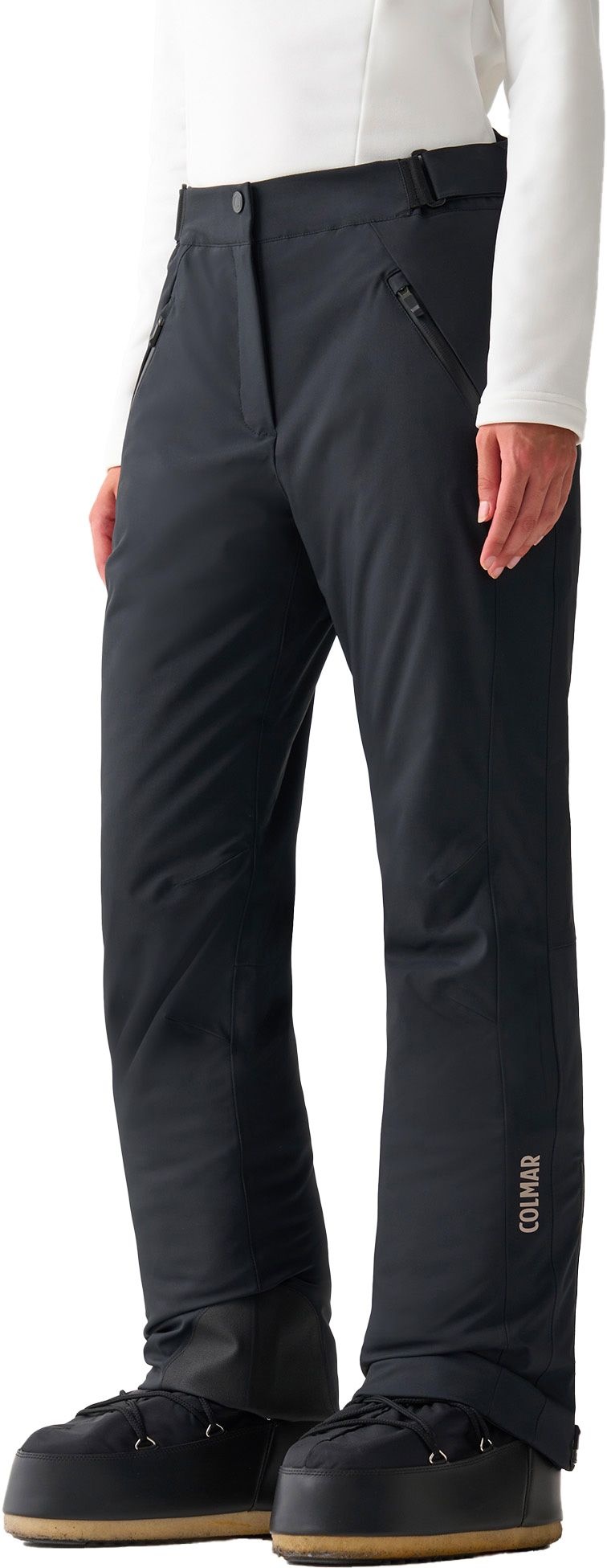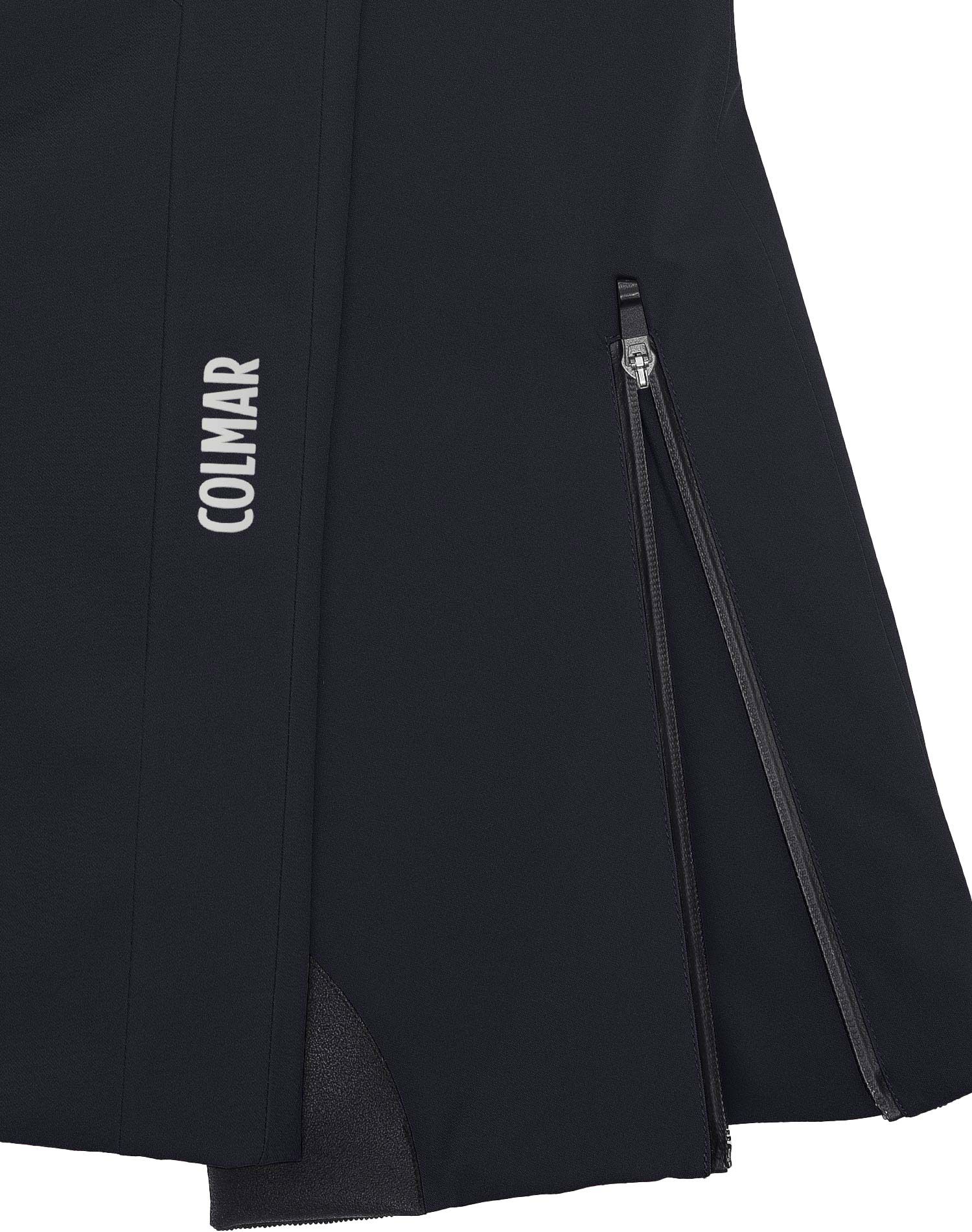 Colmar Ladies Ski Pants Black : pantalon de ski femme en polyester 100 % recyclé stretch, imperméable et respirant, avec doublure chaude, dos ergonomique, guêtre pare-neige et genoux préformés pour un confort optimal sur les pistes.