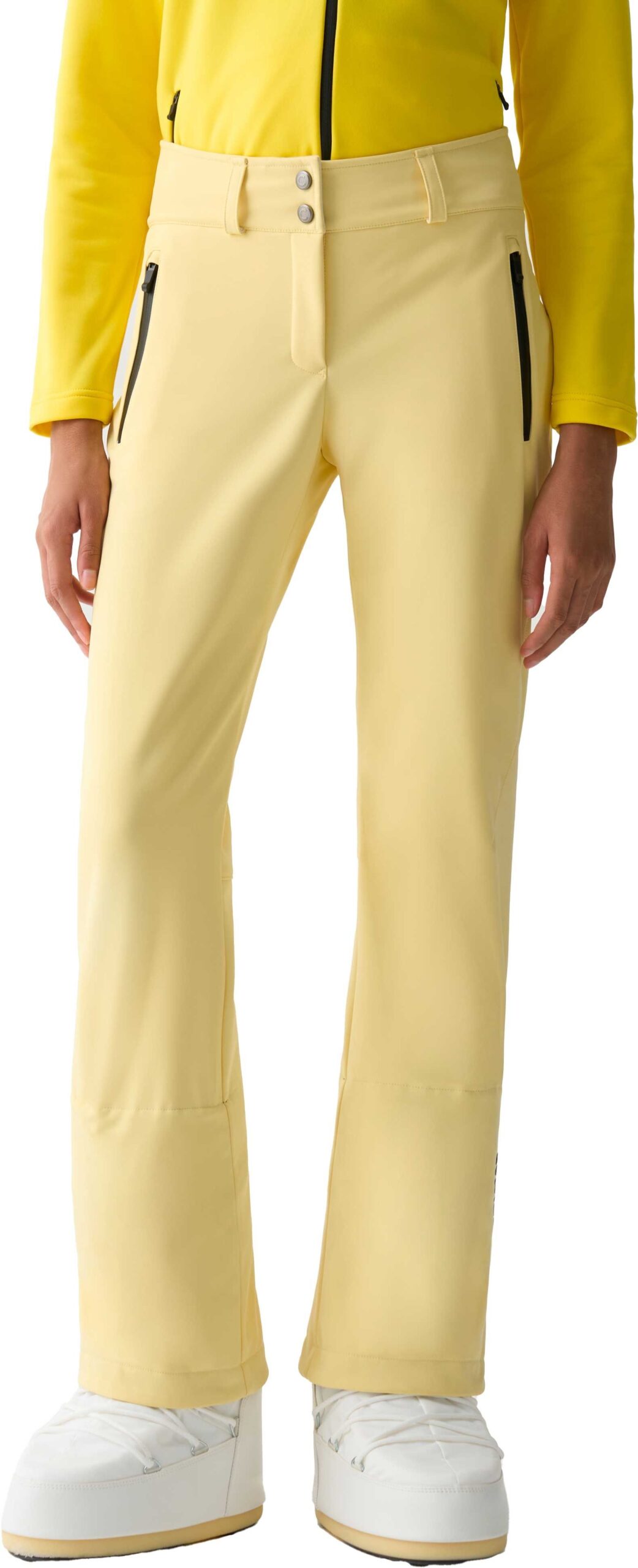 Pantalon de ski Colmar Ladies Ski Pants Vanilla pour femme en softshell stretch respirant et imperméable, coupe ergonomique, genoux préformés, dos polaire et guêtre intégré.