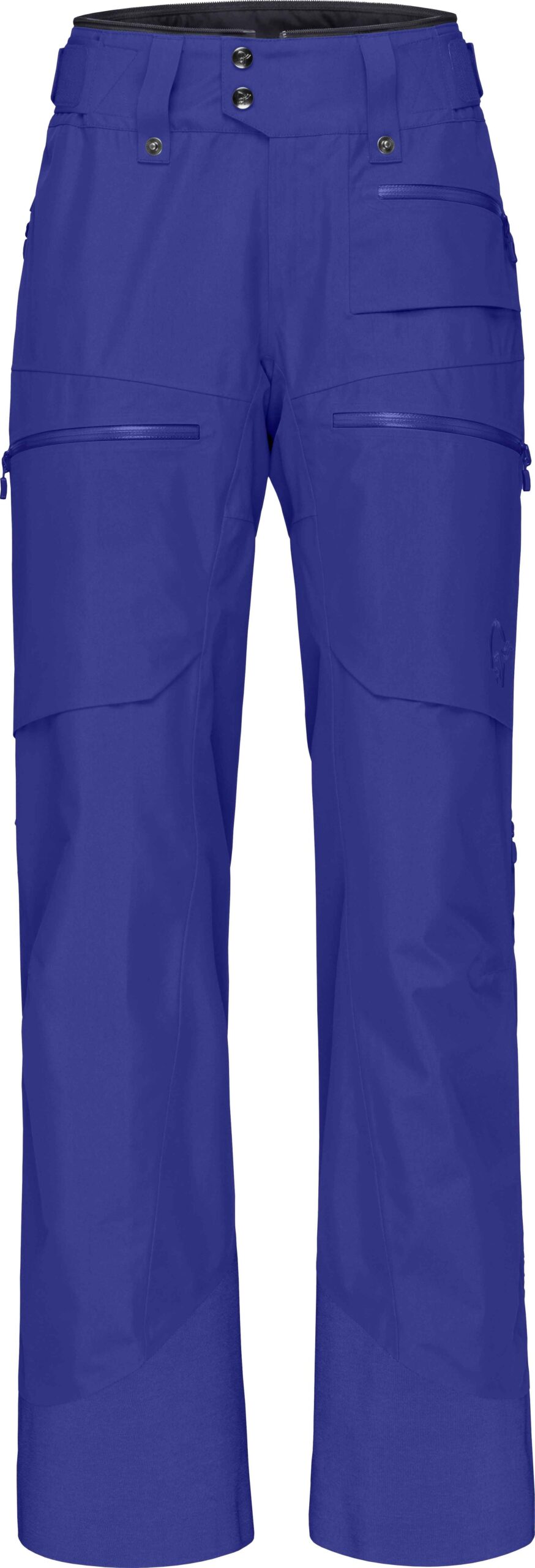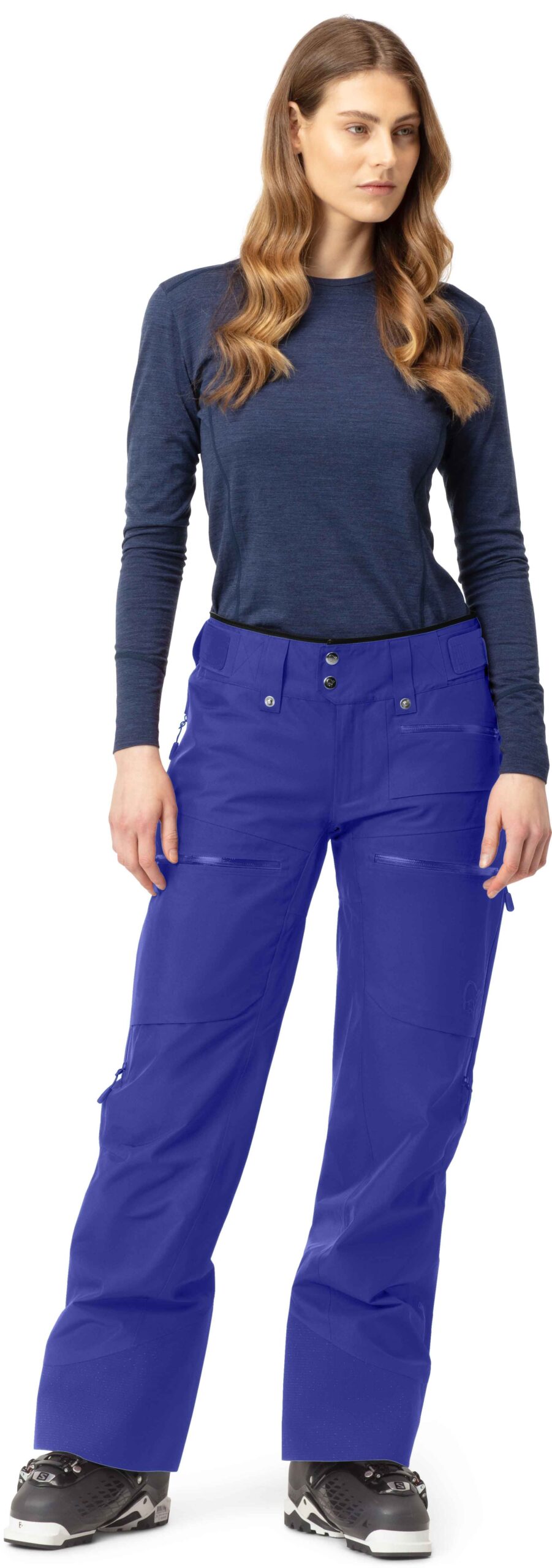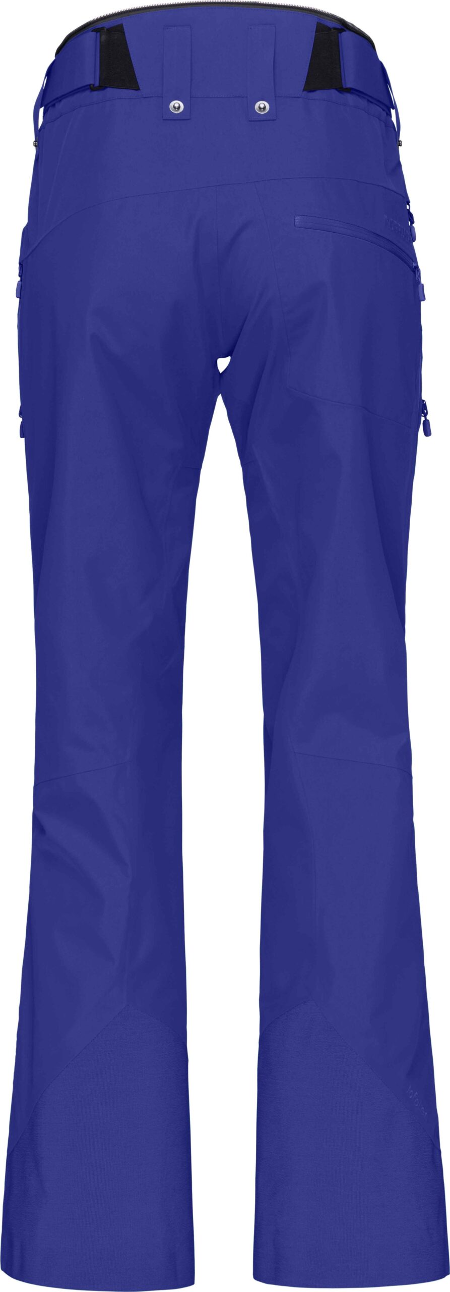 Pantalon de ski femme Norrona Lofoten Gore-Tex Insulated Royal Blue : membrane GORE-TEX 2L, isolation Thermo40 recyclée ciblée, taille réglable et renforts bas de jambes pour protection hivernale et liberté de mouvement.