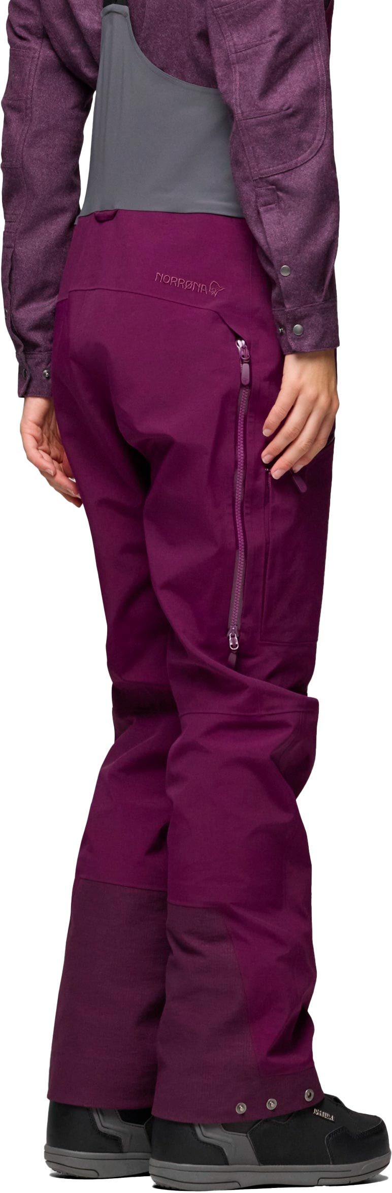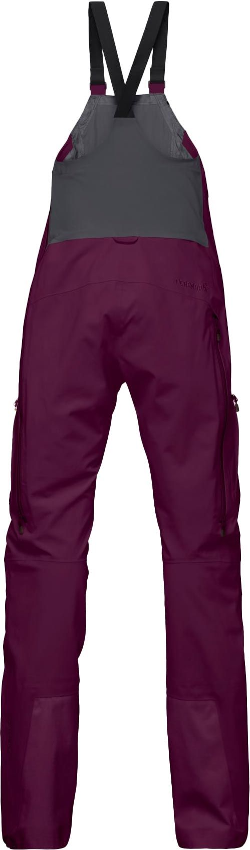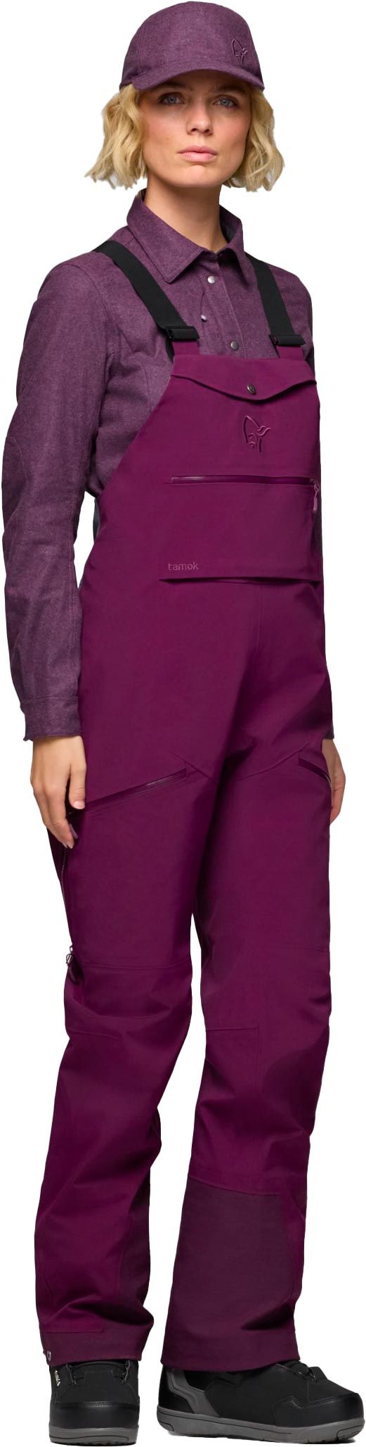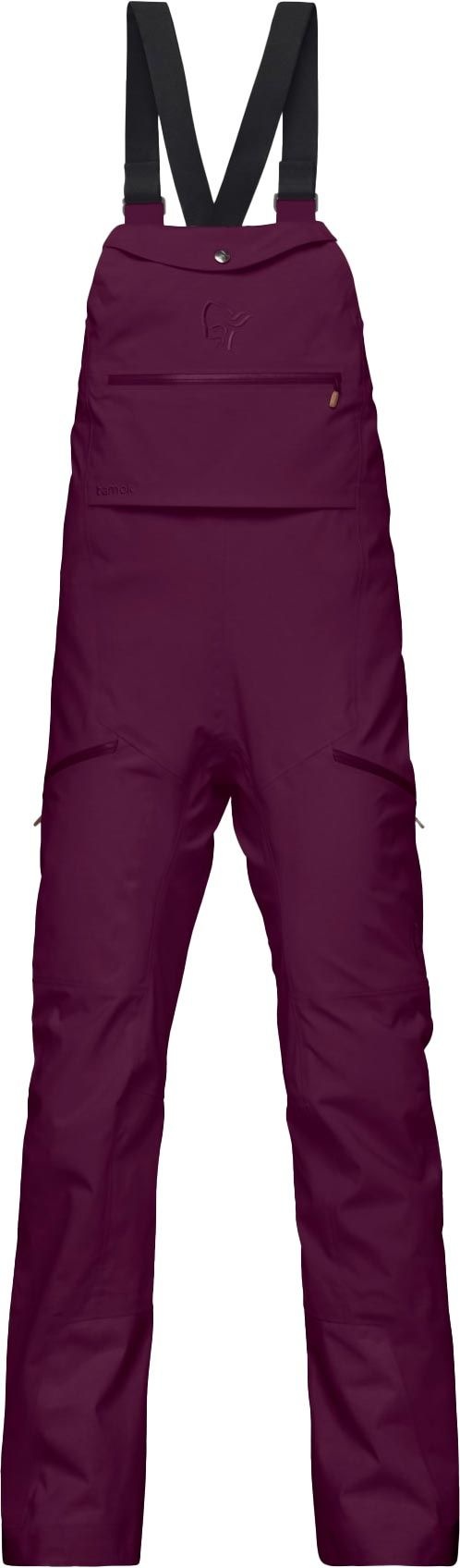 Salopette ski femme Norrona Tamok Gore-Tex Performance Shell Bib Winter Bloom, membrane 3 couches imper-respirante et coupe-vent, ventilations ciblées, bretelles réglables, dos stretch, renforts jambes.